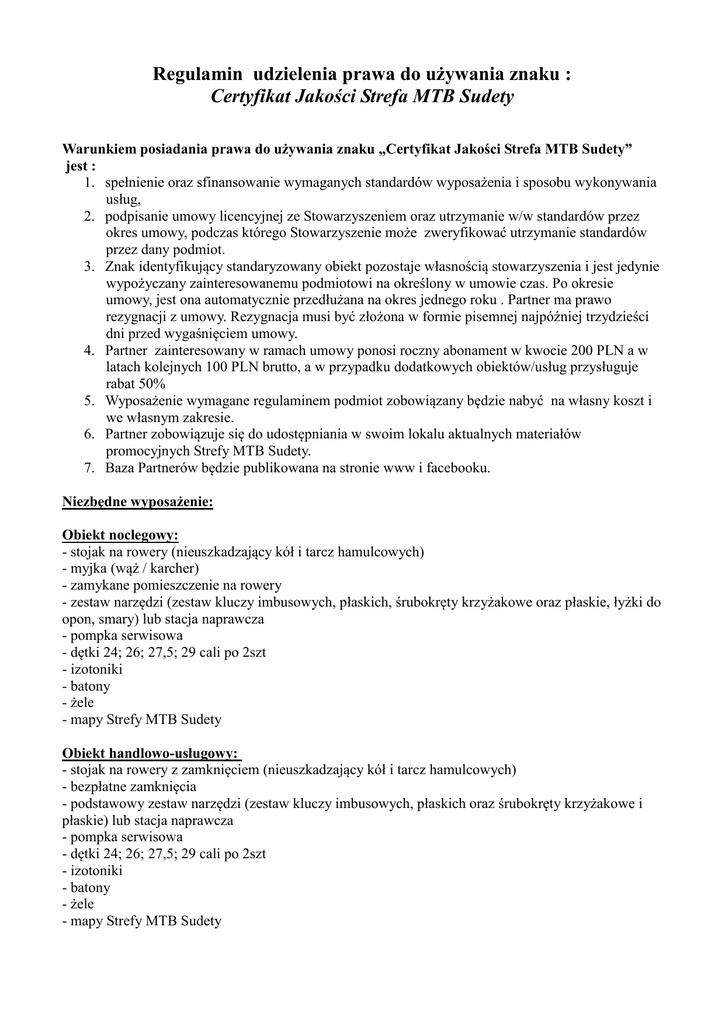 Regulamin udzielenia prawa do używania znaku : Certyfikat Jakości Strefa MTB Sudety Warunkiem posiadania prawa do używania znaku „Certyfikat Jakości Strefa MTB Sudety” jest : 1. spełnienie oraz sfinansowanie wymaganych standardów wyposażenia i sposobu wykonywania usług, 2. podpisanie umowy licencyjnej ze Stowarzyszeniem oraz utrzymanie w/w standardów przez okres umowy, podczas którego Stowarzyszenie może zweryfikować utrzymanie standardów przez dany podmiot. 3. Znak identyfikujący standaryzowany obiekt pozostaje własnością stowarzyszenia i jest jedynie wypożyczany zainteresowanemu podmiotowi na określony w umowie czas. Po okresie umowy, jest ona automatycznie przedłużana na okres jednego roku . Partner ma prawo rezygnacji z umowy. Rezygnacja musi być złożona w formie pisemnej najpóźniej trzydzieści dni przed wygaśnięciem umowy. 4. Partner zainteresowany w ramach umowy ponosi roczny abonament w kwocie 200 PLN a w latach kolejnych 100 PLN brutto, a w przypadku dodatkowych obiektów/usług przysługuje rabat 50% 5. Wyposażenie wymagane regulaminem podmiot zobowiązany będzie nabyć na własny koszt i we własnym zakresie. 6. Partner zobowiązuje się do udostępniania w swoim lokalu aktualnych materiałów promocyjnych Strefy MTB Sudety. 7. Baza Partnerów będzie publikowana na stronie www i facebooku. Niezbędne wyposażenie: Obiekt noclegowy: - stojak na rowery (nieuszkadzający kół i tarcz hamulcowych) - myjka (wąż / karcher) - zamykane pomieszczenie na rowery - zestaw narzędzi (zestaw kluczy imbusowych, płaskich, śrubokręty krzyżakowe oraz płaskie, łyżki do opon, smary) lub stacja naprawcza - pompka serwisowa - dętki 24; 26; 27,5; 29 cali po 2szt - izotoniki - batony - żele - mapy Strefy MTB Sudety Obiekt handlowo-usługowy: - stojak na rowery z zamknięciem (nieuszkadzający kół i tarcz hamulcowych) - bezpłatne zamknięcia - podstawowy zestaw narzędzi (zestaw kluczy imbusowych, płaskich oraz śrubokręty krzyżakowe i płaskie) lub stacja naprawcza - pompka serwisowa - dętki 24; 26; 27,5; 29 cali po 2szt - izotoniki - batony - żele - mapy Strefy MTB Sudety Firma Transportowa: - bagażnik na rowery lub możliwość bezpiecznego przewiezienia roweru wewnątrz auta (np. bus) - mapy Strefy MTB Sudety - gwarancja zamówienia (umowa na dowóz i odbiór rowerzysty w określonych wcześniej punktach)