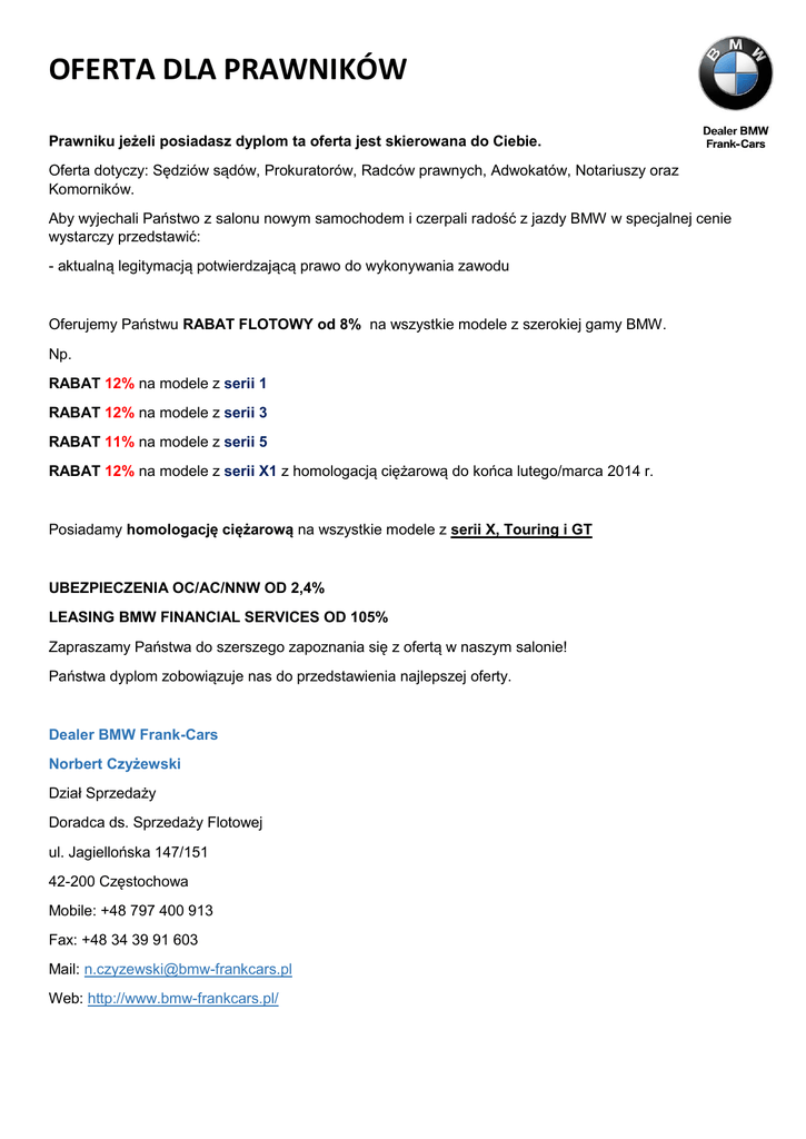 OFERTA DLA PRAWNIKÓW Prawniku jeżeli posiadasz dyplom ta oferta jest skierowana do Ciebie. Oferta dotyczy: Sędziów sądów, Prokuratorów, Radców prawnych, Adwokatów, Notariuszy oraz Komorników. Aby wyjechali Państwo z salonu nowym samochodem i czerpali radość z jazdy BMW w specjalnej cenie wystarczy przedstawić: - aktualną legitymacją potwierdzającą prawo do wykonywania zawodu Oferujemy Państwu RABAT FLOTOWY od 8% na wszystkie modele z szerokiej gamy BMW. Np. RABAT 12% na modele z serii 1 RABAT 12% na modele z serii 3 RABAT 11% na modele z serii 5 RABAT 12% na modele z serii X1 z homologacją ciężarową do końca lutego/marca 2014 r. Posiadamy homologację ciężarową na wszystkie modele z serii X, Touring i GT UBEZPIECZENIA OC/AC/NNW OD 2,4% LEASING BMW FINANCIAL SERVICES OD 105% Zapraszamy Państwa do szerszego zapoznania się z ofertą w naszym salonie! Państwa dyplom zobowiązuje nas do przedstawienia najlepszej oferty. Dealer BMW Frank-Cars Norbert Czyżewski Dział Sprzedaży Doradca ds. Sprzedaży Flotowej ul. Jagiellońska 147/151 42-200 Częstochowa Mobile: +48 797 400 913 Fax: +48 34 39 91 603 Mail: [email protected] Web: http://www.bmw-frankcars.pl/