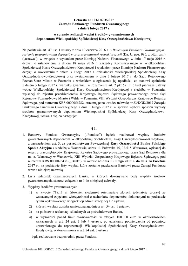 Uchwała nr 101/DGD/2017 Zarządu Bankowego Funduszu Gwarancyjnego z dnia 8 lutego 2017 r. w sprawie realizacji wypłat środków gwarantowanych deponentom Wielkopolskiej Spółdzielczej Kasy Oszczędnościowo-Kredytowej Na podstawie art. 47 ust. 1 ustawy z dnia 10 czerwca 2016 r. o Bankowym Funduszu Gwarancyjnym, systemie gwarantowania depozytów oraz przymusowej restrukturyzacji (Dz. U. poz. 996, z późn. zm.) („ustawa”), w związku z wydaniem przez Komisję Nadzoru Finansowego w dniu 17 maja 2016 r. decyzji o ustanowieniu z dniem 18 maja 2016 r. Zarządcy Komisarycznego w Wielkopolskiej Spółdzielczej Kasie Oszczędnościowo-Kredytowej i wydaniem przez Komisję Nadzoru Finansowego decyzji o zawieszeniu z dniem 3 lutego 2017 r. działalności Wielkopolskiej Spółdzielczej Kasy Oszczędnościowo-Kredytowej oraz wystąpieniem w dniu 3 lutego 2017 r. do Sądu Rejonowego Poznań-Stare Miasto w Poznaniu z wnioskiem o ogłoszenie jej upadłości, co stanowi spełnienie z dniem 3 lutego 2017 r. warunku gwarancji w rozumieniu art. 2 pkt 57 lit. c tiret pierwsze ustawy wobec Wielkopolskiej Spółdzielczej Kasy Oszczędnościowo-Kredytowej z siedzibą w Poznaniu, wpisanej do rejestru przedsiębiorców Krajowego Rejestru Sądowego prowadzonego przez Sąd Rejonowy Poznań-Nowe Miasto i Wilda w Poznaniu, VIII Wydział Gospodarczy Krajowego Rejestru Sądowego, pod numerem KRS 0000056282, oraz mając na uwadze uchwałę nr 83/DGD/2017 Zarządu Bankowego Funduszu Gwarancyjnego z dnia 3 lutego 2017 r. w sprawie wyboru sposobu wypłaty środków gwarantowanych deponentom Wielkopolskiej Spółdzielczej Kasy OszczędnościowoKredytowej, uchwala się, co następuje: § 1. 1. Bankowy Fundusz Gwarancyjny (,,Fundusz”) będzie realizował wypłaty środków gwarantowanych deponentom Wielkopolskiej Spółdzielczej Kasy Oszczędnościowo-Kredytowej, z zastrzeżeniem ust. 3, za pośrednictwem Powszechnej Kasy Oszczędności Banku Polskiego Spółka Akcyjna z siedzibą w Warszawie, adres: ul. Puławska 15, 02-515 Warszawa, wpisanej do rejestru przedsiębiorców Krajowego Rejestru Sądowego prowadzonego przez Sąd Rejonowy dla m. st. Warszawy w Warszawie, XIII Wydział Gospodarczy Krajowego Rejestru Sądowego, pod numerem KRS 0000026438 (,,Bank”), w okresie od dnia 13 lutego 2017 r. do dnia 14 kwietnia 2017 r., na podstawie listy wypłat, która zostanie przekazana Bankowi przez Zarząd Funduszu wraz z niniejszą uchwałą. 2. Lista jednostek organizacyjnych Banku, w których dokonywane będą wypłaty środków gwarantowanych, stanowi załącznik nr 1 do niniejszej uchwały. 3. Wypłaty środków gwarantowanych: 1) w kwocie 718,11 zł (słownie: siedemset osiemnaście złotych jedenaście groszy) ze wskazanymi zajęciami wierzytelności z rachunków deponentów, dokonanymi na podstawie tytułu wykonawczego w egzekucji administracyjnej lub sądowej, 2) których wypłata została zawieszona zgodnie z art. 54 ust. 1 ustawy, 3) na podstawie reklamacji składanych za pośrednictwem Banku, 4) w wysokości ponad limit równowartości w złotych 100.000 euro w okolicznościach wskazanych w art. 24 ust. 3 lub 4 ustawy, po uzyskaniu potwierdzenia od podmiotu uprawnionego do reprezentacji Wielkopolskiej Spółdzielczej Kasy OszczędnościowoKredytowej, o którym mowa w art. 24 ust. 5 ustawy – będą realizowane bezpośrednio przez Fundusz. 1/2 Uchwała nr 101/DGD/2017 Zarządu Bankowego Funduszu Gwarancyjnego z dnia 8 lutego 2017 r. 4. Po upływie okresu, w którym wypłaty środków gwarantowanych realizowane będą za pośrednictwem Banku, wypłaty środków gwarantowanych dokonywane będą bezpośrednio przez Fundusz w okresie 5 lat od dnia spełnienia warunku gwarancji. § 2. 1. Zasady i sposób dokonywania przez Bank wypłat środków gwarantowanych określa Regulamin wypłat środków gwarantowanych deponentom Wielkopolskiej Spółdzielczej Kasy Oszczędnościowo-Kredytowej realizowanych za pośrednictwem Powszechnej Kasy Oszczędności Banku Polskiego S.A., stanowiący załącznik nr 2 do niniejszej uchwały. 2. Zasady i sposób dokonywania przez Fundusz wypłat środków gwarantowanych, w przypadkach, o których mowa w § 1 ust. 3 i 4, określa Regulamin wypłat środków gwarantowanych deponentom Wielkopolskiej Spółdzielczej Kasy Oszczędnościowo-Kredytowej dokonywanych przez Bankowy Fundusz Gwarancyjny, stanowiący załącznik nr 3 do niniejszej uchwały. 3. Tożsamość deponenta weryfikowana jest przez Bank lub Fundusz na zasadach określonych w art. 46 i art. 22 ust. 2 ustawy. § 3. Kwota stanowiąca sumę środków gwarantowanych przekazywana Bankowi na wypłaty środków gwarantowanych wynosi 284.202.999,70 zł (słownie: dwieście osiemdziesiąt cztery miliony dwieście dwa tysiące dziewięćset dziewięćdziesiąt dziewięć złotych siedemdziesiąt groszy). § 4. 1. Łączna liczba deponentów Wielkopolskiej Spółdzielczej Kasy Oszczędnościowo-Kredytowej uprawnionych do otrzymania wypłat wynosi 39.575 osób. 2. Łączna kwota środków gwarantowanych na wypłaty dla deponentów Wielkopolskiej Spółdzielczej Kasy Oszczędnościowo-Kredytowej wynosi 284.203.717,81 zł (słownie: dwieście osiemdziesiąt cztery miliony dwieście trzy tysiące siedemset siedemnaście złotych osiemdziesiąt jeden groszy). § 5. Uchwała wchodzi w życie z dniem podjęcia. Zarząd Bankowego Funduszu Gwarancyjnego /-/ 2/2 Uchwała nr 101/DGD/2017 Zarządu Bankowego Funduszu Gwarancyjnego z dnia 8 lutego 2017 r.