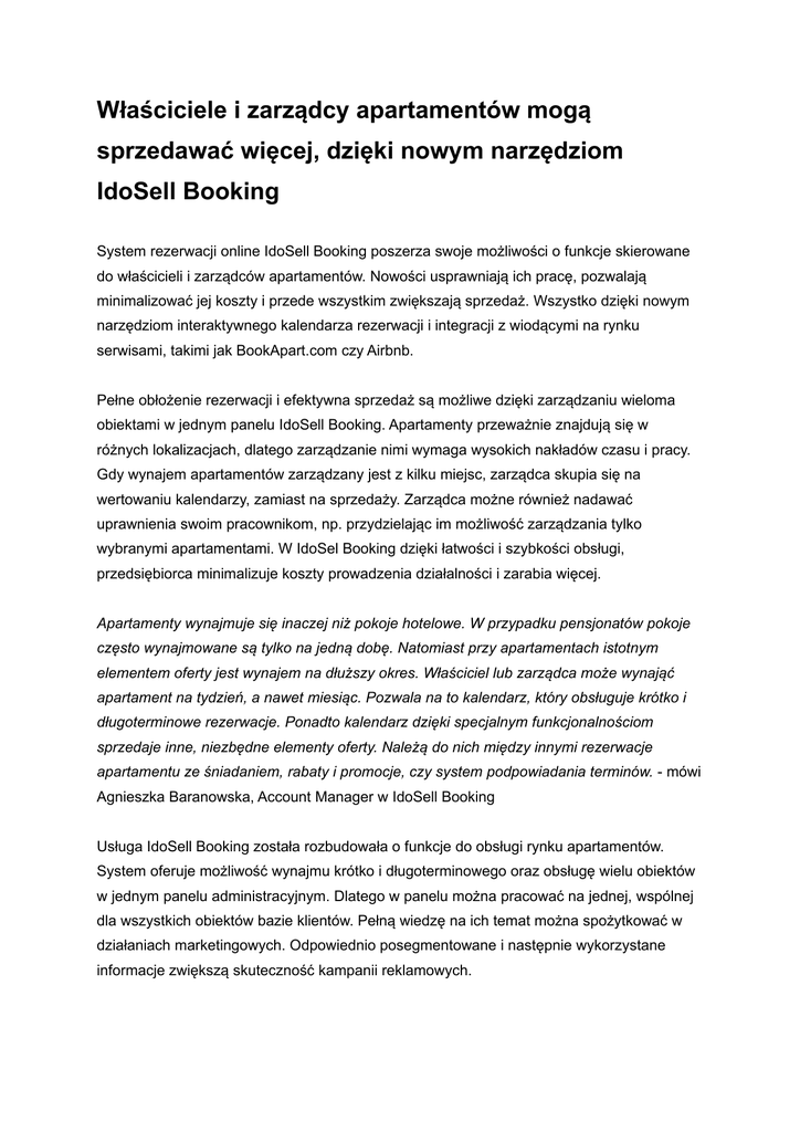 Właściciele i zarządcy apartamentów mogą sprzedawać więcej, dzięki nowym narzędziom IdoSell Booking System rezerwacji online IdoSell Booking poszerza swoje możliwości o funkcje skierowane do właścicieli i zarządców apartamentów. Nowości usprawniają ich pracę, pozwalają minimalizować jej koszty i przede wszystkim zwiększają sprzedaż. Wszystko dzięki nowym narzędziom interaktywnego kalendarza rezerwacji i integracji z wiodącymi na rynku serwisami, takimi jak BookApart.com czy Airbnb. Pełne obłożenie rezerwacji i efektywna sprzedaż są możliwe dzięki zarządzaniu wieloma obiektami w jednym panelu IdoSell Booking. Apartamenty przeważnie znajdują się w różnych lokalizacjach, dlatego zarządzanie nimi wymaga wysokich nakładów czasu i pracy. Gdy wynajem apartamentów zarządzany jest z kilku miejsc, zarządca skupia się na wertowaniu kalendarzy, zamiast na sprzedaży. Zarządca możne również nadawać uprawnienia swoim pracownikom, np. przydzielając im możliwość zarządzania tylko wybranymi apartamentami. W IdoSel Booking dzięki łatwości i szybkości obsługi, przedsiębiorca minimalizuje koszty prowadzenia działalności i zarabia więcej. Apartamenty wynajmuje się inaczej niż pokoje hotelowe. W przypadku pensjonatów pokoje często wynajmowane są tylko na jedną dobę. Natomiast przy apartamentach istotnym elementem oferty jest wynajem na dłuższy okres. Właściciel lub zarządca może wynająć apartament na tydzień, a nawet miesiąc. Pozwala na to kalendarz, który obsługuje krótko i długoterminowe rezerwacje. Ponadto kalendarz dzięki specjalnym funkcjonalnościom sprzedaje inne, niezbędne elementy oferty. Należą do nich między innymi rezerwacje apartamentu ze śniadaniem, rabaty i promocje, czy system podpowiadania terminów. - mówi Agnieszka Baranowska, Account Manager w IdoSell Booking Usługa IdoSell Booking została rozbudowała o funkcje do obsługi rynku apartamentów. System oferuje możliwość wynajmu krótko i długoterminowego oraz obsługę wielu obiektów w jednym panelu administracyjnym. Dlatego w panelu można pracować na jednej, wspólnej dla wszystkich obiektów bazie klientów. Pełną wiedzę na ich temat można spożytkować w działaniach marketingowych. Odpowiednio posegmentowane i następnie wykorzystane informacje zwiększą skuteczność kampanii reklamowych. Integracje zapewniają zdobywanie ruchu z najpopularniejszych serwisów branżowych. Należą do nich między innymi BookApart.com, Airbnb, Booking.com, eholiday.pl, HomeAway czy WIMDU. Zarządzanie apartamentem z wykorzystaniem takich narzędzi wpływa na zwiększenie sprzedaży. Duży zasięg dotarcia do potencjalnych klientów znacznie zwiększa obłożenie apartamentów. Tym bardziej, że wynajmujący trafia z reklamą wprost do swojej grupy docelowej. Integracja wyświetla ofertę apartamentu w branżowym serwisie, tj. agregatorze, a rezerwacje przekazywane są do panelu IdoSell Booking. Natomiast oferta znika z agregatora, gdy apartament zostanie zarezerwowany przez kalendarz osadzony na stronie. Jednym z takich agregatorów jest pośrednik w wynajmie apartamentów BookApart.com. Serwis działa międzynarodowo i specjalizuje się w branży wynajmu apartamentów. Jest zoptymalizowany pod kątem użyteczności w kontekście łatwego i sprawnego wyszukiwania apartamentów do wynajęcia. Kolejnym popularnym i skutecznym w sprzedaży agregatorem jest Airbnb. Serwis działa w ponad 190 krajach, 34 000 miastach i od 2008 roku obsłużył ponad 60 milionów gości. Integracja z takimi serwisami pozytywnie stymuluje sprzedaż i zwiększa zyski. Wynajem długoterminowy, obsługa wielu lokalizacji, wspólna baza klientów i integracje to elementy żywego ekosystemu. Są to narzędzia, które działają w synergii, dzięki czemu wynajem apartamentów jest skuteczniejszy. Dzięki pełnej wiedzy o obłożeniu konkretnych obiektów zarządca wie, którą ofertę przedstawić klientowi. W rezultacie ogólna łatwość w zarządzaniu apartamentami przekłada się na większą sprzedaż.