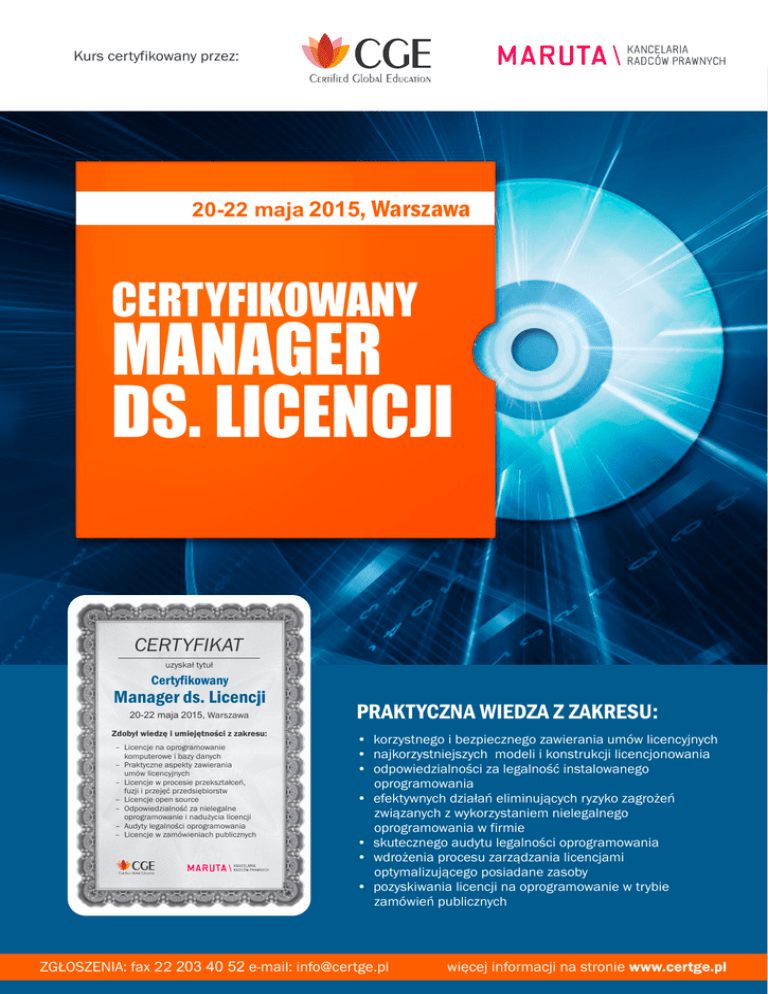 Kurs certyfikowany przez: 20-22 maja 2015, Warszawa CERTYFIKOWANY MANAGER DS. LICENCJI CERTYFIKAT uzyskał tytuł Certyfikowany Manager ds. Licencji 20-22 maja 2015, Warszawa Zdobył wiedzę i umiejętności z zakresu: – Licencje na oprogramowanie komputerowe i bazy danych – Praktyczne aspekty zawierania umów licencyjnych – Licencje w procesie przekształceń, fuzji i przejęć przedsiębiorstw – Licencje open source – Odpowiedzialność za nielegalne oprogramowanie i nadużycia licencji – Audyty legalności oprogramowania – Licencje w zamówieniach publicznych PRAKTYCZNA WIEDZA Z ZAKRESU: • korzystnego i bezpiecznego zawierania umów licencyjnych • najkorzystniejszych modeli i konstrukcji licencjonowania • odpowiedzialności za legalność instalowanego oprogramowania • efektywnych działań eliminujących ryzyko zagrożeń związanych z wykorzystaniem nielegalnego oprogramowania w firmie • skutecznego audytu legalności oprogramowania • wdrożenia procesu zarządzania licencjami optymalizującego posiadane zasoby • pozyskiwania licencji na oprogramowanie w trybie zamówień publicznych ZGŁOSZENIA: fax 22 203 40 52 e-mail: [email protected] więcej informacji na stronie www.certge.pl 20-22 maja 2015, Warszawa Szanowni Państwo, CERTYFIKOWANY MANAGER DS. LICENCJI W dniach 20-22 maja 2015 r. w Warszawie zorganizowany zostanie kurs „Certyfikowany Manager ds. Licencji”, którego Partnerem certyfikującym jest Kancelaria Maruta i Wspólnicy. Serdecznie zapraszamy do udziału w tym bardzo praktycznym szkoleniu, podczas którego uczestnicy dostaną odpowiedzi na pytania: jak ustrzec się przed konsekwencjami prawnymi, efektywniej zarządzać zakupami licencji i nie generować zbędnych kosztów, a przy tym mieć jasny obraz posiadanych stanów licencyjnych? W czasie zajęć dowiedzą się Państwo jak bezpiecznie i korzystnie zawierać umowy licencyjne, do jakiego korzystania z systemów informatycznych i baz danych uprawniają takie licencje oraz jakie modele i konstrukcje licencjonowania są najkorzystniejsze dla Państwa firm. Podczas kursu przeanalizują Państwo klauzule umów licencyjnych, ich skutki prawne i faktyczne, w tym klauzule ograniczające odpowiedzialność dostawców oprogramowania, w kontekście odpowiedzialności za usterki, gwarancji i szkód spowodowanych błędnym działaniem oprogramowania. Nie zabraknie tematu licencji open source i możliwości wykorzystywania takiego oprogramowania we własnych rozwiązaniach informatycznych. Certified Global Education Sp. z o.o. jest firmą szkoleniową od kilku lat obecną na polskim rynku kładącą nacisk na edukację biznesową popartą certyfikatami. Dąży do tego by być platformą szkoleniową udostępniającą klientom najwyższej jakości certyfikowane szkolenia ze wszystkich dziedzin zarówno w rozumieniu funkcjonalnym biorąc pod uwagę funkcje/działy w organizacji jak i branżowym uwzględniając specyfikę poszczególnych sektorów gospodarczych. Naszym celem nadrzędnym jest spełnianie potrzeb biznesowych naszych klientów poprzez realizację szkoleń o najwyższych standardach jakości bazujących na międzynarodowym know-how w zakresie edukacji biznesowej. Wszystkie budowane przez nas programy przygotowywane są w oparciu o szczegółowe badania rynku i analizowane są pod kątem ich praktycznej przydatności w biznesie. Trenerzy i prelegenci, których zapraszamy wywodzą się przede wszystkim ze środowisk biznesowych, nie brakuje wśród nich również prawników, autorytetów naukowych jak i przedstawicieli administracji publicznej. SZKOLENIE ZAMKNIĘTE W przypadku zainteresowania tym szkoleniem większej liczby osób z Państwa organizacji z przyjemnością przygotujemy je dla Państwa w wersji szkolenia zamkniętego. Prosimy o kontakt z kierownikiem projektu Anną Milewską e-mail: [email protected] Serdecznie zapraszamy! ZGŁOSZENIA: fax 22 203 40 52 e-mail: [email protected] Jedną z najistotniejszych części kursu będą praktyczne zajęcia z zakresu odpowiedzialności za wykorzystywanie nielegalnego oprogramowania i nadużywanie licencji. Dowiedzą się Państwo m.in.: kto ponosi odpowiedzialność za legalność instalowanego oprogramowania? Jakie działania powinien podejmować manager ds. licencji w celu eliminacji zagrożenia związanego z wykorzystaniem nielegalnego oprogramowania w przedsiębiorstwie? Jak manager ds. licencji może ograniczyć odpowiedzialność za wykorzystanie nielegalnego oprogramowania w przedsiębiorstwie? Jak zarządzać dokumentacją związaną z wykorzystaniem oprogramowania w przedsiębiorstwie czyli „co powinienem posiadać w celu wykazania legalności oprogramowania”? Ostatni dzień kursu poświęcony będzie praktyce zarządzania licencjami w firmie. Uczestnicy dowiedzą się co powinno leżeć w gestii i kompetencjach osób odpowiedzialnych za zarządzanie licencjami, kiedy i jakie audyty legalności prowadzić, jak współpracować w tym zakresie z firmami zewnętrznymi. Poznacie Państwo metody prowadzenia audytów, unikania w nich błędów i wyciągania wniosków z ich wyników. Kurs uzupełniony będzie o zagadnienia licencji na systemy informatyczne w procesie zamówień publicznych. Z poważaniem, Anna Milewska Kierownik projektu KONTAKT Anna Milewska Kierownik projektu e-mail: [email protected] tel: 604 152 181 fax: 22 203 40 52 więcej informacji na stronie www.certge.pl CERTYFIKOWANY MANAGER DS. LICENCJI 20-22 maja 2015, Warszawa PROGRAM DZIEŃ I – 20 maja 2015, (9.00 – 17.00) DOBRA PRAWNIE CHRONIONE W DZIAŁALNOŚCI IT • programy komputerowe • bazy danych • inne LICENCJE W PROCESIE PRZEKSZTAŁCEŃ, FUZJI I PRZEJĘĆ PRZEDSIĘBIORSTW • zasady przenoszenie licencji na inny podmiot • licencje w procesie zbycia przedsiębiorstwa • licencje w procesie fuzji i przejęć • licencje w procesie przekształceń spółek handlowych ZAWIERANIE UMÓW LICENCYJNYCH • nabycie nośnika z oprogramowaniem - „licencja 