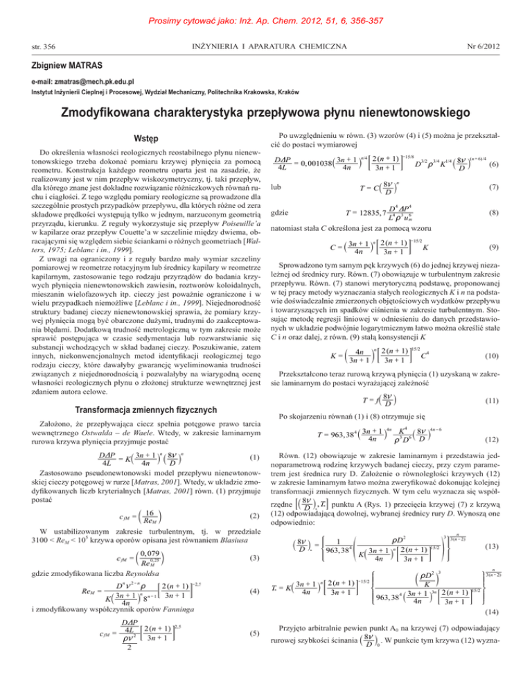 Prosimy cytować jako: Inż. Ap. Chem. 2012, 51, 6, 356-357 INŻYNIERIA I APARATURA CHEMICZNA str. 356 Nr 6/2012 Zbigniew MATRAS e-mail: [email protected] Instytut Inżynierii Cieplnej i Procesowej, Wydział Mechaniczny, Politechnika Krakowska, Kraków Zmodyfikowana charakterystyka przepływowa płynu nienewtonowskiego Wstęp Do określenia własności reologicznych reostabilnego płynu nienewtonowskiego trzeba dokonać pomiaru krzywej płynięcia za pomocą reometru. Konstrukcja każdego reometru oparta jest na zasadzie, że realizowany jest w nim przepływ wiskozymetryczny, tj. taki przepływ, dla którego znane jest dokładne rozwiązanie różniczkowych równań ruchu i ciągłości. Z tego względu pomiary reologiczne są prowadzone dla szczególnie prostych przypadków przepływu, dla których różne od zera składowe prędkości występują tylko w jednym, narzuconym geometrią przyrządu, kierunku. Z reguły wykorzystuje się przepływ Poiseuille’a w kapilarze oraz przepływ Couette’a w szczelinie między dwiema, obracającymi się względem siebie ściankami o różnych geometriach [Walters, 1975; Leblanc i in., 1999]. Z uwagi na ograniczony i z reguły bardzo mały wymiar szczeliny pomiarowej w reometrze rotacyjnym lub średnicy kapilary w reometrze kapilarnym, zastosowanie tego rodzaju przyrządów do badania krzywych płynięcia nienewtonowskich zawiesin, roztworów koloidalnych, mieszanin wielofazowych itp. cieczy jest poważnie ograniczone i w wielu przypadkach niemożliwe [Leblanc i in., 1999]. Niejednorodność struktury badanej cieczy nienewtonowskiej sprawia, że pomiary krzywej płynięcia mogą być obarczone dużymi, trudnymi do zaakceptowania błędami. Dodatkową trudność metrologiczną w tym zakresie może sprawić postępująca w czasie sedymentacja lub rozwarstwianie się substancji wchodzących w skład badanej cieczy. Poszukiwanie, zatem innych, niekonwencjonalnych metod identyfikacji reologicznej tego rodzaju cieczy, które dawałyby gwarancję wyeliminowania trudności związanych z niejednorodnością i pozwalałyby na wiarygodną ocenę własności reologicznych płynu o złożonej strukturze wewnętrznej jest zdaniem autora celowe. Transformacja zmiennych fizycznych Założono, że przepływająca ciecz spełnia potęgowe prawo tarcia wewnętrznego Ostwalda – de Waele. Wtedy, w zakresie laminarnym rurowa krzywa płynięcia przyjmuje postać DDP = ` 3n + 1 jn ` 8o jn (1) K 4L 4n D Zastosowano pseudonewtonowski model przepływu nienewtonowskiej cieczy potęgowej w rurze [Matras, 2001]. Wtedy, w układzie zmodyfikowanych liczb kryterialnych [Matras, 2001] równ. (1) przyjmuje postać 16 m (2) c fM = c ReM W ustabilizowanym zakresie turbulentnym, tj. w przedziale 5 3100 < ReM < 10 krzywa oporów opisana jest równaniem Blasiusa 0, 079 c fM = c 0, 25 m Re M gdzie zmodyfikowana liczba Reynoldsa n 2-n D o t 2 (n + 1) -2, 5 E ; n 3n + 1 j n - 1 3n + 1 K` 8 4n i zmodyfikowany współczynnik oporów Fanninga ReM = c fM (3) DDP 2 (n + 1) 2, 5 E = 4L2 ; 3n + 1 to 2 (4) (5) Po uwzględnieniu w równ. (3) wzorów (4) i (5) można je przekształcić do postaci wymiarowej DDP = 3n + 1 jn/4 ; 2 (n + 1) E 0, 001038 ` 4L 4n 3n + 1 -15/8 T = C` lub D3/2 t3/4 K1/4 ` 8o j(n + 6)/4 (6) D 8o jn D (7) 4 4 D DP 4 3 6 L t um natomiast stała C określona jest za pomocą wzoru gdzie T = 12835, 7 C =` 3n + 1 jn ; 2 (n + 1) E 4n 3n + 1 (8) -15/2 (9) K Sprowadzono tym samym pęk krzywych (6) do jednej krzywej niezależnej od średnicy rury. Równ. (7) obowiązuje w turbulentnym zakresie przepływu. Równ. (7) stanowi merytoryczną podstawę, proponowanej w tej pracy metody wyznaczania stałych reologicznych K i n na podstawie doświadczalnie zmierzonych objętościowych wydatków przepływu i towarzyszących im spadków ciśnienia w zakresie turbulentnym. Stosując metodę regresji liniowej w odniesieniu do danych przedstawionych w układzie podwójnie logarytmicznym łatwo można określić stałe C i n oraz dalej, z równ. (9) stałą konsystencji K K=c 4n n ; 2 ( n + 1) E m 3n + 1 3n + 1 15/2 C 4 (10) Przekształcono teraz rurową krzywą płynięcia (1) uzyskaną w zakresie laminarnym do postaci wyrażającej zależność T = f` 8o j D (11) Po skojarzeniu równań (1) i (8) otrzymuje się T = 963, 38 4 ` 3n + 1 j4n K 4 ` 8o j4n - 6 3 6 4n t D D (12) Równ. (12) obowiązuje w zakresie laminarnym i przedstawia jednoparametrową rodzinę krzywych badanej cieczy, przy czym parametrem jest średnica rury D. Założenie o równoległości krzywych (12) w zakresie laminarnym łatwo można zweryfikować dokonując kolejnej transformacji zmiennych fizycznych. W tym celu wyznacza się współ8o rzędne 8` D j), T) B punktu A (Rys. 1) przecięcia krzywej (7) z krzywą (12) odpowiadającą dowolnej, wybranej średnicy rury D. Wynoszą one odpowiednio: 2 1 ` 8o j = D ) * 963, 38 4 f T) = K ` 3 n 3 (n - 2 ) tD n 2 (n + 1) 15/2 p 4 + 3n 1 j ; E K` 4n 3n + 1 3n + 1 jn ; 2 (n + 1) E 4n 3n + 1 -15/2 (13) Z _ 3 (nn- 2) 2 3 tD m ]] b c b K [ ` 15 2 / 3n 2 (n + 1) + ]] 963, 38 4 ` 3n 1 j ; E b b 4n 3n + 1 \ a (14) Przyjęto arbitralnie pewien punkt A0 na krzywej (7) odpowiadający 8o rurowej szybkości ścinania ` j . W punkcie tym krzywa (12) wyznaD 0 Prosimy cytować jako: Inż. Ap. Chem. 2012, 51, 6, 356-357 INŻYNIERIA I APARATURA CHEMICZNA Nr 6/2012 str. 357 Rys. 1. Schemat transformacji zmiennych fizycznych Rys. 2. Zmodyfikowana charakterystyka przepływowa 0,3% roztworu HPMC czona za pomocą rury o średnicy D0 przecina krzywą (7). Niech wartość tej współrzędnej ` 8o j = 2100 s-1. Wtedy, zgodnie D 0 metylocelulozy (HPMC) w rurach i kapilarach o różnych średnicach wewnętrznych przedstawiono na rys. 2. Badania wykonano za pomocą reometru kapilarno-rurowego własnej konstrukcji [Matras, 2003]. Punkty doświadczalne uzyskane w wyniku pomiarów układają się wzdłuż krzywych (16) lub (19) wskazując zakres przepływu bez konieczności uprzedniego obliczania wartości liczb Reyn
