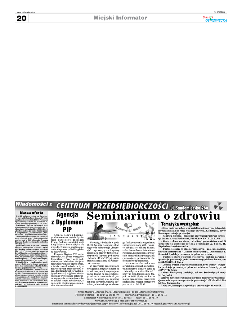 www.ostrowiecka.pl Nr 13(2763) 20 Nasza oferta A R L ogłasza zapisy na dw udnio wy kurs „Obsługa kasy fiskalnej”, który odbędzie się w kwietniu 2008 r. Formularz zgłoszeniowy na www.arl.ostrowiec.pl. Więcej informacji pod nr tel. 41 249 50 01; Gminne Centrum Informacji ogłasza zapisy na następujące bezpłatne kursy: „Podstawy obsługi pakietu MS Office”; „Profesjonalizacja umiejętności pracy z komputerem”, „Asertywność”, „ABC Internetu i projektowania stron www”, „Obsługa urządzeń biurowych” oraz warsztat „Szukam pracy”. Dodatkowe informacje w pok. nr 7 i 9 w budynku Centrum Biurowo- Konferencyjnego lub pod nr tel. 41 249 58 77; M ło d zie ż owe C ent r u m K a r ier y zaprasza na bezpłatne szkolenia: „Dziesięć kroków początkującego przedsiębiorcy”, „Przygotowanie do rozmow y kwalifikacyjnej, dokumenty aplikacyjne”, „Rozwijanie umiejętności komunikacji, autoprezentacja”, „Sposoby poszukiwania pracy”, „Jak być asertywnym”. Informacje pod nr tel. 41 265 13 30; Studio Figury i Urody nawiąże współpracę z kobietami wolnymi zawodowo, które chcą realizować się w Klubie Kobiet. Informacje pod nr tel. 501 644 889; Firma f inansowo- ubezpieczeniowa prowadzi rekrutację na stanowisko doradca finansowy (3 osoby). Oferuje bezpłatne przygotowanie do zawodu, wysokie wynagrodzenie. Od kandydatów oczekuje wykształcenia min. średniego, niekaralności, wieku 23-55 lat, kreatywności. Kontakt: Centrum Biurowo- Konferencyjne, pok. nr 5 i 34 (II piętro) w godz. 10- 14 lub tel. 601 164 233. Miejski Informator Agencja z Dyplomem PIP Agencja Rozwoju Lokalnego uhonorowana została Dyplomem P a ń st wowej I n sp ekc ji Pracy. Podczas ostatniej sesji Rady Miasta, która odbyła się w środę, 19 marca, wyróżnienie odebrała prezes spółki Magdalena Salwerowicz. Program Dyplom PIP organizowany jest przez Okręgowe Inspektoraty Pracy. Jego podstawowym założeniem jest promowanie przepisów prawa pracy, a tak że samokontrola w tym zakresie przez pracodawców. W przedsiębiorstwach przystępujących do akcji najpierw identyfikowano występujące potencjalne zagrożenia, następnie oceniano stopień ryzyka zawodowego, a następnie eliminowano ewentualne nieprawidłowości. Seminarium o zdrowiu Tematyka wystąpień: W sobotę, 5 kwietnia w godz. 16- 20 Agencja Rozwoju Lokalnego oraz restauracja „Impresja” zapraszają na imprezę promującą zdrowy tryb życia i aktywność fizyczną pod nazwą „Zdrowie i Uroda”. Po jej zakończeniu zapraszamy na wieczorek taneczny. W programie przewidziano wystąpienia między innymi na temat: motywacji do podejmowania działań na rzecz własnego zdrowia, znaczenia aktywności ruchowej dla popraw y kondycji fizycznej, wpływu sposobu żywienia dla prawidłowe- go funkcjonowania organizmu, zbawiennej mocy ziół. Ponadto odbędą się pokazy fitness, tańca break dance, tańca towarzyskiego, kosmetyczne, fryzjerskie, masażu limfatycznego, lekcje makijażu, prezentacja zdobienia metodą decoupage. Na uczestników czeka moc atrakcji i możliwych do wylosowania nagród. Bilety w cenie 12 zł do nabycia w siedzibie ARL przy ul. Sandomierskiej 26a, pok. nr 31/32 (I piętro). Liczba miejsc ograniczona. Serdecznie zapraszamy. Więcej szczegółów pod nr tel. 41 249 50 02. - Stwarzanie warunków oraz kształtowanie motywacji do podejmowania działań na rzecz własnego zdrowia. A. Szałapski, Silver Horse (prezentacja, prelekcja) - Kondycja fizyczna – znaczenie aktywności ruchowej (prelekcja Joanna i Jerzy Pacholczak, FITNESS CENTRUM KLUB) - Wnętrze domu na wiosnę - drobiazgi poprawiające nastrój (prezentacja zdobienia metodą decoupage) A . Budek, H. Wojciechowska- dekoratorka - Dbałość o skórę w okresie wiosennym – zalecane zabiegi, nowinki kosmetyczne – Gabinet kosmetyczny J. Lubieniecka, I. Szurmiak (prelekcja, prezentacja, pokaz warsztatowy) - Dbałość o skórę w okresie wiosennym - makijaż na wiosnę (prelekcja, prezentacja, pokaz warsztatowy); Gabinet kosmetyczny GLAMOUR, J. Gajek - Dbałość o włosy w okresie wiosennym, nowe trendy – fryzjerka (prelekcja, prezentacja, pokaz warsztatowy); Salon fryzjerski „DIVIN” K. Sajda - Masaż limfatyczny (prelekcja, pokaz) - Studio figury i urody M. Przybyłek Zdrowe żywienie oraz jakość żywności dla prawidłowego funkcjonowania organizmu (prelekcja, prezentacja) - W. Gawlik i dietetyk A. Kaczmarska - Moc ziół, homeopatia (prelekcja, prezentacja); W. Gawlik Urząd Miasta w Ostrowcu Św., ul. Głogowskiego 3/5 , 27-400 Ostrowiec Świętokrzyski Telefony: Centrala (+48 41) 26 72 100 do 109 Sekretariat Prezydenta (+48 41) 26 72 115 Sekretariat Wiceprezydentów (+48 41) 26 72 117 Fax (+48 41) 26 72 110 www.um.ostrowiec.pl, e-mail [email protected] Informator samorządowy redagowany jest przez Zespół Prasowo - Informacyjny. tel. (0 41) 26 72 130, [email protected]