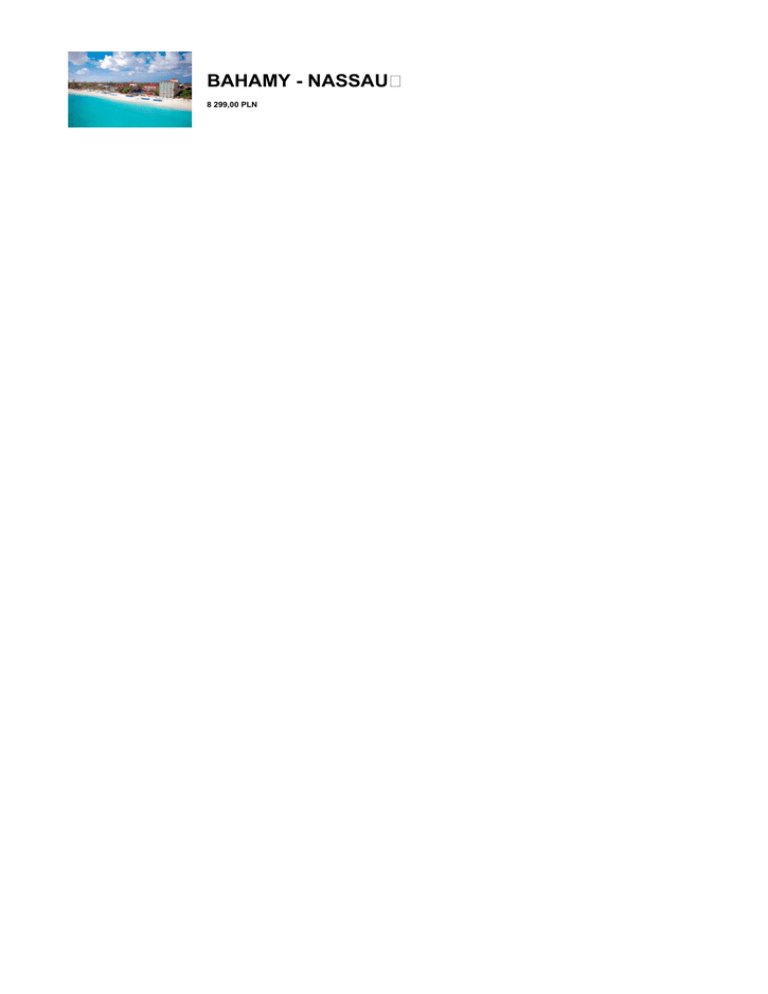 BAHAMY - NASSAU✈ 8 299,00 PLN Hotel Breezes Bahamas położony jest nad brzegiem morza, przy malowniczym odcinku plaży w strefie turystycznej Nassau, w Cable Beach, Komfortowy hotel zlokalizowany jest w cichym i spokojnym zakątku wybrzeża w niewielkiej odległości od lotniska ( ok. 10 km ), centrów handlowych i atrakcji turystycznych. W hotelu znajduje się 391 pokoi, 3 baseny odkryte, restauracje, windy, lobby bar, bar przy basenie, koktajl bar, sejf (płatny), lobby, pralnia/czyszczenie chemiczne (płatne), internet (płatny), internet bezprzewodowy, recepcja 24h, sklep z pamiątkami, sala TV, taras słoneczny, parking, ogród, boisko, night club, udogodnienia dla niepełnosprawnych, pasaż handlowy, jubiler, opieka lekarska (płatna), parasole przy basenie, leżaki przy basenie, ochrona hotelowa (24h), pokoje dla niepełnosprawnych, pokoje dla niepalących, centrum konferencyjne. Pokoje posiadają klimatyzacje indywidualnie sterowaną, telewizje satelitarną, sejf (płatny), telefon (płatny), biurko, taras/balkon, zestaw do parzenia kawy/herbaty (na zamówienie), lodówke (płatna, na zamówienie), radio/muzyka, suszarke do włosów, łazienka z wanną lub prysznicem, internet bezprzewodowy, widok na ogród Plaża przy hotelu, prywatna, piaszczysta, zagospodarowana, szeroka, długa Otoczenie hotelu stanowi tropikalna, karaibska roślinność ciągnąca się wzdłuż pięknej plaży o białym, drobnym piasku obmywanym błękitnymi wodami Oceanu Atlantyckiego. Hotel działa w systemie All Inclusive i zapewnia swoim gościom niezapomniane przeżycia dzięki bogatej ofercie rozrywkowej i szerokiej gamie sportów przy hotelu oraz na plaży. Sport i fitness: koszykówka, tenis ziemny, tenis stołowy, masaże (płatne), jacuzzi, centrum fitness, rowery, bilard, golf (płatny), lekcje tenisa ziemnego. Na plaży nurkowanie (płatne), siatkówka, kajaki, windsurfing, narty wodne, żeglarstwo. Rozrywka: muzyka na żywo, nauka tańca, karaoke, salon gier video (płatny), dyskoteka, program artystyczny. Wyżywienie: pakiet All Inclusive.Zawiera: śniadanie, lunch, i obiadokolacja; w ciągu dnia i wieczorem przekąski w kilku barach, napoje bezalkoholowe i alkohole; bogaty program rozrywkowy; szeroki wybór sportów i atrakcji przy hotelu i na plaży wraz z usługami instruktorów. Dodatkowe informacje Centrum Nassau - 8 km Cable Beach Golf Club - przy hotelu Ardastra Gardens i Zoo - 3 km Straw Market (Shopping Center) - 10.5 km Bacardi Rum Distillery i Hospitality Center - 14 km Informujemy, że wskazane w ofercie godziny funkcjonowania poszczególnych elementów infrastruktury hotelowej (np. godziny serwowania posiłków, otwarcia basenu) mogą ulegać niewielkim zmianom. Zmiany te mogą być powodowane okolicznościami, za które odpowiedzialności nie ponosi, ani hotel, ani organizator turystyki, w tym m. in. sezonowością, warunkami pogodowymi, prośbami Gości lub zdarzeniami o charakterze siły wyższej. Hotel: BREEZES BAHAMAS*** Posiłek: ALL INCLUSIVE Pobyt: 8 DNI Termin: 08.01 - 15.01.2017 Wylot: WARSZAWA - NASSAU