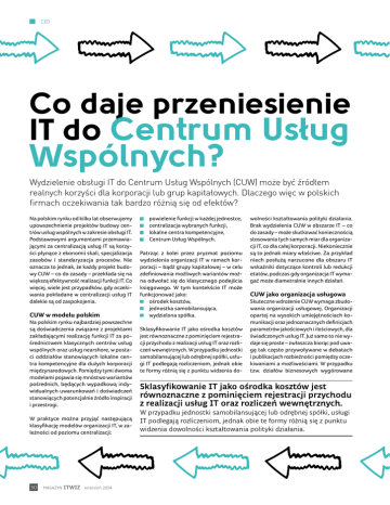 CIO Co daje przeniesienie IT do Centrum Usług Wspólnych? Wydzielenie obsługi IT do Centrum Usług Wspólnych (CUW) może być źródłem realnych korzyści dla korporacji lub grup kapitałowych. Dlaczego więc w polskich firmach oczekiwania tak bardzo różnią się od efektów? Na polskim rynku od kilku lat obserwujemy upowszechnienie projektów budowy centrów usług wspólnych w zakresie obsługi IT. Podstawowymi argumentami przemawiającymi za centralizacją usług IT są korzyści płynące z ekonomii skali, specjalizacja zasobów i standaryzacja procesów. Nie oznacza to jednak, że każdy projekt budowy CUW – co do zasady – przekłada się na większą efektywność realizacji funkcji IT. Co więcej, wiele jest przypadków, gdy oczekiwania pokładane w centralizacji usług IT dalekie są od zaspokojenia. CUW w modelu polskim Na polskim rynku najbardziej powszechne są doświadczenia związane z projektami zakładającymi realizację funkcji IT za pośrednictwem klasycznych centrów usług wspólnych oraz usług nearshore, w postaci oddziałów stanowiących lokalne centra kompetencyjne dla dużych korporacji międzynarodowych. Pomiędzy tymi dwoma modelami pojawia się mnóstwo wariantów pośrednich, będących wypadkową indywidualnych uwarunkowań i doświadczeń stanowiących potencjalnie źródło inspiracji i przestrogi. W praktyce można przyjąć następującą klasyfikację modelów organizacji IT, w zależności od poziomu centralizacji: 30 MAGAZYN ITWIZ wrzesień 2014 powielenie funkcji w każdej jednostce, centralizacja wybranych funkcji, lokalne centra kompetencyjne, Centrum Usług Wspólnych. Patrząc z kolei przez pryzmat poziomu wydzielenia organizacji IT w ramach korporacji – bądź grupy kapitałowej – w celu zdefiniowania możliwych wariantów można odwołać się do klasycznego podejścia księgowego. W tym kontekście IT może funkcjonować jako: ośrodek kosztów, jednostka samobilansująca, wydzielona spółka. Sklasyfikowanie IT jako ośrodka kosztów jest równoznaczne z pominięciem rejestracji przychodu z realizacji usług IT oraz rozliczeń wewnętrznych. W przypadku jednostki samobilansującej lub odrębnej spółki, usługi IT podlegają rozliczeniom, jednak obie te formy różnią się z punktu widzenia do- wolności kształtowania polityki działania. Brak wydzielenia CUW w obszarze IT – co do zasady – może skutkować koniecznością stosowania tych samych miar dla organizacji IT, co dla całej korporacji. Niekoniecznie są to jednak miary właściwe. Za przykład niech posłużą narzucone dla obszaru IT wskaźniki dotyczące kontroli lub redukcji etatów, podczas gdy organizacja IT wymagać może diametralnie innych działań. CUW jako organizacja usługowa Skuteczne wdrożenie CUW wymaga zbudowania organizacji usługowej. Organizacji opartej na wysokich umiejętnościach komunikacji oraz jednoznacznych definicjach parametrów jakościowych i ilościowych, dla świadczonych usług IT. Już samo to nie wydaje się proste – zwłaszcza biorąc pod uwagę tak często przywoływane w debatach i publikacjach rozbieżności pomiędzy oczekiwaniami a możliwościami. W przypadku tzw. działów biznesowych wygórowane Sklasyfikowanie IT jako ośrodka kosztów jest równoznaczne z pominięciem rejestracji przychodu z realizacji usług IT oraz rozliczeń wewnętrznych. W przypadku jednostki samobilansującej lub odrębnej spółki, usługi IT podlegają rozliczeniom, jednak obie te formy różnią się z punktu widzenia dowolności kształtowania polityki działania. CIO Brak rozliczania usług IT pomiędzy obsługiwanymi jednostkami organizacyjnymi nie wyklucza monitorowania poziomu wykonania SLA oraz stosownego raportowania. Wręcz przeciwnie. Nadzorowanie poziomów dostępności usług oraz szczegółowe raportowanie są w takiej sytuacji jak najbardziej zalecane. oczekiwania idą często w parze z niską skłonnością i ograniczonymi możliwościami ponoszenia kosztów adekwatnych do stawianych wymagań. Gdy dodamy do tego konieczność uwzględnienia w ramach modelu operacyjnego IT wielu decyzji dotyczących, przykładowo, zakresu centralizacji, odpowiedzialności czy lokalizacji i sposobu wyodrębnienia funkcji IT, dopiero wówczas zbliżamy się do zrozumienia kompleksowości stojącego przed nami wyzwania. Osobnym problemem jest podział kosztów. Brak rozliczania usług IT między obsługiwanymi jednostkami organizacyjnymi nie wyklucza monitorowania poziomu wykonania SLA oraz stosownego raportowania. Wręcz przeciwnie. Nadzorowanie poziomów dostępności usług oraz szczegółowe raportowanie są w takiej sytuacji jak najbardziej zalecane. Można się również spotkać z sytuacją przeciwną, gdy rozliczenia za usługi są realizowane bez jednoznacznie zdefiniowanych parametrów SLA, które pozwalałyby na połączenie usług z pracochłonnością i jakością ich wykonania. Mimo że z punktu widzenia IT podejście takie mogłoby się wydawać korzystne, to niestety brak obiektywnych kryteriów oceny efektywności będzie zawsze prowadzić do niezadowolenia klienta wewnętrznego i obniżenia motywacji służb IT. Operacyjne wdrożenie modelu usługowego w dojrzałej organizacji powinno także obejmować stworzenie katalogu usług i określenie zasad rozliczeń oraz zarządzania funkcjami IT. Wskazane jest też wdrożenie narzędzi pozwalających automatyzować czynności zarządcze i operacyjne w zakresie świadczenia usług IT. Klient wewnętrzny/zewnętrzny w stosunku 80/20 Niezależność w podejmowaniu własnych inicjatyw przez CUW IT to kolejna istotna, ale wcale nie oczywista kwestia. Nawet wydzielenie CUW jako odrębnego podmiotu nie jest gwarantem dowolności i samodzielności podejmowania strategicznych decyzji na poziomie kierownictwa takiej jednostki. Często pojawia się też pytanie: na ile taka niezależność – i w jakim zakresie – ma faktycznie uzasadnienie? Dobrym przykładem dla zilustrowania tego zagadnie