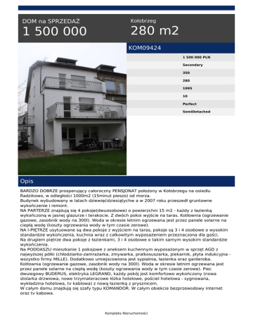 DOM na SPRZEDAŻ 1 500 000 Kołobrzeg 280 m2 KOM09424 1 500 000 PLN Secondary 350 280 1995 10 Perfect SemiDetached Opis BARDZO DOBRZE prosperujący całoroczny PENSJONAT położony w Kołobrzegu na osiedlu Radzikowo, w odległości 1000m2 (15minut pieszo) od morza. Budynek wybudowany w latach dziewięćdziesiątychw a w 2007 roku przeszedł gruntowne wykończenie i remont. NA PARTERZE znajdują się 4 pokoje(dwuosobowe) o powierzchni 15 m2 - każdy z łazienką wykończoną w jasnej glazurze i terakocie. Z dwóch pokoi wyjście na taras. Kotłownia (ogrzewanie gazowe, zasobnik wody na 300l). Woda w okresie letnim ogrzewana jest przez panele solarne na ciepłą wodę (koszty ogrzewania wody w tym czasie zerowe). NA I-PIĘTRZE usytuowane są dwa pokoje z wyjściem na taras, pokoje są 3 i 4 osobowe o wysokim standardzie wykończenia, kuchnia wraz z całkowitym wyposażeniem przeznaczona dla gości. Na drugiem piętrze dwa pokoje z łazienkami, 3 i 4 osobowe o takim samym wysokim standardzie wykończenia. Na PODDASZU mieszkanie 1 pokojowe z aneksem kuchennym wyposażonym w sprzęt AGD z najwyższej półki (chłodziarko-zamrażarka, zmywarka, pralkosuszarka, piekarnik, płyta indukcyjna wszystko firmy MILLE). Dodatkowo umiejscowiona jest sypialnia, łazienka oraz garderoba. Kotłownia (ogrzewanie gazowe, zasobnik wody na 300l). Woda w okresie letnim ogrzewana jest przez panele solarne na ciepłą wodę (koszty ogrzewania wody w tym czasie zerowe). Piec dwuiegowy BUDERUS, elektryka LEGRAND, każdy pokój jest komfortowo wykończony (nowa stolarka drzwiowa, nowe trzymateracowe łóżka hotelowe, pościel hotelowa - sygnowana, wykładzina hotelowa, tv kablowa) z nową łazienką z prysznicem. W całym domu znajdują się szafy typu KOMANDOR. W całym obiekcie bezprzewodowy internet oraz tv kabowa. Kompleks Nieruchomości Budynek docieplony, nowa elewacja (w pustce 5 cm strypioan, parter 15 cm, kolejne poziomy 10 cm, dach 20 cm waty mineralnej). Nowe okna PCV, dach pokryty blachą cynkową (gwarancja 50 lat). Wszystkie stropy docieplone, grube posadzki, każde piętro posiada rozdzielniki ciepła. Łazienki na III i IV poziomie posiadają ogrzewanie podłogowe. Pensjonat przeznaczony jest na 24 osoby, plus mieszkanie na poddaszu dla 3-4 osób. W całym obiekcie poręcze, balustrady, zewnętrzne ogrodzenie, brama wjzadowa (elektryczna sterowana z pilota) kute na specjalne zamówienie. Działka bardzo ładnie zagospodarowana, polbruk, ogrodzenie, altana na ogrodzie, miejsce do grillowania, piękne podświetlenie. Obiekt położony w typowej pensjonatowej dzielnicy. W okolicy dwa duże sklepy, 3 jadłodajnie i 2 całoroczne restauracje. Ponadto plac zabaw dla dzieci, dwa boiska do gry w siatkę. Dzielnica bardzo dobrze skomunikowana z centrum miasta, w odległości około 100m przystanek, z którego można dostać się do większości strategicznych miejsc w Kołobrzegu. W cenie nieruchomości pozostaje pełne wyposażenie. W cenie pozostaje również bardzo rozpoznawalna nazwa pensjonatu, reklama na serwerach, rezerwacje, oraz reklama wielkopowierzchniowa. Obiekt widoczny jest również w Punktach Informacji Turystycznej. Polecamy ze względu na bardzo dobrą lokalizację i wysoki standart wykończenia. CENA DO NEGOCJACJI. zapraszamy na prezentacje Iwona Murczak tel. 516-179-513, 691-626-974 tel. 691-626-974 email: [email protected] Kompleks Nieruchomości Powered by TCPDF (www.tcpdf.org)
