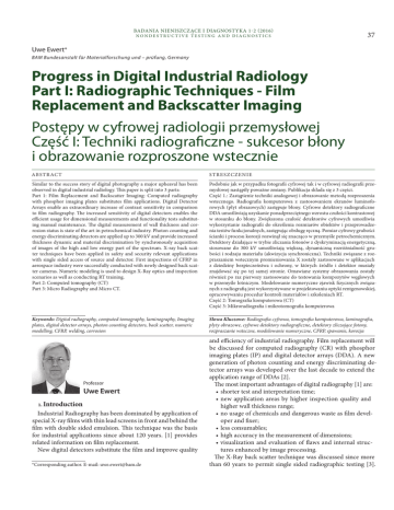 Badania Nieniszczące i Diagnostyka 1-2 (2016) Nondestructive Testing and Diagnostics 37 Uwe Ewert* BAM Bundesanstalt für Materialforschung und – prüfung, Germany Progress in Digital Industrial Radiology Part I: Radiographic Techniques - Film Replacement and Backscatter Imaging Postępy w cyfrowej radiologii przemysłowej Część I: Techniki radiograficzne - sukcesor błony i obrazowanie rozproszone wstecznie Ab st r ac t St r e s z c z e n i e Similar to the success story of digital photography a major upheaval has been observed in digital industrial radiology. This paper is split into 3 parts: Part 1: Film Replacement and Backscatter Imaging: Computed radiography with phosphor imaging plates substitutes film applications. Digital Detector Arrays enable an extraordinary increase of contrast sensitivity in comparison to film radiography. The increased sensitivity of digital detectors enables the efficient usage for dimensional measurements and functionality tests substituting manual maintenance. The digital measurement of wall thickness and corrosion status is state of the art in petrochemical industry. Photon counting and energy discriminating detectors are applied up to 300 kV and provide increased thickness dynamic and material discrimination by synchronously acquisition of images of the high and low energy part of the spectrum. X-ray back scatter techniques have been applied in safety and security relevant applications with single sided access of source and detector. First inspections of CFRP in aerospace industry were successfully conducted with newly designed back scatter cameras. Numeric modeling is used to design X-Ray optics and inspection scenarios as well as conducting RT training. Part 2: Computed tomography (CT) Part 3: Micro Radiography and Micro CT. Podobnie jak w przypadku fotografii cyfrowej tak i w cyfrowej radiografii przemysłowej nastąpiły poważne zmiany. Publikacja składa się z 3 części. Część 1.: Zastąpienie techniki analogowej i obrazowanie metodą rozproszenia wstecznego. Radiografia komputerowa z zastosowaniem ekranów luminoforowych (płyt obrazowych) zastępuje błony. Cyfrowe detektory radiograficzne DDA umożliwiają uzyskanie ponadprzeciętnego wzrostu czułości kontrastowej w stosunku do błony. Zwiększona czułość detektorów cyfrowych umożliwia wykorzystanie radiografii do określenia rozmiarów obiektów i przeprowadzenia testów funkcjonalnych, zastępując obsługę ręczną. Pomiar cyfrowy grubości ścianki i procesu korozji rozwinął się znacząco w przemyśle petrochemicznym. Detektory działające w trybie zliczania fotonów z dyskryminacją energetyczną, stosowane do 300 kV umożliwiają większą, dynamiczną rozróżnialność grubości i rodzaju materiału (akwizycja synchroniczna). Techniki związane z rozpraszaniem wstecznym promieniowania X zostały zastosowane w aplikacjach z dziedziny bezpieczeństwa i ochrony, w których źródło i detektor musiały znajdować się po tej samej stronie. Omawiane systemy obrazowania zostały również po raz pierwszy zastosowane do testowania kompozytów węglowych w przemyśle lotniczym. Modelowanie numeryczne zjawisk fizycznych związanych z radiografią jest wykorzystywane w projektowaniu optyki rentgenowskiej, opracowywaniu procedur kontroli materiałów i szkoleniach RT. Część 2: Tomografia komputerowa (CT) Część 3: Mikroradiografia i mikrotomografia komputerowa Keywords: Digital radiography, computed tomography, laminography, Imaging plates, digital detector arrays, photon counting detectors, back scatter, numeric modelling, CFRP, welding, corrosion Słowa Kluczowe: Radiografia cyfrowa, tomografia komputerowa, laminografia, płyty obrazowe, cyfrowe detektory radiograficzne, detektory zliczające fotony, rozpraszanie wsteczne, modelowanie numeryczne, CFRP, spawanie, korozja Professor Uwe Ewert 1.Introduction Industrial Radiography has been dominated by application of special X-ray films with thin lead screens in front and behind the film with double sided emulsion. This technique was the basis for industrial applications since about 120 years. [1] provides related information on film replacement. New digital detectors substitute the film and improve quality *Corresponding author. E-mail: [email protected] and efficiency of industrial radiography. Film replacement will be discussed for computed radiography (CR) with phosphor imaging plates (IP) and digital detector arrays (DDA). A new generation of photon counting and energy discriminating detector arrays was developed over the last decade to extend the application range of DDAs [2]. The most important advantages of digital radiography [1] are: • shorter test and interpretation time; • new application areas by higher inspection quality and higher wall thickness range; • no usage of chemicals and dangerous waste as film developer and fixer; • less consumables; • high accuracy in the measurement of dimensions; • visualization and evaluation of flaws and internal structures enhanced by image processing. The X-Ray back scatter technique was discussed since more than 60 years to permit single sided radiographic testing [3]. 38 Badania Nieniszczące i Diagnostyka 1-2 (2016) Nondestructive Testing and Diagnostics Especially after the successful application in the security field, the back scatter imaging returns back to the attention of NDT. First applications for carbon fiber reinforced polymer (CFRP) testing are presented [4]. Fig. 1.Inspection of welded pipelines with CR [6] Rys. 1.Inspekcja rurociągów za pomocą radiogafii cyfrowej [6] Radiography and CT cover a wide application range, despite upcoming alternative NDT methods as phased array ultrasonics with synthetic aperture focusing for 3D visualization and complex electromagnetic methods, as e.g. THz based inspections. Radiography and CT are used in a range of few keV until 15 MeV for industrial usage and cover applications of objects in the nm to meter ra