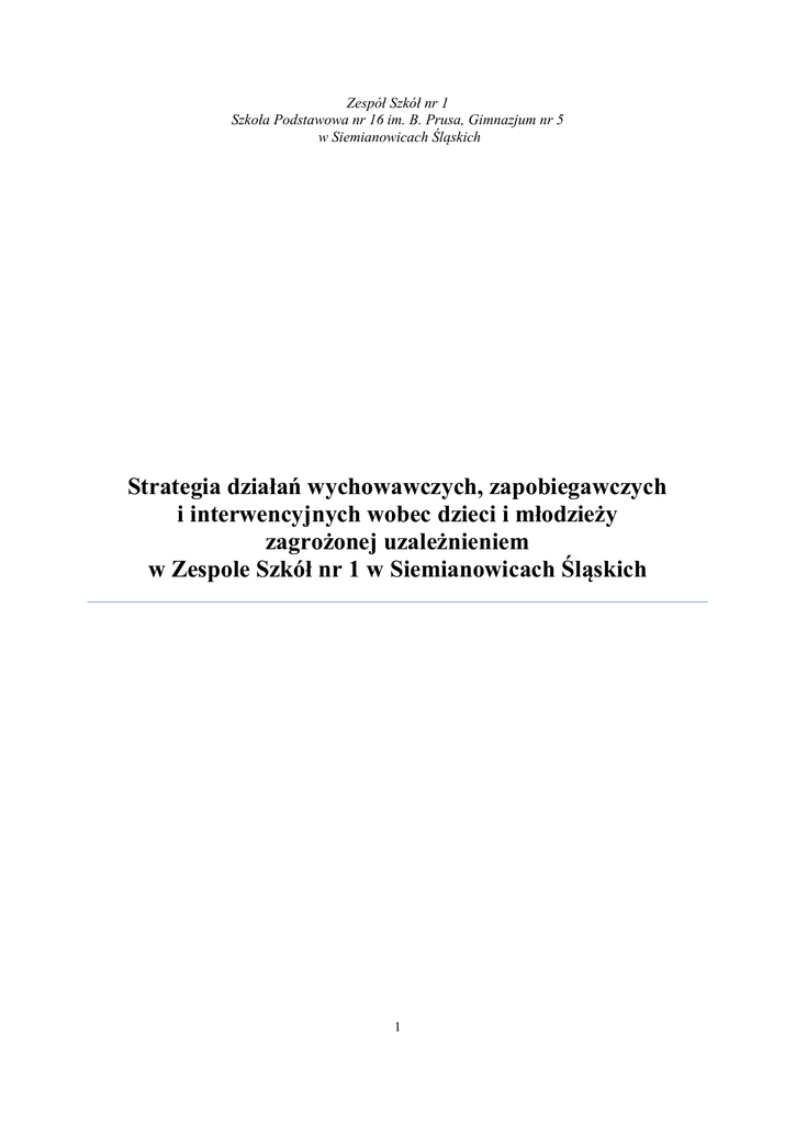 Zespół Szkół nr 1 Szkoła Podstawowa nr 16 im. B. Prusa, Gimnazjum nr 5 w Siemianowicach Śląskich Strategia działań wychowawczych, zapobiegawczych i interwencyjnych wobec dzieci i młodzieży zagrożonej uzależnieniem w Zespole Szkół nr 1 w Siemianowicach Śląskich 1 Zespół Szkół nr 1 Szkoła Podstawowa nr 16 im. B. Prusa, Gimnazjum nr 5 w Siemianowicach Śląskich Strategia działań wychowawczych, zapobiegawczych i interwencyjnych wobec młodzieży zagrożonej uzależnieniem w Zespole Szkół nr 1 w Siemianowicach Śląskich Podstawa prawna: Ustawa z dnia 26 października 1982 r. o postępowaniu w sprawach nieletnich (tekst jednolity Dz.U. z 2014 r., poz. 382) Ustawa z dnia 26 października 1982 r. o wychowaniu w trzeźwości i przeciwdziałaniu alkoholizmowi (tekst jednolity Dz.U. z 2012 r., poz. 1356) Ustawa z dnia 29 lipca 2005 r. o przeciwdziałaniu narkomanii (tekst jednolity Dz.U. z 2012 r., poz. 124) Ustawa z dnia 6 kwietnia 1990 r. o Policji (tekst jednolity Dz.U. z 2011 r. Nr 287, poz. 1687) Ustawa z dnia 7 września 1991 r. o systemie oświaty (tekst jednolity Dz.U. z 2004 r. Nr 256, poz. 2572) Rozporządzenie Ministra Edukacji Narodowej i Sportu z dnia 31 stycznia 2003 r. w sprawie szczegółowych form działalności wśród dzieci i młodzieży zagrożonych uzależnieniem (Dz.U. Nr 26, poz. 226). Za realizację Strategii odpowiedzialni są wszyscy pracownicy Zespołu Szkół nr 1 w Siemianowicach Śląskich, a koordynatorem działań jest dyrektor szkoły. I. Systematyczne prowadzenie w środowisku szkoły edukacji prozdrowotnej, promocji zdrowia psychicznego i zdrowego stylu życia wśród młodzieży, rodziców i nauczycieli. W Zespole Szkół nr 1 w Siemianowicach Śląskich systematycznie prowadzona jest edukacja prozdrowotna, promocja zdrowia psychicznego i zdrowego stylu życia. Działania w tym zakresie prowadzone są w ramach realizacji: Szkolnego Programu Wychowawczego, Programu Profilaktyki, zajęć edukacyjnych – zgodnie z obowiązującą podstawą programową, konkursów z zakresu edukacji prozdrowotnej, współpracy z: higienistką środowiska szkolnego, Powiatową Stacją SanitarnoEpidemiologiczną w Katowicach, Komendą Powiatową Policji w Siemianowicach Śląskich, godzin z wychowawcą, imprez sportowych i rekreacyjnych, akcji informacyjnych w ramach realizacji programów profilaktycznych, zebrań z rodzicami – spotkań indywidualnych i grupowych z pedagogiem i psychologiem szkolnym, wewnątrzszkolnego doskonalenia nauczycieli. II. Działalność informacyjna. Działalność informacyjna obejmuje upowszechnianie wśród dzieci, młodzieży, rodziców i nauczycieli wiedzy na temat: szkodliwości środków lub substancji, których używanie łączy się zagrożeniem bezpieczeństwa i zdrowia oraz może prowadzić do uzależnień, dostępnych form pomocy młodzieży zagrożonej uzależnieniem, możliwości rozwiązywania problemów powodujących powstawanie uzależnień, skutków prawnych związanych z naruszeniem ustawy o przeciwdziałaniu narkomanii. 2 Zespół Szkół nr 1 Szkoła Podstawowa nr 16 im. B. Prusa, Gimnazjum nr 5 w Siemianowicach Śląskich Upowszechnienie tej wiedzy następuje poprzez: realizowanie konkursów i akcji profilaktycznych na terenie szkoły, motywowanie uczniów do udziału w pozaszkolnych imprezach, akcjach i konkursach o tematyce profilaktycznej, opracowywanie gazetek o tematyce profilaktycznej, wykorzystanie filmów o tematyce profilaktycznej, rozmowy indywidualne i grupowe z uczniami mające na celu przekazywanie informacji na temat zagrożeń związanych ze środkami psychoaktywnymi, przeprowadzanie zajęć o tematyce profilaktycznej przez przedstawicieli Policji i Straży Miejskiej, edukację rodziców – opracowywanie i udostępnianie materiałów informacyjnych dotyczących zagadnień profilaktycznych dla uczniów, rodziców i nauczycieli, edukację nauczycieli – przekazywanie informacji na temat szkoleń i warsztatów oraz zapraszanie specjalistów na szkolenia rady pedagogicznej. III. Zadania pracowników szkoły w zakresie pomocy młodzieży zagrożonej uzależnieniem: 1) Dyrektor szkoły: a) realizuje zadania wynikające ze Statutu Szkoły, b) monitoruje i odpowiada za realizację strategii działań wychowawczych, zapobiegawczych i interwencyjnych, c) na bieżąco informowany jest przez wychowawców, nauczycieli i innych pracowników szkoły o podejmowanych przez nich działaniach wynikających z realizacji strategii, d) podejmuje stosowne decyzje tak, aby każda interwencja była przeprowadzona z zachowaniem praw uczniów, jak i ich rodziców. 2) Nauczyciele i wychowawcy klas: a) realizują działania profilaktyczne i interwencyjne określone w Szkolnym Programie Wychowawczym, Programie Profilaktyki oraz w Planach Pracy Wychowawcy Klasowego, b) systematycznie prowadzą edukację prozdrowotną, promocję zdrowia psychicznego i zdrowego stylu życia wśród uczniów na godzinach do dyspozycji wychowawcy, na zajęciach pozalekcyjnych, kołach zainteresowań, c) realizują zagadnienia dotyczące zapobiegania narkomanii w ramach przedmiotów, których podstawy programowe uwzględniają te zagadnienia, d) uczestniczą w kursach, szkoleniach i konferencjach z zakresu profilaktyki uzależnień i innych problemów młodzieży oraz sposobów podejmowania wczesnej interwencji w sytuacjach zagrożenia uzależnieniem, e) wykorzystują zdobytą wiedzę w pracy z młodzieżą i ich rodzicami informując o szkodliwości środków i substancji, których używanie łączy się z zagrożeniem bezpieczeństwa oraz może doprowadzić do uzależnienia, f) wychowawcy klas organizują szkolenia z rodzicami uczniów o charakterze profilaktycznym, zapraszają specjalistów z zakresu tej tematyki, 3 Zespół Szkół nr 1 Szkoła Podstawowa nr 16 im. B. Prusa, Gimnazjum nr 5 w Siemianowicach Śląskich g) wychowawcy klas dokonują diagnozy sytuacji wychowawczej, przejawów zachowań ryzykownych uczniów swojej klasy oraz s