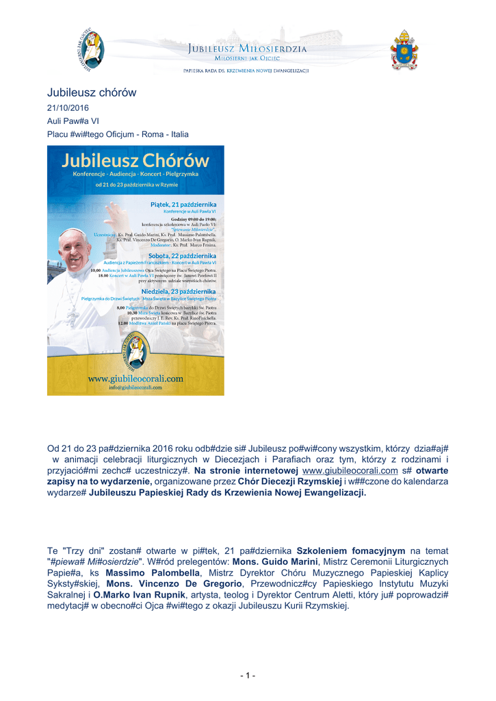 Jubileusz chórów 21/10/2016 Auli Paw#a VI Placu #wi#tego Oficjum - Roma - Italia Od 21 do 23 pa#dziernika 2016 roku odb#dzie si# Jubileusz po#wi#cony wszystkim, którzy dzia#aj# w animacji celebracji liturgicznych w Diecezjach i Parafiach oraz tym, którzy z rodzinami i przyjació#mi zechc# uczestniczy#. Na stronie internetowej www.giubileocorali.com s# otwarte zapisy na to wydarzenie, organizowane przez Chór Diecezji Rzymskiej i w##czone do kalendarza wydarze# Jubileuszu Papieskiej Rady ds Krzewienia Nowej Ewangelizacji. Te "Trzy dni" zostan# otwarte w pi#tek, 21 pa#dziernika Szkoleniem fomacyjnym na temat "#piewa# Mi#osierdzie". W#ród prelegentów: Mons. Guido Marini, Mistrz Ceremonii Liturgicznych Papie#a, ks Massimo Palombella, Mistrz Dyrektor Chóru Muzycznego Papieskiej Kaplicy Syksty#skiej, Mons. Vincenzo De Gregorio, Przewodnicz#cy Papieskiego Instytutu Muzyki Sakralnej i O.Marko Ivan Rupnik, artysta, teolog i Dyrektor Centrum Aletti, który ju# poprowadzi# medytacj# w obecno#ci Ojca #wi#tego z okazji Jubileuszu Kurii Rzymskiej. -1- W drugim dniu, w sobot#, 22 pa#dziernika, wszyscy zapisani uczestniczy# b#d# Audiencji Jubileuszowej z Ojcem #wi#tym, a po po#udniu, chóry, które wyst#pi#y w##cz# si# w wielki Koncert w Auli Paw#a VI po#wi#cony Bo#emu Mi#osierdziu i #w. Janowi Paw#owi II w dniu jego Pami#ci Liturgicznej. Niedziela 23 pa#dziernika, Pielgrzymka do Drzwi #wi#tych oraz modlitwa na grobie Aposto#a Piotra. Nast#pnie Msza #wi#ta w Bazylice #wi#tego Piotra, której przewodniczy# b#dzie J. E. Bp. Rino Fisichella. Na koniec uczestnictwo w modlitwie Anio# Pa#ski z udzia#em Papie#a na placu #wi#tego Piotra. Na stronie internetowej po#wi#conej wydarzeniu, znajdziesz wszystkie niezb#dne informacje dotycz#ce trzech dni i szczegó#owy program. PLAKAT Pi#tek, 21 pa#dziernika Konferencje w Auli Paw#a VI Godziny 09:00 do 19:00; konferencja szkoleniowa w Auli Paolo VI: "#piewanie Mi#osierdzie". Uczestnicz#:. Ks. Pra#. Guido Marini, Ks. Pra#. Massimo Palombella. Ks. Pra#. Vincenzo De Gregorio, O. Marko Ivan Rupnik. Moderator:. Ks. Pra#. Marco Frisina. -2- Sobota, 22 pa#dziernika Audiencja z Papie#em Franciszkiem - Koncert w Auli Paw#a VI 10,00 Audiencja Jubileuszowa Ojca #wi#tego na Placu #wi#tego Piotra. 18.00 Koncert w Auli Paw#a VI po#wi#cony #w. Janowi Paw#owi II przy aktywnym udziale wszystkich chórów. Niedziela, 23 pa#dziernika Pielgrzymka do Drzwi #wi#tych - Msza #wi#ta w Bazylice #wi#tego Piotra 8,00 Pielgrzymka do Drzwi #wi#tych bazyliki #w. Piotra 10.30 Msza #wi#ta ko#cowa w Bazylice #w. Piotra przewodniczy J. E. Rev. Ks. Pra#. RinoFisichella. 12.00 Modlitwa Anio# Pa#ski na placu #wi#tego Piotra. Aby uzyska# wi#cej informacji, napisz na adres: [email protected] -3-