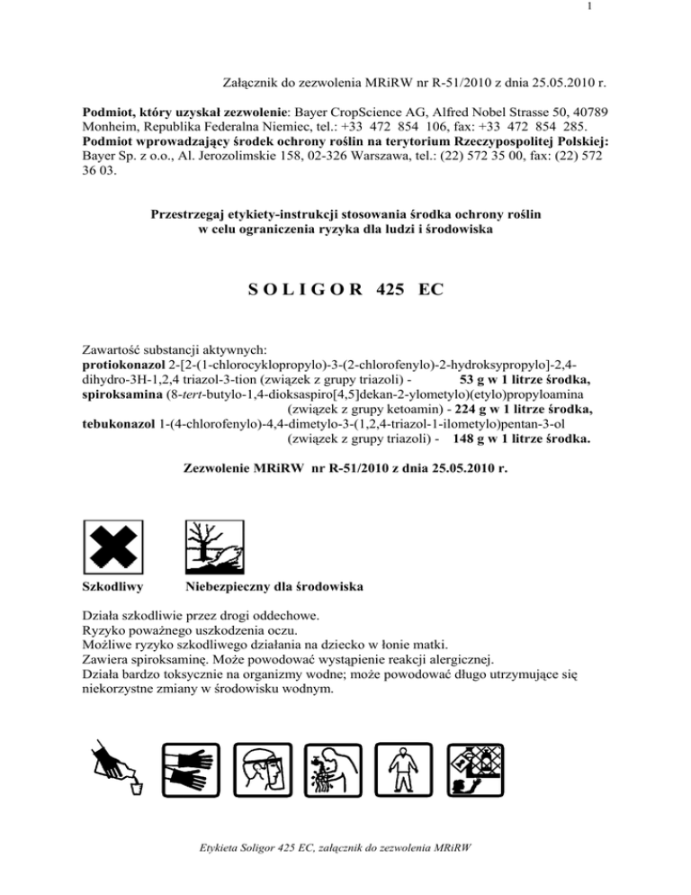1 Załącznik do zezwolenia MRiRW nr R-51/2010 z dnia 25.05.2010 r. Podmiot, który uzyskał zezwolenie: Bayer CropScience AG, Alfred Nobel Strasse 50, 40789 Monheim, Republika Federalna Niemiec, tel.: +33 472 854 106, fax: +33 472 854 285. Podmiot wprowadzający środek ochrony roślin na terytorium Rzeczypospolitej Polskiej: Bayer Sp. z o.o., Al. Jerozolimskie 158, 02-326 Warszawa, tel.: (22) 572 35 00, fax: (22) 572 36 03. Przestrzegaj etykiety-instrukcji stosowania środka ochrony roślin w celu ograniczenia ryzyka dla ludzi i środowiska S O L I G O R 425 EC Zawartość substancji aktywnych: protiokonazol 2-[2-(1-chlorocyklopropylo)-3-(2-chlorofenylo)-2-hydroksypropylo]-2,4dihydro-3H-1,2,4 triazol-3-tion (związek z grupy triazoli) 53 g w 1 litrze środka, spiroksamina (8-tert-butylo-1,4-dioksaspiro[4,5]dekan-2-ylometylo)(etylo)propyloamina (związek z grupy ketoamin) - 224 g w 1 litrze środka, tebukonazol 1-(4-chlorofenylo)-4,4-dimetylo-3-(1,2,4-triazol-1-ilometylo)pentan-3-ol (związek z grupy triazoli) - 148 g w 1 litrze środka. Zezwolenie MRiRW nr R-51/2010 z dnia 25.05.2010 r. Szkodliwy Niebezpieczny dla środowiska Działa szkodliwie przez drogi oddechowe. Ryzyko poważnego uszkodzenia oczu. Możliwe ryzyko szkodliwego działania na dziecko w łonie matki. Zawiera spiroksaminę. Może powodować wystąpienie reakcji alergicznej. Działa bardzo toksycznie na organizmy wodne; może powodować długo utrzymujące się niekorzystne zmiany w środowisku wodnym. Etykieta Soligor 425 EC, załącznik do zezwolenia MRiRW 2 Uwaga! 1. Zabrania się stosowania środka w strefie bezpośredniej ochrony ujęć wody. 2. Nie zanieczyszczać wód środkiem ochrony roślin lub jego opakowaniem. I OPIS DZIAŁANIA SOLIGOR 425 EC jest środkiem grzybobójczym w formie koncentratu do sporządzania emulsji wodnej o działaniu systemicznym do stosowania zapobiegawczego, interwencyjnego oraz wyniszczającego w ochronie zbóż ozimych i jarych. II ZAKRES STOSOWANIA, TERMINY I DAWKI 1. PSZENICA OZIMA, PSZENICA JARA mączniak prawdziwy, rdza brunatna, brunatna plamistość liści, septoriozy Zalecana dawka: 0,7-1 l/ha. Wyższą z zalecanych dawek stosować przy dużym nasileniu chorób. Zalecana ilość wody: 200-400 l/ha. Zalecane opryskiwanie: drobnokropliste. 2. PSZENŻYTO OZIME mączniak prawdziwy, rdza brunatna, septoriozy 3. PSZENŻYTO JARE mączniak prawdziwy Zalecana dawka: 0,7-1 l/ha. Wyższą z zalecanych dawek stosować przy dużym nasileniu chorób. Zalecana ilość wody: 200-400 l/ha. Zalecane opryskiwanie: drobnokropliste. 4. JĘCZMIEŃ OZIMY, JĘCZMIEŃ JARY. mączniak prawdziwy, rdza karłowa jęczmienia, plamistość siatkowa Zalecana dawka: 0,6- 0,8 l/ha. Wyższą z zalecanych dawek stosować przy dużym nasileniu chorób. Zalecana ilość wody: 200-400 l/ha. Zalecane opryskiwanie: drobnokropliste. 5. ŻYTO mączniak prawdziwy, rdza brunatna, rynchosporioza Zalecana dawka: 0,6- 0,8 l/ha. Wyższą z zalecanych dawek stosować przy dużym nasileniu chorób. Zalecana ilość wody: 200-400 l/ha. Zalecane opryskiwanie: drobnokropliste. Środek stosować zapobiegawczo lub z chwilą wystąpienia pierwszych objawów chorób: pszenica, pszenżyto: od początku fazy strzelania w źdźbło do końca fazy kłoszenia, jęczmień: od końca fazy krzewienia do początku fazy kłoszenia, żyto: od początku fazy strzelania w źdźbło do początku fazy kłoszenia, UWAGI: 1. W warunkach sprzyjających rozwojowi chorób grzybowych pszenicy zalecany termin zabiegu opryskiwania można wydłużyć do fazy dojrzałości wodnej ziarna. 2. W warunkach silnego zagrożenia pszenżyta fuzariozą kłosów zabieg wykonać po zakończeniu kwitnienia. 3. Termin wykonania zabiegu musi uwzględniać karencję środka. 4. Środek szczególnie przydatny w niekorzystnych warunkach panujących w okresie wykonywania zabiegu (temperatura poniżej 12°C). 5. Dokładnie pokryć cieczą użytkową całą powierzchnię roślin. 6. Środek stosować nie więcej niż dwa razy w sezonie. III OKRES KARENCJI okres od dnia ostatniego zabiegu do dnia zbioru roślin przeznaczonych do konsumpcji PSZENICA OZIMA, PSZENICA JARA, PSZENŻYTO OZIME, PSZENŻYTO JARE, JĘCZMIEŃ OZIMY, JĘCZMIEŃ JARY, ŻYTO – 35 DNI IV OKRES PREWENCJI DLA LUDZI, ZWIERZĄT I PSZCZÓŁ okres zapobiegający zatruciu NIE DOTYCZY V SPORZĄDZANIE CIECZY UŻYTKOWEJ Przed przystąpieniem do sporządzania cieczy użytkowej dokładnie ustalić potrzebną jej ilość. Odmierzoną ilość środka wlać do zbiornika opryskiwacza napełnionego częściowo wodą (z włączonym mieszadłem) i uzupełnić wodą do potrzebnej ilości. Opryskiwać z włączonym mieszadłem. Po wlaniu środka do zbiornika opryskiwacza nie wyposażonego w mieszadło hydrauliczne ciecz mechanicznie wymieszać. Etykieta Soligor 425 EC, załącznik do zezwolenia MRiRW Opróżnione opakowania przepłukać trzykrotnie wodą, a popłuczyny wlać do zbiornika opryskiwacza z cieczą użytkową. Po pracy aparaturę dokładnie wymyć. VI PRZECHOWYWANIE Przechowywać wyłącznie w oryginalnym opakowaniu w temperaturze nie niższej niż 0°C i nie wyższej niż 30°C, z dala od źródeł ciepła. Chronić przed dziećmi. Nie przechowywać razem z żywnością, napojami i paszami dla zwierząt. VII WARUNKI BEZPIECZNEGO STOSOWANIA ŚRODKA Nie jeść i nie pić oraz nie palić tytoniu podczas stosowania produktu. Nie wdychać par cieczy użytkowej. Unikać zanieczyszczenia skóry i oczu. Natychmiast zdjąć całą zanieczyszczoną odzież. W przypadku zanieczyszczenia skóry natychmiast przemyć ją dużą ilością wody. Nosić odpowiednią odzież ochronną, odpowiednie rękawice ochronne i okulary lub ochronę twarzy. W razie połknięcia niezwłocznie zasięgnij porady lekarza - pokaż opakowanie lub etykietę. Środek i opakowanie usuwać jako odpad niebezpieczny. Używać odpowiednich pojemników zapobiegających skażeniu środowiska. Opróżnione opakowania po środku zwrócić do sprzedawcy, u któreg