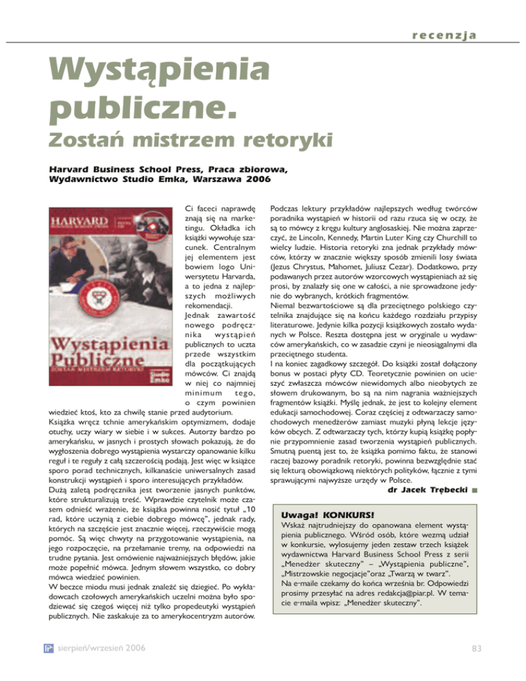 recenzja Wystąpienia publiczne. Zostań mistrzem retoryki Harvard Business School Press, Praca zbiorowa, Wydawnictwo Studio Emka, Warszawa 2006 .T QLNPNT YL[]LbOí eYLUÙ ^Tí YL XL]VP _TYR` :VčLOVL TNS V^TÙŇVTbdbZč`UP^eL N`YPV .PY_]LWYdX UPU PWPXPY_PX UP^_ MZbTPX WZRZ @YT bP]^d_P_` 3L]aL]OL L _Z UPOYL e YLUWP[ ^edNS XZŇWTbdNS ]PVZXPYOLNUT 5POYLV eLbL]_ZĦÛ YZbPRZ [ZO]íNe Y T V L b d ^ _ Ù [ T P ď [`MWTNeYdNS _Z `Ne_L []ePOP b^ed^_VTX OWL [ZNeÙ_V`UÙNdNS XÇbNÇb .T eYLUOÙ b YTPU NZ YLUXYTPU X T Y T X ` X _ P R Z Z NedX [ZbTYTPY bTPOeTPÛ V_ZĦ V_Z eL NSbTWí ^_LYTP []ePO L`Od_Z]T`X 6^TÙŇVL b]íNe _NSYTP LXP]dVLď^VTX Z[_dXTeXPX OZOLUP Z_`NSd `Ned bTL]d b ^TPMTP T b ^`VNP^ ,`_Z]ed ML]OeZ [Z LXP]dVLď^V` b UL^YdNS T []Z^_dNS ^čZbLNS [ZVLe`UÙ ŇP OZ bdRčZ^ePYTLOZM]PRZbd^_Ù[TPYTLbd^_L]NedZ[LYZbLYTPVTWV` ]PR`čT_P]PR`čdeNLčÙ^eNeP]ZĦNTÙ[ZOLUÙ5P^_bTíNbV^TÙŇNP ^[Z]Z [Z]LO _PNSYTNeYdNS VTWVLYLĦNTP `YTbP]^LWYdNS eL^LO VZY^_]`VNUT bd^_Ù[TPď T ^[Z]Z TY_P]P^`UÙNdNS []edVčLOÇb /`ŇÙ eLWP_Ù [ZO]íNeYTVL UP^_ _bZ]ePYTP UL^YdNS [`YV_Çb V_Ç]P ^_]`V_`]LWTe`UÙ _]PĦÛ B[]LbOeTP Ned_PWYTV XZŇP NeL ^PX ZOYTPĦÛ b]LŇPYTP ŇP V^TÙŇVL [ZbTYYL YZ^TÛ _d_`č k ]LO V_Ç]P `NedYTÙ e NTPMTP OZM]PRZ XÇbNíu UPOYLV ]LOd V_Ç]dNSYL^eNeíĦNTPUP^_eYLNeYTPbTíNPU]ePNedbTĦNTPXZRÙ [ZXÇN >Ù bTíN NSbd_d YL []edRZ_ZbLYTP bd^_Ù[TPYTL YL UPRZ ]Ze[ZNeíNTP YL []ePčLXLYTP _]PXd YL ZO[ZbTPOeT YL _]`OYP[d_LYTL5P^_ZXÇbTPYTPYLUbLŇYTPU^edNSMčíOÇbULVTP XZŇP [Z[PčYTÛ XÇbNL 5POYdX ^čZbPX b^ed^_VZ NZ OZM]d XÇbNLbTPOeTPÛ[ZbTYTPY BMPNeNPXTZO`X`^TUPOYLVeYLWPŅÛ^TíOeTPRTPÛ;ZbdVčL OZbNLNS NeZčZbdNS LXP]dVLď^VTNS `NePWYT XZŇYL MdčZ ^[Z OeTPbLÛ ^Tí NePRZĦ bTíNPU YTŇ _dWVZ []Z[POP`_dVT bd^_Ù[TPď [`MWTNeYdNS9TPeL^VLV`UPeL_ZLXP]dVZNPY_]deXL`_Z]Çb ^TP][TPďb]eP^TPď! ;ZONeL^ WPV_`]d []edVčLOÇb YLUWP[^edNS bPOč`R _bÇ]NÇb [Z]LOYTVL bd^_Ù[TPď b ST^_Z]TT ZO ]Le` ]e`NL ^Tí b ZNed ŇP ^Ù_ZXÇbNdeV]íR`V`W_`]dLYRWZ^L^VTPU9TPXZŇYLeL[]eP NedÛŇP7TYNZWY6PYYPOd8L]_TY7`_P]6TYRNed.S`]NSTWW_Z bTPWNd W`OeTP 3T^_Z]TL ]P_Z]dVT eYL UPOYLV []edVčLOd XÇb NÇb V_Ç]ed b eYLNeYTP bTíV^ed ^[Z^ÇM eXTPYTWT WZ^d ĦbTL_L 5Pe`^ .S]d^_`^ 8LSZXP_ 5`WT`^e .PeL] /ZOL_VZbZ []ed [ZOLbLYdNS[]ePeL`_Z]ÇbbeZ]NZbdNSbd^_Ù[TPYTLNSLŇ^Tí []Z^TMdeYLWLečd^TíZYPbNLčZĦNTLYTP^[]ZbLOeZYPUPOd YTP OZbdM]LYdNSV]Ç_VTNSQ]LRXPY_Çb 9TPXLW MPebL]_ZĦNTZbP ^Ù OWL []ePNTí_YPRZ [ZW^VTPRZ Ned _PWYTVL eYLUO`UÙNP ^Tí YL VZďN` VLŇOPRZ ]ZeOeTLč` []ed[T^d WT_P]L_`]ZbP5POdYTPVTWVL[ZedNUTV^TÙŇVZbdNSeZ^_LčZbdOL YdNS b ;ZW^NP =P^e_L OZ^_í[YL UP^_ b Z]dRTYLWP ` bdOLb NÇbLXP]dVLď^VTNSNZbeL^LOeTPNedYTUPYTPZ^TÙRLWYdXTOWL []ePNTí_YPRZ ^_`OPY_L 4YLVZYTPNeLRLOVZbd^eNePRÇč/ZV^TÙŇVTeZ^_LčOZčÙNeZYd MZY`^ b [Z^_LNT [čd_d ./ ?PZ]P_dNeYTP [ZbTYTPY ZY `NTP ^edÛ ebčL^eNeL XÇbNÇb YTPbTOZXdNS LWMZ YTPZMd_dNS eP ^čZbPX O]`VZbLYdX MZ ^Ù YL YTX YLR]LYTL bLŇYTPU^edNS Q]LRXPY_ÇbV^TÙŇVT8dĦWíUPOYLVŇPUP^__ZVZWPUYdPWPXPY_ PO`VLNUT^LXZNSZOZbPU.Z]LeNeíĦNTPUeZO_bL]eLNed^LXZ NSZOZbdNS XPYPOŇP]Çb eLXTL^_ X`edVT [čdYÙ WPVNUP Uíed VÇbZMNdNSEZO_bL]eLNed_dNSV_Ç]edV`[TÙV^TÙŇVí[Z[čd YTP []ed[ZXYTPYTP eL^LO _bZ]ePYTL bd^_Ù[TPď [`MWTNeYdNS >X`_YÙ [`PY_Ù UP^_ _Z ŇP V^TÙŇVL [ZXTXZ QLV_` ŇP ^_LYZbT ]LNePUMLeZbd[Z]LOYTV]P_Z]dVT[ZbTYYLMPebeRWíOYTP^_LÛ ^TíWPV_`]ÙZMZbTÙeVZbÙYTPV_Ç]dNS[ZWT_dVÇbčÙNeYTPe_dXT ^[]Lb`UÙNdXTYLUbdŇ^eP `]eíOdb;ZW^NP dr Jacek Trębecki Uwaga! KONKURS! B^VLŇ YLU_]`OYTPU^ed OZ Z[LYZbLYL PWPXPY_ bd^_Ù [TPYTL [`MWTNeYPRZ BĦ]ÇO Z^ÇM V_Ç]P bPeXÙ `OeTLč b VZYV`]^TP bdWZ^`UPXd UPOPY eP^_Lb _]ePNS V^TÙŇPV bdOLbYTN_bL 3L]aL]O -`^TYP^^ >NSZZW ;]P^^ e ^P]TT k8PYPOŇP] ^V`_PNeYdu w kBd^_Ù[TPYTL [`MWTNeYPu k8T^_]eZb^VTPYPRZNULNUPuZ]Lek?bL]eÙb_bL]eu 9LPXLTWPNePVLXdOZVZďNLb]ePĦYTLM]:O[ZbTPOeT []Z^TXd []eP^dčLÛ YL LO]P^ ]POLVNUL+[TL][W B _PXL NTPPXLTWL b[T^e%k8PYPOŇP]^V`_PNeYdu #