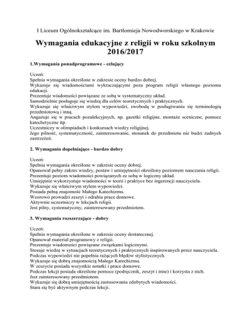 I Liceum Ogólnokształcące im. Bartłomieja Nowodworskiego w Krakowie Wymagania edukacyjne z religii w roku szkolnym 2016/2017 1.Wymagania ponadprogramowe - celujący Uczeń: Spełnia wymagania określone w zakresie oceny bardzo dobrej. Wykazuje się wiadomościami wykraczającymi poza program religii własnego poziomu edukacji. Prezentuje wiadomości powiązane ze sobą w systematyczny układ. Samodzielnie posługuje się wiedzą dla celów teoretycznych i praktycznych. Wykazuje się właściwym stylem wypowiedzi, swobodą w posługiwaniu się terminologią przedmiotową i inną. Angażuje się w pracach pozalekcyjnych, np. gazetki religijne, montaże sceniczne, pomoce katechetyczne itp. Uczestniczy w olimpiadach i konkursach wiedzy religijnej. Jego pilność, systematyczność, zainteresowanie, stosunek do przedmiotu nie budzi żadnych zastrzeżeń. 2. Wymagania dopełniające - bardzo dobry Uczeń: Spełnia wymagania określone w zakresie oceny dobrej. Opanował pełny zakres wiedzy, postaw i umiejętności określony poziomem nauczania religii. Prezentuje poziom wiadomości powiązanych ze sobą w logiczny układ. Umiejętnie wykorzystuje wiadomości w teorii i praktyce bez ingerencji nauczyciela. Wykazuje się właściwym stylem wypowiedzi. Posiada pełną znajomość Małego Katechizmu. Wzorowo prowadzi zeszyt i odrabia prace domowe. Aktywnie uczestniczy w lekcjach religii. Jest pilny, systematyczny, zainteresowany przedmiotem. 3. Wymagania rozszerzające - dobry Uczeń: Spełnia wymagania określone w zakresie oceny dostatecznej. Opanował materiał programowy z religii. Prezentuje wiadomości powiązane związkami logicznymi. Stosuje wiedzę w sytuacjach teoretycznych i praktycznych inspirowanych przez nauczyciela. Podczas wypowiedzi nie popełnia rażących błędów stylistycznych. Wykazuje się dobrą znajomością Małego Katechizmu. W zeszycie posiada wszystkie notatki i prace domowe. Podczas lekcji posiada określone pomoce (podręcznik, zeszyt i inne) i korzysta z nich. Jest zainteresowany przedmiotem. Wykazuje się dobrą umiejętnością zastosowania zdobytych wiadomości. Stara się być aktywnym podczas lekcji. 4. Wymagania podstawowe - dostateczny Uczeń: Opanował łatwe, całkowicie niezbędne wiadomości, postawy i umiejętności. Prezentuje podstawowe treści materiału programowego z religii. Wykazuje się wiadomościami podstawowymi, połączonymi związkami logicznymi. Potrafi stosować wiadomości dla celów praktycznych i teoretycznych przy pomocy nauczyciela. W przekazywaniu wiadomości z religii popełnia niewielkie i nieliczne błędy. Komunikuje wiedzę wybiórczo. Wykazuje się podstawową znajomością małego katechizmu. W zeszycie ucznia braki notatek, prac domowych. Prezentuje przeciętną pilność, systematyczność i zainteresowanie przedmiotem. 5. Wymagania konieczne - dopuszczający Uczeń: Opanował konieczne pojęcia religijne. Posiada luźno zestawiony poziom wiadomości programowych. Prezentuje mało zadowalający poziom postaw i umiejętności. Przejawia brak podstawowej umiejętności wyjaśniania zjawisk. Nie potrafi stosować wiedzy, nawet przy pomocy nauczyciela. Podczas przekazywania wiadomości popełnia liczne błędy, wykazuje niepoprawny styl wypowiedzi. Prowadzi zeszyt. Wykazuje poprawny stosunek do przedmiotu. I. Warunki i tryb podnoszenia oceny rocznej 1. O podniesienie oceny o jeden stopień może ubiegać się tylko uczeń, który prowadził w ciągu roku systematycznie zeszyt i może go przedstawić nauczycielowi. 2. Uczeń, który spełnia powyższe wymaganie, pisze sprawdzian z całego roku, który zawiera zagadnienia zgodne ze standardami wymagań edukacyjnych na dany stopień. 3. By podnieś ocenę musi zdobyć z tego sprawdzianu przynajmniej 76% przewidzianych punktów.