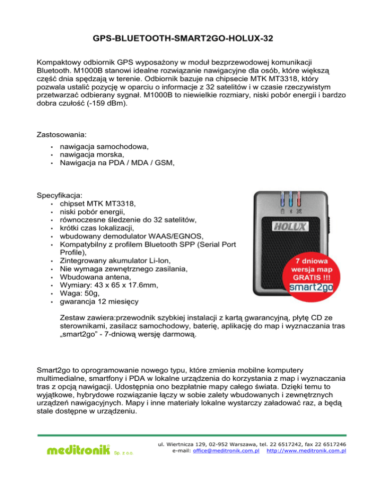 GPS-BLUETOOTH-SMART2GO-HOLUX-32 Kompaktowy odbiornik GPS wyposażony w moduł bezprzewodowej komunikacji Bluetooth. M1000B stanowi idealne rozwiązanie nawigacyjne dla osób, które większą część dnia spędzają w terenie. Odbiornik bazuje na chipsecie MTK MT3318, który pozwala ustalić pozycję w oparciu o informacje z 32 satelitów i w czasie rzeczywistym przetwarzać odbierany sygnał. M1000B to niewielkie rozmiary, niski pobór energii i bardzo dobra czułość (-159 dBm). Zastosowania: • • • nawigacja samochodowa, nawigacja morska, Nawigacja na PDA / MDA / GSM, Specyfikacja: • chipset MTK MT3318, • niski pobór energii, • równoczesne śledzenie do 32 satelitów, • krótki czas lokalizacji, • wbudowany demodulator WAAS/EGNOS, • Kompatybilny z profilem Bluetooth SPP (Serial Port Profile), • Zintegrowany akumulator Li-Ion, • Nie wymaga zewnętrznego zasilania, • Wbudowana antena, • Wymiary: 43 x 65 x 17.6mm, • Waga: 50g, • gwarancja 12 miesięcy Zestaw zawiera:przewodnik szybkiej instalacji z kartą gwarancyjną, płytę CD ze sterownikami, zasilacz samochodowy, baterię, aplikację do map i wyznaczania tras „smart2go” - 7-dniową wersję darmową. Smart2go to oprogramowanie nowego typu, które zmienia mobilne komputery multimedialne, smartfony i PDA w lokalne urządzenia do korzystania z map i wyznaczania tras z opcją nawigacji. Udostępnia ono bezpłatnie mapy całego świata. Dzięki temu to wyjątkowe, hybrydowe rozwiązanie łączy w sobie zalety wbudowanych i zewnętrznych urządzeń nawigacyjnych. Mapy i inne materiały lokalne wystarczy załadować raz, a będą stale dostępne w urządzeniu. ul. Wiertnicza 129, 02-952 Warszawa, tel. 22 6517242, fax 22 6517246 e-mail: [email protected] http://www.meditronik.com.pl Zestaw smart2go zawiera: • • • • • • aplikacja smart2go 1.0 dla urządzeń na Symbian: S60 wersja 3, S60 wersja 2.8 i urządzeń bazujących na Windows Mobile 5.0, Map Loader tool 1.1 do szybkiego doładowywania map i głosu, z komputera do urządzeń mobilnych, instrukcja obsługi dla urządzeń na S60 oraz przewodnik szybkiej, instalacji dla Windows Mobile 5.0 Platforma smart2go umożliwia korzystanie z map i wyznaczanie tras w ponad 150 krajach, a także pełną nawigację satelitarną w ponad 30 krajach. Użytkownicy mogą bezpłatnie wyświetlać na mapie swoje położenie, wyszukiwać punkty orientacyjne w okolicy oraz wyznaczać do nich trasy. Platforma zawiera ponad 15 milionów punktów orientacyjnych, dzięki którym można zwiedzić najciekawsze miejsca oraz znaleźć najlepsze restauracje i zakwaterowanie. Użytkownicy mogą wybierać ulubione lokalizacje i przesyłać je znajomym w wiadomościach multimedialnych lub e-mail, a także bezprzewodowo przez Bluetooth albo podczerwień. Przesyłać można również fragmenty map i trasy, a także zapisywać zrzuty ekranu z mapami do Galerii w urządzeniu. Firmy o znanych markach, będą mogły umieszczać markowe ikony na cyfrowych mapach świata pobieranych do milionów urządzeń mobilnych. ul. Wiertnicza 129, 02-952 Warszawa, tel. 22 6517242, fax 22 6517246 e-mail: [email protected] http://www.meditronik.com.pl