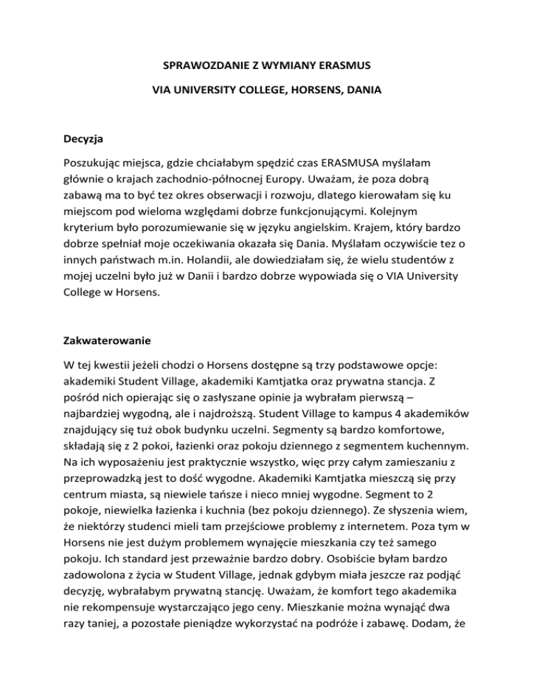 SPRAWOZDANIE Z WYMIANY ERASMUS VIA UNIVERSITY COLLEGE, HORSENS, DANIA Decyzja Poszukując miejsca, gdzie chciałabym spędzić czas ERASMUSA myślałam głównie o krajach zachodnio-północnej Europy. Uważam, że poza dobrą zabawą ma to być tez okres obserwacji i rozwoju, dlatego kierowałam się ku miejscom pod wieloma względami dobrze funkcjonującymi. Kolejnym kryterium było porozumiewanie się w języku angielskim. Krajem, który bardzo dobrze spełniał moje oczekiwania okazała się Dania. Myślałam oczywiście tez o innych państwach m.in. Holandii, ale dowiedziałam się, że wielu studentów z mojej uczelni było już w Danii i bardzo dobrze wypowiada się o VIA University College w Horsens. Zakwaterowanie W tej kwestii jeżeli chodzi o Horsens dostępne są trzy podstawowe opcje: akademiki Student Village, akademiki Kamtjatka oraz prywatna stancja. Z pośród nich opierając się o zasłyszane opinie ja wybrałam pierwszą – najbardziej wygodną, ale i najdroższą. Student Village to kampus 4 akademików znajdujący się tuż obok budynku uczelni. Segmenty są bardzo komfortowe, składają się z 2 pokoi, łazienki oraz pokoju dziennego z segmentem kuchennym. Na ich wyposażeniu jest praktycznie wszystko, więc przy całym zamieszaniu z przeprowadzką jest to dość wygodne. Akademiki Kamtjatka mieszczą się przy centrum miasta, są niewiele tańsze i nieco mniej wygodne. Segment to 2 pokoje, niewielka łazienka i kuchnia (bez pokoju dziennego). Ze słyszenia wiem, że niektórzy studenci mieli tam przejściowe problemy z internetem. Poza tym w Horsens nie jest dużym problemem wynajęcie mieszkania czy też samego pokoju. Ich standard jest przeważnie bardzo dobry. Osobiście byłam bardzo zadowolona z życia w Student Village, jednak gdybym miała jeszcze raz podjąć decyzję, wybrałabym prywatną stancję. Uważam, że komfort tego akademika nie rekompensuje wystarczająco jego ceny. Mieszkanie można wynająć dwa razy taniej, a pozostałe pieniądze wykorzystać na podróże i zabawę. Dodam, że kilka segmentów w Student Village miało problem z karaluchami. Z opcji Kamtjatka czy Student Village, pozostałabym jednak przy moim wyborze, gdyż tu różnica w cenie nie jest duża, a codzienne podróże na uczelnie (25min piechotą, 15min rowerem) bywają jednak uciążliwe, zwłaszcza podczas niemal nieustannego duńskiego deszczu;) Wyżywienie Weźcie z domu ile się da! Nie żartuję, szczególnie mięso, bo to chyba najdroższe. Bardzo drogie jest też „normalne” pieczywo, zwykle jada się chleby tostowe albo coś podobnego. Piwo można kupić w normalnych cenach, tego typu alkohol można tam pić w miejscach publicznych, nawet na uczelni, co nam niestety wydaje się być bardzo abstrakcyjne. Generalnie polecam przyglądać się promocjom, bo obniżki są spore i wtedy nie wychodzi to tak źle. Transport W Danii komunikacja miejska czy pociągi są bardzo drogie. Jednorazowy bilet na autobus w Horsens to 20dkk. Własne auto to naprawdę niezłe wyjście, tylko że na dłuższy okres trzeba go tam rejestrować. Odważniejszym w ramach podróży po kraju polecam wypróbowanego przeze mnie auto-stopa ☺ Jeśli chodzi o dostanie się do Danii to często kursują autobusy z różnych miast Polski i można zabrać nimi całkiem spory bagaż. Ja poleciałam tanimi liniami na lotnisko w Billund (ok. 50km od Horsens), a bagaż wysłałam kurierem i nie wyszło to bardzo drogo, a było naprawdę komfortowo. Uczelnia i studia VIA University College to chyba najlepsza uczelnia dla Erasmusów jaką można sobie wymarzyć! Głównie dlatego, że jest uczelnią o profilu międzynarodowym. Szansa na poznanie Duńczyków drastycznie spada, ale zjechali się tam ludzie naprawdę z całego świata. Dzięki temu studenci jak i nauczyciele przyzwyczajeni są do różnego poziomu językowego jak i przeróżnych akcentów, co wiąże się z dużą wyrozumiałością na tym polu. Głównym założeniem uniwersytetu jest też praca w grupach. Na początku semestru formuje się kilkuosobowe zespoły, w których część członków to tzw. studenci full-time, którzy są dobrze zorientowani i zwykle bardzo pomocni oraz kilka osób z wymiany. Zajęcia są prowadzone w sposób zdecydowanie bardziej praktyczny niż w Polsce. Konkretne zadania poprzedzone są wykładem dokładnie ich dotyczącym, co sprawia, że każda teoretyczna wiedza zostaje od razu wykorzystana. Uczelnia organizuje spotkania z potencjalnymi klientami wykonywanych projektów, wycieczki w miejsca ich powstawania oraz do różnego rodzaju fabryk, aby student mógł na własne oczy poznać proces budowlany. Według mnie, nie nauczymy się tam dużo o samym projektowaniu. W porównaniu z moją rodzimą uczelnią, jest na to kładziony dużo mniejszy nacisk, za to szkolimy się bardziej z zakresu budowlanego, prawa czy też zarządzania budową, własnym czasem, zarobkami. VIA jest uniwersytetem bardzo pro studenckim. Do nauczycieli zwracamy się po imieniu, podkreślają oni często żeby nie bać się pytać i korzystać z ich pomocy. Budynek jest niesamowicie dobrze wyposażony, ze sprzętu student może korzystać całą dobę, a drzwi otwiera za pomocą paska magnetycznego na legitymacji. Wieczorami organizuje się różne spotkania, korzysta z instrumentów muzycznych, Nindtendo Wii, dużych wyświetlaczy itp. Raz na jakiś czas uczelnia organizuje duże imprezy tematyczne, z DJ-em, barem i różnymi atrakcjami. Na początku semestru odbywa się RUSS WEEK- tydzień integracyjny, który wszystkim bardzo polecam. Generalnie mówiąc Horsens to niewielkie, malownicze miasteczko, które może wydawać się trochę ciche, ale liczba studentów o przeróżnej narodowości, kulturze i tradycjach sprawia, że naprawdę ciężko się tam nudzić. Podsumowanie Jedźcie! Nie bójcie się, podejmijcie decyzję i cieszcie się tym czasem tak jak ja! A gdy już pojedziecie bądźcie odważni i korzystajcie. Dla mnie było to