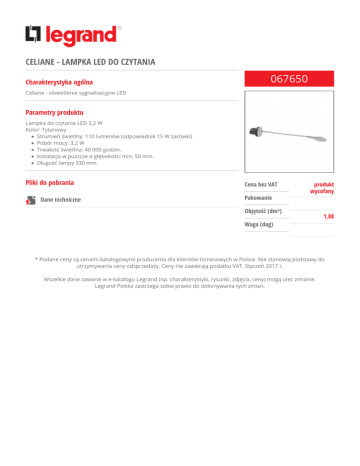 CELIANE - LAMPKA LED DO CZYTANIA Charakterystyka ogólna 067650 Celiane - oświetlenie sygnalizacyjne LED Parametry produktu Lampka do czytania LED 3,2 W Kolor: Tytanowy Strumień świetlny: 110 lumenów (odpowiednik 15 W żarówki) Pobór mocy: 3,2 W Trwałość świetlna: 40 000 godzin. Instalacja w puszcze o głębokości min. 50 mm. Długość lampy 330 mm. Pliki do pobrania Dane techniczne Cena bez VAT Pakowanie produkt wycofany Objętość (dm³) 1,88 Waga (dag) * Podane ceny są cenami katalogowymi producenta dla klientów biznesowych w Polsce. Nie stanowią podstawy do utrzymywania ceny odsprzedaży. Ceny nie zawierają podatku VAT. Styczeń 2017 r. Wszelkie dane zawarte w e-katalogu Legrand (np. charakterystyki, rysunki, zdjęcia, ceny) mogą ulec zmianie. Legrand Polska zastrzega sobie prawo do dokonywania tych zmian.
