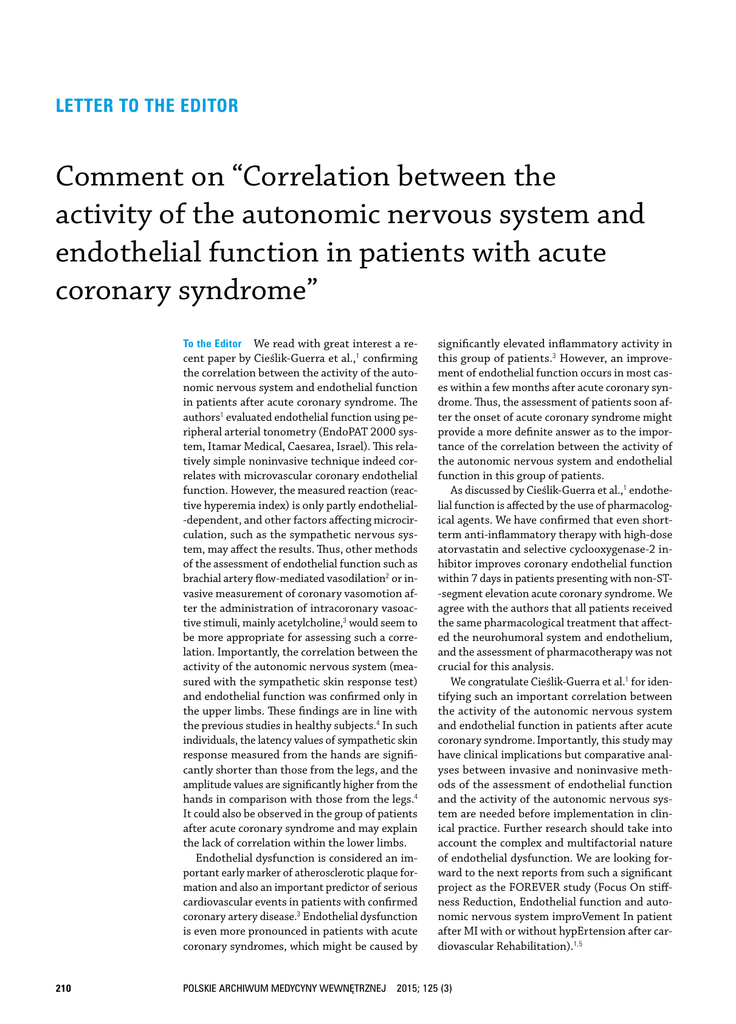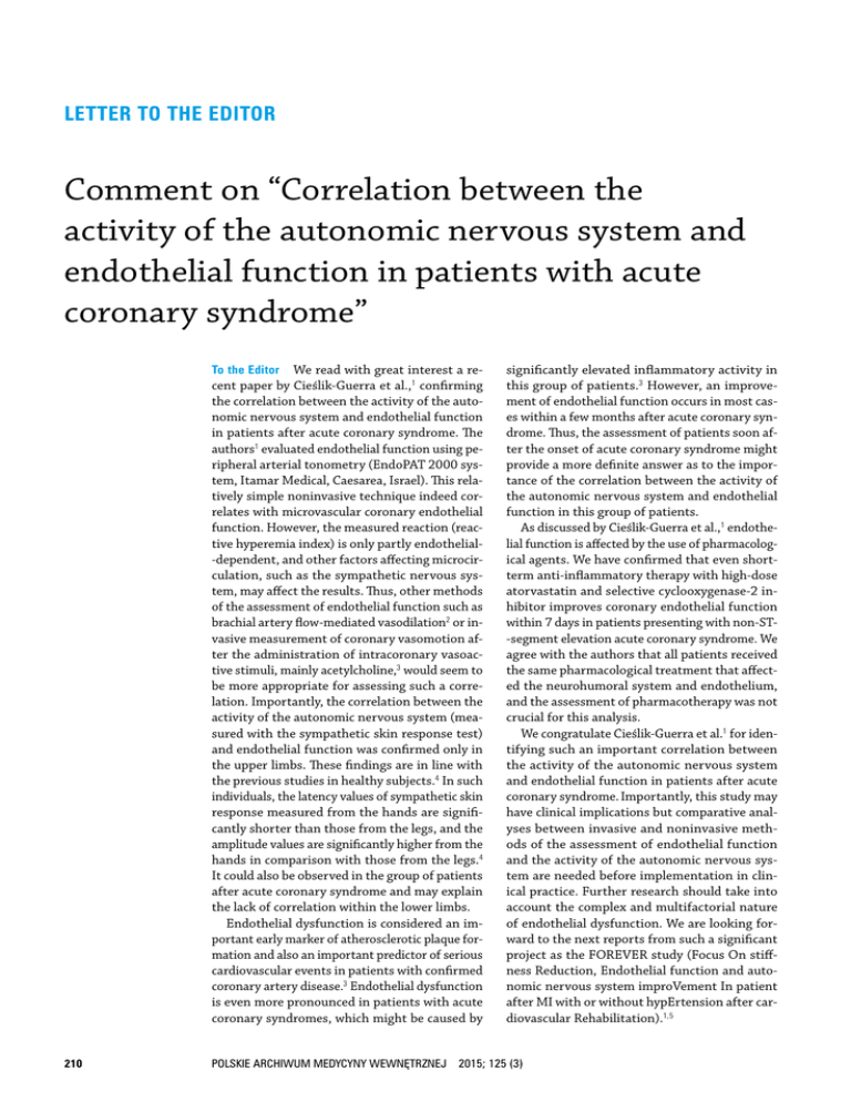 LETTER TO THE EDITOR Comment on “Correlation between the activity of the autonomic nervous systemand endothelial function in patients with acute coronary syndrome” To the Editor We read with great interest a re- cent paper by Cieślik-Guerra et al.,1 confirming the correlation between the activity of the autonomic nervous system and endothelial function in patients after acute coronary syndrome. The authors1 evaluated endothelial function using peripheral arterial tonometry (EndoPAT 2000 system, Itamar Medical, Caesarea, Israel). This relatively simple noninvasive technique indeed correlates with microvascular coronary endothelial function. However, the measured reaction (reactive hyperemia index) is only partly endothelial-dependent, and other factors affecting microcirculation, such as the sympathetic nervous system, may affect the results. Thus, other methods of the assessment of endothelial function such as brachial artery flow-mediated vasodilation2 or invasive measurement of coronary vasomotion after the administration of intracoronary vasoactive stimuli, mainly acetylcholine,3 would seem to be more appropriate for assessing such a correlation. Importantly, the correlation between the activity of the autonomic nervous system (measured with the sympathetic skin response test) and endothelial function was confirmed only in the upper limbs. These findings are in line with the previous studies in healthy subjects.4 In such individuals, the latency values of sympathetic skin response measured from the hands are significantly shorter than those from the legs, and the amplitude values are significantly higher from the hands in comparison with those from the legs.4 It could also be observed in the group of patients after acute coronary syndrome and may explain the lack of correlation within the lower limbs. Endothelial dysfunction is considered an important early marker of atherosclerotic plaque formation and also an important predictor of serious cardiovascular events in patients with confirmed coronary artery disease.3 Endothelial dysfunction is even more pronounced in patients with acute coronary syndromes, which might be caused by 210 significantly elevated inflammatory activity in this group of patients.3 However, an improvement of endothelial function occurs in most cases within a few months after acute coronary syndrome. Thus, the assessment of patients soon after the onset of acute coronary syndrome might provide a more definite answer as to the importance of the correlation between the activity of the autonomic nervous system and endothelial function in this group of patients. As discussed by Cieślik-Guerra et al.,1 endothelial function is affected by the use of pharmacological agents. We have confirmed that even shortterm anti-inflammatory therapy with high-dose atorvastatin and selective cyclooxygenase-2 inhibitor improves coronary endothelial function within 7 days in patients presenting with non-ST-segment elevation acute coronary syndrome. We agree with the authors that all patients received the same pharmacological treatment that affected the neurohumoral system and endothelium, and the assessment of pharmacotherapy was not crucial for this analysis. We congratulate Cieślik-Guerra et al.1 for identifying such an important correlation between the activity of the autonomic nervous system and endothelial function in patients after acute coronary syndrome. Importantly, this study may have clinical implications but comparative analyses between invasive and noninvasive methods of the assessment of endothelial function and the activity of the autonomic nervous system are needed before implementation in clinical practice. Further research should take into account the complex and multifactorial nature of endothelial dysfunction. We are looking forward to the next reports from such a significant project as the FOREVER study (Focus On stiffness Reduction, Endothelial function and autonomic nervous system improVement In patient after MI with or without hypErtension after cardiovascular Rehabilitation).1,5 POLSKIE ARCHIWUM MEDYCYNY WEWNĘTRZNEJ 2015; 125 (3) Author names and affiliations Artur Dziewierz, Michał Chyrchel, Dariusz Dudek (AD, MC: 2nd Department of Cardiology, Jagiellonian University Medical College, Kraków, Poland; DD: Department of Interventional Cardiology, Jagiellonian University Medical College, Kraków, Poland) Corresponding author Artur Dziewierz, MD, PhD, II Klinika Kardiologii, Instytut Kardiologii, Uniwersytet Jagielloński, Collegium Medicum, ul. Kopernika 17, 31-501 Kraków, Poland, phone: +48-12-424-71-81, fax: +48-12-424-71-84, e-mail: [email protected] Conflict of interest The authors declare no con- flict of interest. References 1 Cieślik-Guerra UI, Fila M, Kamiński M, et al. Correlation between the activity of the autonomic nervous system and endothelial function in patients with acute coronary syndrome. Pol Arch Med Wewn. 2014; 124: 509-515. 2 Wilk G, Osmenda G, Matusik P, et al. Endothelial function assessment in atherosclerosis: comparison of brachial artery flow‑mediated vasodilation and peripheral arterial tonometry. Pol Arch Med Wewn. 2013; 123: 443-452. 3 Chyrchel M, Dudek D, Rzeszutko L, et al. Effects of short-term anti-inflammatory therapy on endothelial function in patients with non-ST-segment elevation acute coronary syndrome. Cardiovasc Revasc Med. 2011; 12: 2-9. 4 Kucera P, Goldenberg Z, Kurca E. Sympathetic skin response: review of the method and its clinical use. Bratisl Lek Listy. 2004; 105: 108-116. 5 Cieślik-Guerra UI, Kamiński M, Kurpesa M. Correlations of pulse wave velocity with augmentation index and ambulatory arterial stiffness index in the population of patients after acute coronary syndrome. Preliminary results of the FOREVER study. Pol Arch Med Wewn. 2013; 123: 327-329. Authors’ reply We would like to thank Dr. Dzie- wierz and colleagues for their interest in our article and insightful comments. We appreciate their