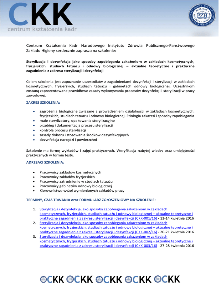 Centrum Kształcenia Kadr Narodowego Instytutu Zdrowia Publicznego-Paostwowego Zakładu Higieny serdecznie zaprasza na szkolenie: Sterylizacja i dezynfekcja jako sposoby zapobiegania zakażeniom w zakładach kosmetycznych, fryzjerskich, studiach tatuażu i odnowy biologicznej – aktualne teoretyczne i praktyczne zagadnienia z zakresu sterylizacji i dezynfekcji Celem szkolenia jest zapoznanie uczestników z zagadnieniami dezynfekcji i sterylizacji w zakładach kosmetycznych, fryzjerskich, studiach tatuażu i gabinetach odnowy biologicznej. Uczestnikom zostaną zaprezentowane prawidłowe zasady wykonywania procesów dezynfekcji i sterylizacji w pracy zawodowej. ZAKRES SZKOLENIA: zagrożenia biologiczne związane z prowadzeniem działalności w zakładach kosmetycznych, fryzjerskich, studiach tatuażu i odnowy biologicznej. Etiologia zakażeo i sposoby zapobiegania małe sterylizatory, opakowania sterylizacyjne przebieg i dokumentacja procesu sterylizacji kontrola procesu sterylizacji zasady doboru i stosowania środków dezynfekcyjnych dezynfekcja narzędzi i powierzchni Szkolenie ma formę wykładów i zajęd praktycznych. Weryfikacja nabytej wiedzy oraz umiejętności praktycznych w formie testu. ADRESACI SZKOLENIA: Pracownicy zakładów kosmetycznych Pracownicy zakładów fryzjerskich Pracownicy zatrudnienie w studiach tatuażu Pracownicy gabinetów odnowy biologicznej Kierownictwo wyżej wymienionych zakładów pracy TERMINY, CZAS TRWANIA oraz FORMULARZ ZGŁOSZENIOWY NA SZKOLENIE: 1. Sterylizacja i dezynfekcja jako sposoby zapobiegania zakażeniom w zakładach kosmetycznych, fryzjerskich, studiach tatuażu i odnowy biologicznej – aktualne teoretyczne i praktyczne zagadnienia z zakresu sterylizacji i dezynfekcji (CKK-001/16) - 13-14 kwietnia 2016 2. Sterylizacja i dezynfekcja jako sposoby zapobiegania zakażeniom w zakładach kosmetycznych, fryzjerskich, studiach tatuażu i odnowy biologicznej – aktualne teoretyczne i praktyczne zagadnienia z zakresu sterylizacji i dezynfekcji (CKK-002/16) - 20-21 kwietnia 2016 3. Sterylizacja i dezynfekcja jako sposoby zapobiegania zakażeniom w zakładach kosmetycznych, fryzjerskich, studiach tatuażu i odnowy biologicznej – aktualne teoretyczne i praktyczne zagadnienia z zakresu sterylizacji i dezynfekcji (CKK-003/16) - 27-28 kwietnia 2016 ZAPISY od dnia 2 lutego 2016 r. do dnia 17 marca 2016 r., należy wypełnid formularz zgłoszeniowy na stronie internetowej: http://www.ckk.nizp.pzh.gov.pl Liczba miejsc ograniczona, decyduje kolejnośd zgłoszeo. CENA SZKOLENIA 700 zł od osoby* *szkolenie jest zwolnione z podatku VAT na podstawie $ 3 ust.1 pkt 14 rozporządzenia Ministra Finansów z dnia 20.12.2013 r., w sprawie zwolnieo od podatku od towarów i usług oraz warunków stosowania tych zwolnieo (Dz. U. z 2013 r. poz. 1772) KOSZT UCZESTNICTWA OBEJMUJE udział w szkoleniu, materiały dydaktyczne, możliwośd konsultacji z wykładowcami przerwy kawowe i obiadowe certyfikat potwierdzający udział w szkoleniu Cena nie obejmuje kosztów zakwaterowania oraz dojazdu. MIEJSCE SZKOLENIA Narodowy Instytut Zdrowia Publicznego – Paostwowy Zakład Higieny ul. Chocimska 24; 00 – 791 Warszawa KONTAKT: INFORMACJE MERYTORYCZNE Dr n. biol. Agnieszka Chojecka: [email protected] INFORMACJE ORGANIZACYJNE Pytania prosimy kierowad pod adres e-mail: [email protected] lub telefonicznie: Jolanta Muszyoska: tel. 22 54 21 380