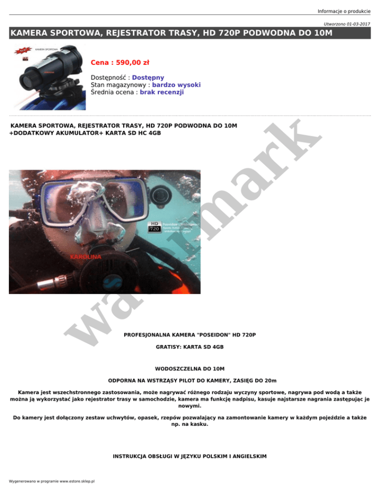 Informacje o produkcie Utworzono 01-03-2017 KAMERA SPORTOWA, REJESTRATOR TRASY, HD 720P PODWODNA DO 10M Cena : 590,00 zł Dostępność : Dostępny Stan magazynowy : bardzo wysoki Średnia ocena : brak recenzji w at er m ar k KAMERA SPORTOWA, REJESTRATOR TRASY, HD 720P PODWODNA DO 10M +DODATKOWY AKUMULATOR+ KARTA SD HC 4GB PROFESJONALNA KAMERA "POSEIDON" HD 720P GRATISY: KARTA SD 4GB WODOSZCZELNA DO 10M ODPORNA NA WSTRZĄSY PILOT DO KAMERY, ZASIĘG DO 20m Kamera jest wszechstronnego zastosowania, może nagrywać różnego rodzaju wyczyny sportowe, nagrywa pod wodą a także można ją wykorzystać jako rejestrator trasy w samochodzie, kamera ma funkcję nadpisu, kasuje najstarsze nagrania zastępując je nowymi. Do kamery jest dołączony zestaw uchwytów, opasek, rzepów pozwalający na zamontowanie kamery w każdym pojeździe a także np. na kasku. INSTRUKCJA OBSŁUGI W JĘZYKU POLSKIM I ANGIELSKIM Wygenerowano w programie www.estore.sklep.pl GWARANCJA 12 MIESIĘCY Kamera posiada certyfikaty CE, RoHS, Fcc Dane techniczne: § Rozdzielczość video: 1280x720 lub 640x480 § Szybkość zapisu 60 klatek/sekundę lub 30klatek/sekundę Format: AVI Wbudowany mikrofon Obiektyw szerokokątny 120 stopni Sensor: CMOS o rozdzielczości 5MP er m ar k Pamięć: wbudowana 64MB Zapisuje obraz i dźwięk: karty SDHC/SD od 1GB do 32GB ( nie ma zestawie ) Zasilanie: bateria 1700 mAh/3,7V lub zasilacz 230V Kamera wodoodporna do 10 m Wskaźnik laserowy zasięg do 20 m ( czerwony ) Kamera współpracuje z pilotem zdalnego sterowania § Wyjście: TV/OUT i HDMI § Wymiary: 12,9 x 5,35 x 7,2 cm § Waga: 160g § Interfejs: Mini port USB (USB 2.0) W zestawie znajduje się: at Wodoodporna kamera HD 720p - sztuk 1 Kabel USB - sztuk 1 Kabel TV ---sztuk 1 Kabel HDMI - szt. 1 w Bateria 1700mAH/3,7V - szt. 1 Pilot zdalnego sterowania - szt. 1 Zasilacz sieciowy 230V - szt. 1 Ładowarka do baterii - szt. 1 Zestaw uchwytów, opasek, rzepów do mocowania kamery - zest. 1 Instrukcja obsługi w j. polskim - szt. 1 Instrukcja obsługi w j. angielskim - szt. 1 Płyta CD ze sterownikami - szt 1 Karta pamięci SD HC 4GB Gwarancja 12 miesięcy