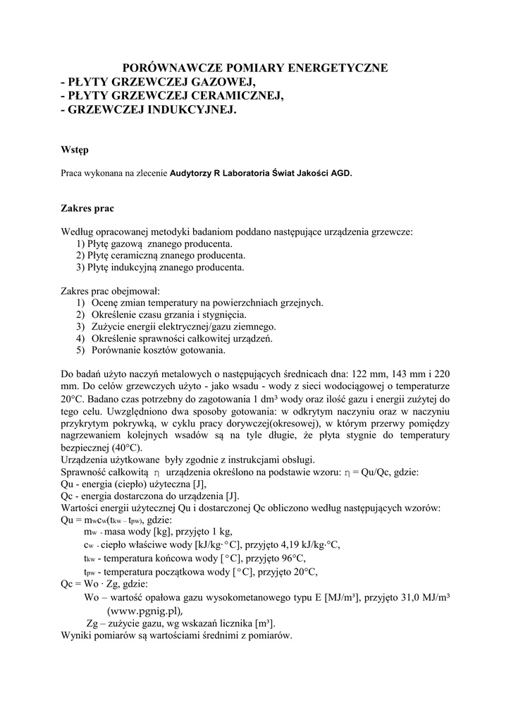 PORÓWNAWCZE POMIARY ENERGETYCZNE - PŁYTY GRZEWCZEJ GAZOWEJ, - PŁYTY GRZEWCZEJ CERAMICZNEJ, - GRZEWCZEJ INDUKCYJNEJ. Wstęp Praca wykonana na zlecenie Audytorzy R Laboratoria Świat Jakości AGD. Zakres prac Według opracowanej metodyki badaniom poddano następujące urządzenia grzewcze: 1) Płytę gazową znanego producenta. 2) Płytę ceramiczną znanego producenta. 3) Płytę indukcyjną znanego producenta. Zakres prac obejmował: 1) Ocenę zmian temperatury na powierzchniach grzejnych. 2) Określenie czasu grzania i stygnięcia. 3) Zużycie energii elektrycznej/gazu ziemnego. 4) Określenie sprawności całkowitej urządzeń. 5) Porównanie kosztów gotowania. Do badań użyto naczyń metalowych o następujących średnicach dna: 122 mm, 143 mm i 220 mm. Do celów grzewczych użyto - jako wsadu - wody z sieci wodociągowej o temperaturze 20C. Badano czas potrzebny do zagotowania 1 dm³ wody oraz ilość gazu i energii zużytej do tego celu. Uwzględniono dwa sposoby gotowania: w odkrytym naczyniu oraz w naczyniu przykrytym pokrywką, w cyklu pracy dorywczej(okresowej), w którym przerwy pomiędzy nagrzewaniem kolejnych wsadów są na tyle długie, że płyta stygnie do temperatury bezpiecznej (40C). Urządzenia użytkowane były zgodnie z instrukcjami obsługi. Sprawność całkowitą η urządzenia określono na podstawie wzoru: η = Qu/Qc, gdzie: Qu - energia (ciepło) użyteczna [J], Qc - energia dostarczona do urządzenia [J]. Wartości energii użytecznej Qu i dostarczonej Qc obliczono według następujących wzorów: Qu mwcw(tkw – tpw), gdzie: mw - masa wody [kg], przyjęto 1 kg, cw - ciepło właściwe wody [kJ/kg∙ºC], przyjęto 4,19 kJ/kgC, tkw - temperatura końcowa wody [ºC], przyjęto 96C, tpw - temperatura początkowa wody [ºC], przyjęto 20C, Qc Wo ∙ Zg, gdzie: Wo – wartość opałowa gazu wysokometanowego typu E [MJ/m³], przyjęto 31,0 MJ/m³ (www.pgnig.pl), Zg – zużycie gazu, wg wskazań licznika [m³]. Wyniki pomiarów są wartościami średnimi z pomiarów. I. Płyta gazowa. 1. Wyniki badań płyty gazowej – palnik 1000W, garnek odkryty. Charakterystyka badanego elementu: palnik 1000W, nastawa maksymalna, garnek o dnie 122 mm, sposób gotowania – w garnku odkrytym. Warunki środowiska: temperatura otoczenia 20[0C], wilgotność względna 38[%], ciśnienie atmosferyczne 990 [hPa], napięcie zasilania 230[V], temp. początkowa wody 20[ºC]. Tabela 1. Wyniki badań płyty gazowej – garnek 122 mm, odkryty, palnik 1000W. Parametr Wyniki badań Niepewność (wartości średnie) standardowa pomiaru Czas nagrzewania wody do temp. 96ºC 14 min 43 s 12,2 s 0,0264 m³ 0,0004 m³ Czas stygnięcia płyty grzewczej do 40ºC 30 min - Sprawność całkowita płyty grzewczej 38,9 % 0,5 Zużycie gazu 2. Wyniki badań płyty gazowej – palnik 1500W, garnek odkryty. Charakterystyka badanego elementu: palnik 1500W, nastawa maksymalna, garnek o dnie 143 mm, sposób gotowania – w garnku odkrytym. Warunki środowiska: temperatura 20[0C], wilgotność względna 38[%], ciśnienie atmosferyczne 990[hPa], napięcie zasilania 230[V], temp. początkowa wody 20[ºC]. Tabela 2. Wyniki badań płyty gazowej – garnek 143 mm, odkryty, palnik 1500W. Parametr Wyniki badań Niepewność (wartości średnie) standardowa pomiaru Czas nagrzewania wody do temp. 96ºC 9 min 11 s 14,9 s Zużycie gazu 0,0273 m³ 0,0006 m³ Czas stygnięcia płyty grzewczej do 40ºC 33 min - Sprawność całkowita płyty grzewczej 37,6 % 0,8 3. Wyniki badań płyty gazowej – palnik 3300W, garnek odkryty. Charakterystyka badanego elementu: palnik 3300W, nastawa maksymalna, garnek o dnie 220 mm, sposób gotowania – w garnku odkrytym. Warunki środowiska: temperatura 20[0C], wilgotność względna 38[%], ciśnienie atmosferyczne 990[hPa], napięcie zasilania 230[V], temp. początkowa wody 20[ºC]. Tabela 3. Wyniki badań płyty gazowej – garnek 220 mm, odkryty, palnik 3300W. Parametr Wyniki badań Niepewność (wartości średnie) standardowa pomiaru Czas nagrzewania wody do temp. 96ºC 6 min 05 s 1,5 s Zużycie gazu 0,0431 m³ 0,0004 m³ Czas stygnięcia płyty grzewczej do 40ºC 39 min - Sprawność całkowita płyty grzewczej 23,8 % 0,2 4. Wyniki badań płyty gazowej – palnik 1000W, garnek przykryty. Charakterystyka badanego elementu: palnik 1000W, nastawa maksymalna, garnek o dnie 122 mm, sposób gotowania – w garnku przykrytym. Warunki środowiska: temperatura otoczenia 20[0C], wilgotność względna 38[%], ciśnienie atmosferyczne 990 [hPa], napięcie zasilania 230[V], temp. początkowa wody 20[ºC]. Tabela 4. Wyniki badań płyty gazowej – garnek 122 mm, przykryty, palnik 1000W. Parametr Wyniki badań Niepewność (wartości średnie) standardowa pomiaru Czas nagrzewania wody do temp. 96ºC 12 min 30 s 8,9 s 0,0222 m³ 0,0002 m³ Czas stygnięcia płyty grzewczej do 40ºC 31 min - Sprawność całkowita płyty grzewczej 46,3 % 0,5 Zużycie gazu 5. Wyniki badań płyty gazowej – palnik 1500W, garnek przykryty. Charakterystyka badanego elementu: palnik 1500W, nastawa maksymalna, garnek o dnie 143 mm, sposób gotowana – w garnku przykrytym pokrywką. Warunki środowiska: temperatura 20[0C], wilgotność względna 38[%], ciśnienie atmosferyczne 990[hPa], napięcie zasilania 230[V], temp. początkowa wody 20[ºC]. Tabela 5. Wyniki badań płyty gazowej – garnek 143 mm, z pokrywką, palnik 1500 W. Parametr Wyniki badań Niepewność (wartości średnie) standardowa pomiaru Czas nagrzewania wody do temp. 96ºC 8 min 32 s 7,6 s Zużycie gazu 0,0247 m³ 0,0003 m³ Czas stygnięcia płyty grzewczej do 40ºC 34 min - Sprawność całkowita płyty grzewczej 41,6 % 0,3 6. Wyniki badań płyty gazowej – palnik 3300W, garnek przykryty. Charakterystyka badanego elementu: palnik 3300W, nastawa maksymalna, garnek o dnie 220 mm, sposób gotowania – w garnku przykrytym. Warunki środowiska: temperatura 20[0C], wilgotność względna 38[%], ciśnienie atmosferyczne 990[hPa], napięcie zasilani