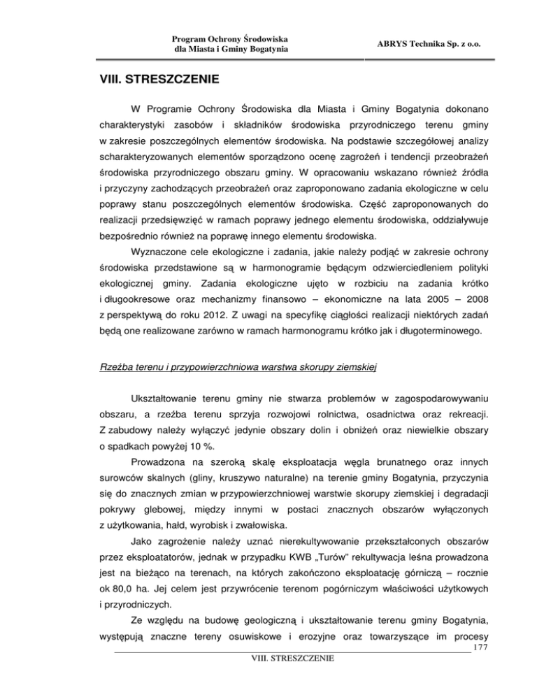 Program Ochrony Środowiska dla Miasta i Gminy Bogatynia ABRYS Technika Sp. z o.o. VIII. STRESZCZENIE W Programie Ochrony Środowiska dla Miasta i Gminy Bogatynia dokonano charakterystyki zasobów i składników środowiska przyrodniczego terenu gminy w zakresie poszczególnych elementów środowiska. Na podstawie szczegółowej analizy scharakteryzowanych elementów sporządzono ocenę zagrożeń i tendencji przeobrażeń środowiska przyrodniczego obszaru gminy. W opracowaniu wskazano również źródła i przyczyny zachodzących przeobrażeń oraz zaproponowano zadania ekologiczne w celu poprawy stanu poszczególnych elementów środowiska. Część zaproponowanych do realizacji przedsięwzięć w ramach poprawy jednego elementu środowiska, oddziaływuje bezpośrednio również na poprawę innego elementu środowiska. Wyznaczone cele ekologiczne i zadania, jakie należy podjąć w zakresie ochrony środowiska przedstawione są w harmonogramie będącym odzwierciedleniem polityki ekologicznej gminy. Zadania ekologiczne ujęto w rozbiciu na zadania krótko i długookresowe oraz mechanizmy finansowo – ekonomiczne na lata 2005 – 2008 z perspektywą do roku 2012. Z uwagi na specyfikę ciągłości realizacji niektórych zadań będą one realizowane zarówno w ramach harmonogramu krótko jak i długoterminowego. Rzeźba terenu i przypowierzchniowa warstwa skorupy ziemskiej Ukształtowanie terenu gminy nie stwarza problemów w zagospodarowywaniu obszaru, a rzeźba terenu sprzyja rozwojowi rolnictwa, osadnictwa oraz rekreacji. Z zabudowy należy wyłączyć jedynie obszary dolin i obniżeń oraz niewielkie obszary o spadkach powyżej 10 %. Prowadzona na szeroką skalę eksploatacja węgla brunatnego oraz innych surowców skalnych (gliny, kruszywo naturalne) na terenie gminy Bogatynia, przyczynia się do znacznych zmian w przypowierzchniowej warstwie skorupy ziemskiej i degradacji pokrywy glebowej, między innymi w postaci znacznych obszarów wyłączonych z użytkowania, hałd, wyrobisk i zwałowiska. Jako zagrożenie należy uznać nierekultywowanie przekształconych obszarów przez eksploatatorów, jednak w przypadku KWB „Turów” rekultywacja leśna prowadzona jest na bieżąco na terenach, na których zakończono eksploatację górniczą – rocznie ok 80,0 ha. Jej celem jest przywrócenie terenom pogórniczym właściwości użytkowych i przyrodniczych. Ze względu na budowę geologiczną i ukształtowanie terenu gminy Bogatynia, występują znaczne tereny osuwiskowe i erozyjne oraz towarzyszące im procesy 177 VIII. STRESZCZENIE Program Ochrony Środowiska dla Miasta i Gminy Bogatynia ABRYS Technika Sp. z o.o. spełzywania i obrywania gruntu. Występowanie tych procesów w znaczny sposób przyczynia się do zmian w rzeźbie terenu. Inną formą przekształcenia przypowierzchniowej warstwie skorupy ziemskiej są istniejące składowiska. Na terenie gminy Bogatynia, na peryferiach północnej części miasta Bogatynia zlokalizowane jest składowisko odpadów komunalnych, które posiada uregulowany stan formalno – prawny. Problem stanowią również istniejące „dzikie” wysypiska śmieci. Wody podziemne i powierzchniowe • Wody podziemne Eksploatacja wód podziemnych do picia i na potrzeby gospodarcze na terenie gminy bazuje głównie na zasobach wód powierzchniowych (rzeka Nysa Łużycka i Miedzianka) oraz wód podziemnych czwartorzędowych. W obrębie gminy Bogatynia woda ujmowana jest z wód podskórnych, które przeznaczone są przede wszystkim do zaopatrzenia ludności w dobrej jakości wodę do picia. Na jakość wód podziemnych na analizowanym terenie wpływ mają istniejące tu warunki hydrogeologiczne oraz formy prowadzonej działalności. Na podstawie wyników pochodzących z punktów badawczych monitoringu państwowego można stwierdzić, że wody podziemne regionu (poziom czwartorzędowy) charakteryzują się wysoką jakością – Ib klasa czystości, czyli naturalnie i słabo zanieczyszczone antropogenicznie, odpowiadające wodom do celów pitnych i gospodarczych, okresowo wymagające uzdatnienia oraz średnią jakością – klasa II. PIG w latach 1991 – 2003 na terenie województwa dolnośląskiego w jakości wód podziemnych wykazuje tendencję zmniejszania się wód najwyższej i wysokiej jakości na korzyść wód średniej i niskiej jakości. Badania wykazały, że nie występuje problem zanieczyszczenia wód azotanami z terenów rolniczych. W celu polepszenia jakości ujmowanych wód, należy zadbać o jak najszybszy rozwój sieci kanalizacyjnej na terenie Powiatu Zgorzeleckiego, a tym samym gminy Bogatynia. Ograniczy on w dużym stopniu zagrożenie obniżenia jakości wód podziemnych na skutek zanieczyszczeń pochodzących gospodarczych. 178 VIII. STRESZCZENIE ze ścieków bytowo- Program Ochrony Środowiska dla Miasta i Gminy Bogatynia • ABRYS Technika Sp. z o.o. Wody powierzchniowe Stan czystości rzek Stan czystości cieków na terenie gminy jest niezadowalający i wymaga podjęcia zdecydowanych działań w kierunku uporządkowania gospodarki wodno – ściekowej z naciskiem na rozbudowę kanalizacji sanitarnej. Rzeka Nysa Łużycka – ostatnie badania jakości wód rzeki wykonano w 2003 roku, w wyniku których zakwalifikowano je do wód pozaklasowych ze względu na stan sanitarny. Jednak porównanie wartości wskaźników zanieczyszczeń we wszystkich badanych przekrojach wskazuje powolne, lecz systematyczne obniżanie się stężeń związków organicznych i biogennych wzdłuż biegu rzeki aż do Zgorzelca. Na terenie gminy Bogatynia głównym źródłem zanieczyszczenia rzeki stanowi miasto Bogatynia i miejscowość Sieniawka (oczyszczalnie ścieków, które wprowadzają do odbiornika ok. 5 487 m3/d ścieków), zakłady przemysłowe (KWB „Turów”, Elektrownia „Turów”) oraz spływy powierzchniowe z pól. Ocena jakości wód w rzece Nysie Łużyckiej w latach 1993 – 2003 wykazała w wodzie wpływającej na teren Polski z Republik