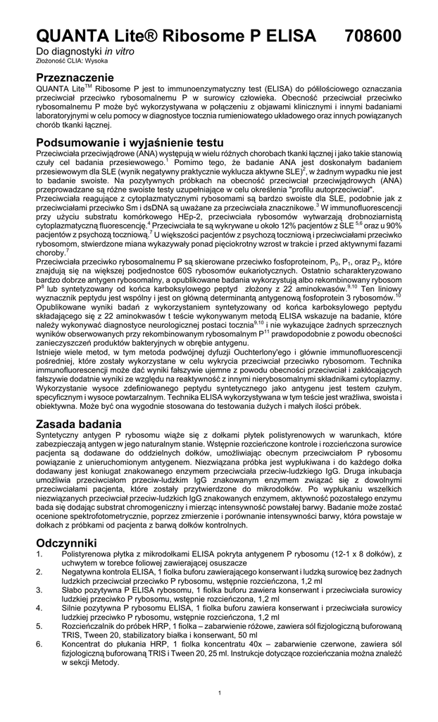 QUANTA Lite® Ribosome P ELISA 708600 Do diagnostyki in vitro Złożoność CLIA: Wysoka Przeznaczenie QUANTA LiteTM Ribosome P jest to immunoenzymatyczny test (ELISA) do półilościowego oznaczania przeciwciał przeciwko rybosomalnemu P w surowicy człowieka. Obecność przeciwciał przeciwko rybosomalnemu P może być wykorzystywana w połączeniu z objawami klinicznymi i innymi badaniami laboratoryjnymi w celu pomocy w diagnostyce tocznia rumieniowatego układowego oraz innych powiązanych chorób tkanki łącznej. Podsumowanie i wyjaśnienie testu Przeciwciała przeciwjądrowe (ANA) występują w wielu różnych chorobach tkanki łącznej i jako takie stanowią czuły cel badania przesiewowego.1 Pomimo tego, że badanie ANA jest doskonałym badaniem przesiewowym dla SLE (wynik negatywny praktycznie wyklucza aktywne SLE)2, w żadnym wypadku nie jest to badanie swoiste. Na pozytywnych próbkach na obecność przeciwciał przeciwjądrowych (ANA) przeprowadzane są różne swoiste testy uzupełniające w celu określenia "profilu autoprzeciwciał". Przeciwciała reagujące z cytoplazmatycznymi rybosomami są bardzo swoiste dla SLE, podobnie jak z przeciwciałami przeciwko Sm i dsDNA są uważane za przeciwciała znacznikowe.3 W immunofluorescencji przy użyciu substratu komórkowego HEp-2, przeciwciała rybosomów wytwarzają drobnoziarnistą cytoplazmatyczną fluorescencję.4 Przeciwciała te są wykrywane u około 12% pacjentów z SLE 5,6 oraz u 90% pacjentów z psychozą toczniową.7 U większości pacjentów z psychozą toczniową i przeciwciałami przeciwko rybosomom, stwierdzone miana wykazywały ponad pięciokrotny wzrost w trakcie i przed aktywnymi fazami choroby.7 Przeciwciała przeciwko rybosomalnemu P są skierowane przeciwko fosfoproteinom, P0, P1, oraz P2, które znajdują się na większej podjednostce 60S rybosomów eukariotycznych. Ostatnio scharakteryzowano bardzo dobrze antygen rybosomalny, a opublikowane badania wykorzystują albo rekombinowany rybosom P8 lub syntetyzowany od końca karboksylowego peptyd złożony z 22 aminokwasów.9,10 Ten liniowy wyznacznik peptydu jest wspólny i jest on główną determinantą antygenową fosfoprotein 3 rybosomów.10 Opublikowane wyniki badań z wykorzystaniem syntetyzowany od końca karboksylowego peptydu składającego się z 22 aminokwasów t teście wykonywanym metodą ELISA wskazuje na badanie, które należy wykonywać diagnostyce neurologicznej postaci tocznia9,10 i nie wykazujące żadnych sprzecznych wyników obserwowanych przy rekombinowanym rybosomalnym P11 prawdopodobnie z powodu obecności zanieczyszczeń produktów bakteryjnych w obrębie antygenu. Istnieje wiele metod, w tym metoda podwójnej dyfuzji Ouchterlony'ego i głównie immunofluorescencji pośredniej, które zostały wykorzystane w celu wykrycia przeciwciał przeciwko rybosomom. Technika immunofluorescencji może dać wyniki fałszywie ujemne z powodu obecności przeciwciał i zakłócających fałszywie dodatnie wyniki ze względu na reaktywność z innymi nierybosomalnymi składnikami cytoplazmy. Wykorzystanie wysoce zdefiniowanego peptydu syntetycznego jako antygenu jest testem czułym, specyficznym i wysoce powtarzalnym. Technika ELISA wykorzystywana w tym teście jest wrażliwa, swoista i obiektywna. Może być ona wygodnie stosowana do testowania dużych i małych ilości próbek. Zasada badania Syntetyczny antygen P rybosomu wiąże się z dołkami płytek polistyrenowych w warunkach, które zabezpieczają antygen w jego naturalnym stanie. Wstępnie rozcieńczone kontrole i rozcieńczona surowice pacjenta są dodawane do oddzielnych dołków, umożliwiając obecnym przeciwciałom P rybosomu powiązanie z unieruchomionym antygenem. Niezwiązana próbka jest wypłukiwana i do każdego dołka dodawany jest koniugat znakowanego enzymem przeciwciała przeciw-ludzkiego IgG. Druga inkubacja umożliwia przeciwciałom przeciw-ludzkim IgG znakowanym enzymem związać się z dowolnymi przeciwciałami pacjenta, które zostały przytwierdzone do mikrodołków. Po wypłukaniu wszelkich niezwiązanych przeciwciał przeciw-ludzkich IgG znakowanych enzymem, aktywność pozostałego enzymu bada się dodając substrat chromogeniczny i mierząc intensywność powstałej barwy. Badanie może zostać ocenione spektrofotometrycznie, poprzez zmierzenie i porównanie intensywności barwy, która powstaje w dołkach z próbkami od pacjenta z barwą dołków kontrolnych. Odczynniki 1. 2. 3. 4. 5. 6. Polistyrenowa płytka z mikrodołkami ELISA pokryta antygenem P rybosomu (12-1 x 8 dołków), z uchwytem w torebce foliowej zawierającej osuszacze Negatywna kontrola ELISA, 1 fiolka buforu zawierającego konserwant i ludzką surowicę bez żadnych ludzkich przeciwciał przeciwko P rybosomu, wstępnie rozcieńczona, 1,2 ml Słabo pozytywna P ELISA rybosomu, 1 fiolka buforu zawiera konserwant i przeciwciała surowicy ludzkiej przeciwko P rybosomu, wstępnie rozcieńczona, 1,2 ml Silnie pozytywna P rybosomu ELISA, 1 fiolka buforu zawiera konserwant i przeciwciała surowicy ludzkiej przeciwko P rybosomu, wstępnie rozcieńczona, 1,2 ml Rozcieńczalnik do próbek HRP, 1 fiolka – zabarwienie różowe, zawiera sól fizjologiczną buforowaną TRIS, Tween 20, stabilizatory białka i konserwant, 50 ml Koncentrat do płukania HRP, 1 fiolka koncentratu 40x – zabarwienie czerwone, zawiera sól fizjologiczną buforowaną TRIS i Tween 20, 25 ml. Instrukcje dotyczące rozcieńczania można znaleźć w sekcji Metody. 1 7. 8. 9. Koniugat HRP IgG, (kozi), przeciwciała przeciw-ludzkie IgG, 1 fiolka – zabarwienie niebieskie, zawiera bufor, stabilizatory białka i konserwant, 10 ml Chromogen TMB, 1 fiolka zawierająca stabilizatory, 10 ml Roztwór zatrzymujący HRP, kwas siarkowy 0,344 M, 1 fiolka – bezbarwny, 10 ml Ostrzeżenia 1. 2. 3. 4. 5. 6. 7. 8. OSTRZEŻENIE: Ten produkt zawiera substancję chemiczną (0,02% chloramfenikol) w rozcieńczalniku do próbek, kontrolach i koniugacie, która 