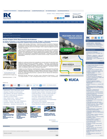 SERWISY PARTNERSKIE transport-publiczny.pl rynekinfrastruktury.pl tor-konferencje.pl ceerailwaymarket.eu Sylwetki Praca Katalog Kolejowy Redakcja Partnerzy portalu: Biznes Infrastruktura Prawo i polityka Przetargi Tabor i technika Pasażer Zintegrowany Transport KDP Świat Warte uwagi Kadry Spis treści Prenumerata Kategoria: Pasażer Data dodania: 2015-12-19 11:16:33 (źródło: Łukasz Kuś, Rynek Kolejowy) Ruszył Dragon Kolei Mazowieckich do Krakowa Praca W sobotę 19 grudnia o 9.19 rozpoczął kursowanie pociąg "Dragon" z Warszawy Wschodniej do Krakowa. Weekendowe połączenie uzupełnia ofertę przewozową Kolei Mazowieckich. HANDLOWIEC / SPEDYTOR / SPECJALISTA DS. TRANSPORTU KOLEJOWEGO (MULTIMODALNEGO) "Dragon" obok pociągu "Słoneczny" z Warszawy do Gdyni to kolejna propozycja dalekobieżna samorządowej spółki. Jest to połączenie komercyjne, podobne do połączeń Interregio, które do niedawna oferowały Przewozy Regionalne. Koleje Mazowieckie liczą na popularność pociągów, które mają przyciągnąć zwłaszcza turystów i studentów. Analityk Biznesowy/Finansowy więcej » - Dla Kolei Mazowieckich połączenia dalekobieżne są sposobem na wykorzystanie taboru, który w weekendy nie jest wykorzystywany do przewozów w regionie. Uruchamianie połączeń komercyjnych zależne jest od zgody władz samorządu regionu i nie może kolidować z naszą podstawową działalnością, jaką jest usługa publiczna dla mieszkańców województwa mazowieckiego – powiedział na pokładzie pierwszego rozkładowego przejazdu do Krakowa Dariusz Grajda, wiceprezes Kolei Mazowieckich. Katalog Kolejowy Wytwórnia Podkładów Strunobetonowych STRUNBET Sp. z o.o. EN50155 - Westermo - Viper-112T3G-P8 to zarządzalny przełącznik wyposażony w 12 portów miedzianych, w tym 3 Gigabitowe i 8 portów PoE. więcej » Spółka nie wyklucza kontynuacji wyjazdów do innych miast ale warunkiem jest osiągnięcie dużej frekwencji w pociągach "Dragon" i "Słoneczny". Pierwszego dnia kursowania "Dragon" przyciągnął ok. 100 pasażerów. - Jak widać Koleje poszerzają nie tylko sposób działania ale i obszar, liczymy więc na to że stałe kursy do Krakowa i Gdyni przysporzą Kolejom Mazowieckim nowych wielbicieli - powiedział również obecny na pokładzie Adam Struzik, marszałek mazowiecki. Najnowsze wiadomości Pociągi Vulcano Newagu oficjalnie przekazane na Sycylii Ruszył Dragon Kolei Mazowieckich do Krakowa "Dragon" to trzy piętrowe, klimatyzowane wagony, dostosowane do potrzeb niepełnosprawnych, ciągnięte przez lokomotywę TRAXX Bombardiera. Pociągi jadą Centralną Magistralą kolejową i osiągają prędkość 160 km/h. Pociąg do Krakowa odjeżdża z Warszawy Wschodniej o 9:19, a do stacji Kraków Główny dociera o 12:14. W drogę powrotną wyrusza o godzinie 16:18 i dociera do Warszawy Wschodniej na 19:08. fot. Łukasz Kuś Przyporządkowane tagi: Koleje Mazowieckie (1077) , Adam Struzik (51) , Dragon (31) Natomiast pociąg „Słoneczny” do Gdyni rusza z Warszawy Zachodniej o 7:20 i na miejsce dociera o 11:38. W drogę powrotną wyrusza o 13:40, a do Warszawy Zachodniej dociera o 17:44. Początki kolei na południu USA Widać, że olsztynianie wyczekują tramwaju. Grzymowicz: Będę z niego korzystać Katalog kolejowy Zachodniopomorskie: Kolejny Impuls przed świętami Tramwaj powraca do Olsztyna: od tańca z Hiszpanami po happy end Podkarpackie: Ruszył „Bieszczadzki Żaczek Pierwsze piętrowe wagony Sundeck odebrane przez Koleje Mazowieckie Podziel się: Facebook Google+ Nasza klasa Wykop Inne artykuły: Pasażer Twitter LinkedIn Wyślij emailem Znamy nazwisko p.o. prezesa PKP Cargo Prezentacja Darta w Białymstoku. Będą promocje na linii do Warszawy (zdjęcia) Zobacz też: Podkarpackie: Ruszył „Bieszczadzki Żaczek Pierwsze piętrowe wagony Sundeck odebrane przez... Dlaczego w Pendolino nie można jechać... Wszystkie wagony Sundeck i lokomotywy dla Kolei... Robert Biedroń: PKP Intercity marginalizuje... Koleje Mazowieckie: umowy na modernizację EZT... PLK: Nowy rozkład jazdy bez większych... W Kolejach Śląskich nie trzeba już drukować... Pendolino na nowych trasach PKP Cargo: Związki liczą na lepszy dialog... Nowy rozkład na żywo - relacja z niedzieli Analityk IS: Rynek spodziewał się dymisji... Pociągi wróciły na trasę z Warszawy... Reaktywacja przygranicznego ruchu pasażerskiego... IC Hutnik - Pierwszy Flirt w ruchu rozkładowym... Adam Purwin złożył rezygnację Leonkiewicz: Chcemy, żeby Darty ruszyły... KD inaugurują ruch do Niemiec. Oferta ma być... Skierniewice – Warszawa: Honorowanie PR – IC... Koleje Mazowieckie odebrały szynobus Newagu Intercity z niesprawnymi blokadami drzwi bocznych Nowy dworzec w Sopocie otwarty Wszystkie Jazzy już w Warszawie. Odbiory przedłużą się Łochów: Modernizacja Rail Baltiki daje się we znaki mieszkańcom W kierunku elektryfikacji linii kolejowej Reda – Hel Prenumerata Rynku Kolejowego na prezent? PLK poprawiły stan techniczny podkładów na linii Toruń – Chełmża Janusz Zubrzycki: Kolej PL.2020 to interesujący dokument Jest nowa rada nadzorcza PKP Cargo Nieprawidłowości w sygnalizacji na protezie koniecpolskiej Wszystkie wagony Sundeck i lokomotywy dla Kolei Mazowieckich są gotowe Prezentacja Darta w Białymstoku. Będą promocje na linii do Warszawy (zdjęcia) Dragon Kolei Mazowiecki do Krakowa będzie testowany do wiosny Awans z dnia na dzień! Opanował angielski w 14 dni Wszystkie wagony Sundeck i lokomotywy dla Kolei Mazowieckich są gotowe Pełny zasięg w metrze rozszerza się powoli. A co z Wi-Fi? Przejazd Flirtem 3 osoby na wózku inwalidzkim (wideo) Sponsorowane Pesa: Zdążymy z produkcją tramwajów do 31 grudnia Dwa kolejne Darty odebrane przez PKP Intercity Pokazano projekt nowej wersji Pendolino Kolej PL.2020 – nowy plan dla kolei [pobierz] Komentarze: Dodaj komentarz... 2015-12-19 11:39:38 Autor: analityk kuuper van basten Tłumów nie widać! ---.dynamic.