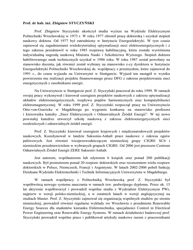 Prof. dr hab. inż. Zbigniew STYCZYŃSKI Prof. Zbigniew Styczyński