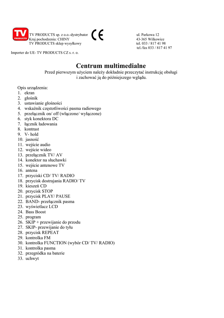 TV PRODUCTS sp. z o.o.-dystrybutor Kraj pochodzenia: CHINY TV PRODUCTS sklep wysyłkowy ul. Parkowa 12 43-365 Wilkowice tel. 033 / 817 41 98 tel./fax 033 / 817 41 97 Importer do UE- TV PRODUCTS CZ s. r. o. Centrum multimedialne Przed pierwszym użyciem należy dokładnie przeczytać instrukcję obsługi i zachować ją do późniejszego wglądu. Opis urządzenia: 1. ekran 2. głośnik 3. ustawianie głośności 4. wskaźnik częstotliwości pasma radiowego 5. przełącznik on/ off (włączone/ wyłączone) 6. styk konektora DC 7. łącznik ładowania 8. kontrast 9. V- hold 10. jasność 11. wejście audio 12. wejście wideo 13. przełącznik TV/ AV 14. konektor na słuchawki 15. wejście antenowe TV 16. antena 17. przyciski CD/ TV/ RADIO 18. przycisk dostrajania RADIO/ TV 19. kieszeń CD 20. przycisk STOP 21. przycisk PLAY/ PAUSE 22. BAND- przełącznik pasma 23. wyświetlacz LCD 24. Bass Boost 25. program 26. SKIP + przewijanie do przodu 27. SKIP- przewijanie do tyłu 28. przycisk REPEAT 29. kontrolka FM 30. kontrolka FUNCTION (wybór CD/ TV/ RADIO) 31. kontrolka pasma 32. przegródka na baterie 33. uchwyt Odtwarzanie dysku Funkcje Przycisk STOP. Przycisk PLAY/ PAUSE Przycisk SKIP + >> / SEARCH+ Przycisk SKIP - <</ SEARCHwłączyć urządzenie do kontaktu , włączyć przycisk POWER Przed rozpoczęciem należy: 1.) wcisnąć przycisk CD pod wyświetlaczem. Kontrolka zaświeci się na pomarańczowo. Otworzyć kieszeń CD, włożyć CD, zamknąć kieszeń. 2.) W kilka sekund na wyświetlaczu pokaże się całkowita ilość nagrań. Odtwarzanie: · wcisnąć przycisk PLAY/ PAUSE, rozpocznie się odtwarzanie pierwszego nagrania. Porządkowy numer utworu wyświetli się na wyświetlaczu LCD. · można wybrać inny utwór, wciskając przycisk SKIP (przeskoczenie do przodu/ tyłu). · aby zatrzymać odtwarzanie, wcisnąć przycisk PLAY/ PASE. · aby przerwać odtwarzanie wcisnąć przycisk STOP. Wyświetlanie na wyświetlaczu: kieszeń CD się otwiera. · CD door open- kieszeń się otwiera. · kieszeń CD się zamyka, rozpoczyna się czytanie utworów. · Po wczytaniu, na wyświetlaczu pokazuje się całkowita ilość nagrań. · odtwarzanie: wcisnąć > · PAUSE- zatrzymanie odtwarzania, jeśli naciśnie się drugi raz, na wyświetlaczu pojawi się PLAY · STOP- przerwanie odtwarzania- wcisnąć · aby odsłuchać wybranego nagrania należy wybrać jego numer porządkowy za pomocą przycisków << >>. · Po paru sekundach rozpocznie się odtwarzanie nagrania. · Przewijanie utworów do przodu/ do tyłu. W trakcie odtwarzania wcisnąć i przytrzymać przycisk SKIP. Po przewinięciu puścić przycisk. Programowanie utworów (tryb przerwania odtwarzania) Wcisnąć przycisk PROGRAM. Na wyświetlaczu LCD pokaże się „01”. Następnie wcisnąć przycisk SKIP i wybrać porządkowy numer utworu. Aby potwierdzić wybór utworu wcisnąć przycisk PROGRAM. Czynność powtarzać w odniesieniu do innych utworów. W ten sposób można zaprogramować 20 utworów. Po wciśnięciu PLAY/ PAUSE utwory będą odtwarzane w zaprogramowanej kolejności. W trakcie odtwarzania można wcisnąć przycisk REPEAT, na wyświetlaczu pojawi się „RPT”- odtwarzany utwór zostanie powtórzony. Jeśli wciśniecie przycisk REPEAT po raz drugi włączy się automatyczne odtwarzanie wszystkich utworów a na wyświetlaczu pojawi się „RPT”. Aby przerwać odtwarzanie zaprogramowanych utworów wcisnąć STOP. Aby anulować zaprogramowanie wcisnąć STOP drugi raz. Powtarzanie utworów W trakcie odtwarzania można wcisnąć przycisk REPEAT, na wyświetlaczu pojawi się „RPT”- odtwarzany utwór zostanie powtórzony. Jeśli wciśniecie przycisk REPEAT po raz drugi włączy się automatyczne odtwarzanie wszystkich utworów a na wyświetlaczu pojawi się „RPT”. Aby odwołać powtarzanie wszystkich utworów należy po raz trzeci wcisnąć przycisk REPEAT. Obsługa telewizora 1. wcisnąć przycisk TV pod wyświetlaczem. Kontrolka zaświeci się na czerwono 2. wcisnąć przycisk BAND- wybrać pasmo: (VL, VHF, UHF). Zgodnie z wybranym pasmem zaświeci się lampka NIE ŚWIECI/ CZERWONA/ ZIELONA 3. pokręcić guzikiem do dostrajania, dostroić kanał do częstotliwości pasma 4. nastawić antenę- odległość, kierunek, kąt odbioru sygnału. 5. nastawić głośność 6. jeśli obraz jest zbyt jasny lub ciemny, nastawić kontrast za pomocą przycisku do ustawiania jasności i przycisku do ustawiania ostrości 7. jeśli obraz się obraca w dół lub górę, nastawić stabilną pozycję obrazu za pomocą przycisku V- hold 8. aby przełączyć TV do trybu AV (możliwość oglądania wideo czy DVD), wcisnąć przycisk TV/ AV. Aby z powrotem przełączyć na TV- należy znowu wcisnąć przycisk Słuchanie przez słuchawki Wsunąć konektor słuchawek do styku słuchawek. Po podłączeniu słuchawek wyłączą się głośniki. Styk jest przeznaczony dla słuchawek z konektorem 3,5 mm. 1. wcisnąć przycisk RADIO pod wyświetlaczem. Kontrolka zaświeci się na zielono 2. przełączyć pasmo za pomocą przycisku BAND: FM STEREO/ FM/ AM- kontrolka: NIE ŚWIECI/ CZERWONA/ ZIELONA. 3. pokręcić guzikiem do dostrajania, dostroić stację doczęstotliwości pasma 4. nastawić antenę- odbiór sygnału 5. nastawić głośność 6. wcisnąć przycisk BASS- funkcja bass boost: niskie dźwięki Podłączenie urządzenia · Przed podłączeniem urządzenia do prądu należy się upewnić, że włącznik ładowania jest w pozycji NORMAL. 1. Adapter AC. Podłączyć konektor adaptera do styku konektora DC. Podłączyć ładowarkę do prądu. Uwaga! Przed podłączeniem urządzenia do prądu należy się upewnić, że wartość napięcia podana na naklejce z danymi technicznymi zgadza się z tą w gniazdku. 2. 12 V adapter do auta. Podłączyć konektor adaptera do styku konektora DC. Podłączyć ładowarkę do prądu. 3. Baterie. Przed włożeniem baterii upewnić się, że włącznik ładowania znajduje się w pozycji NORMAL. Otworzyć sch