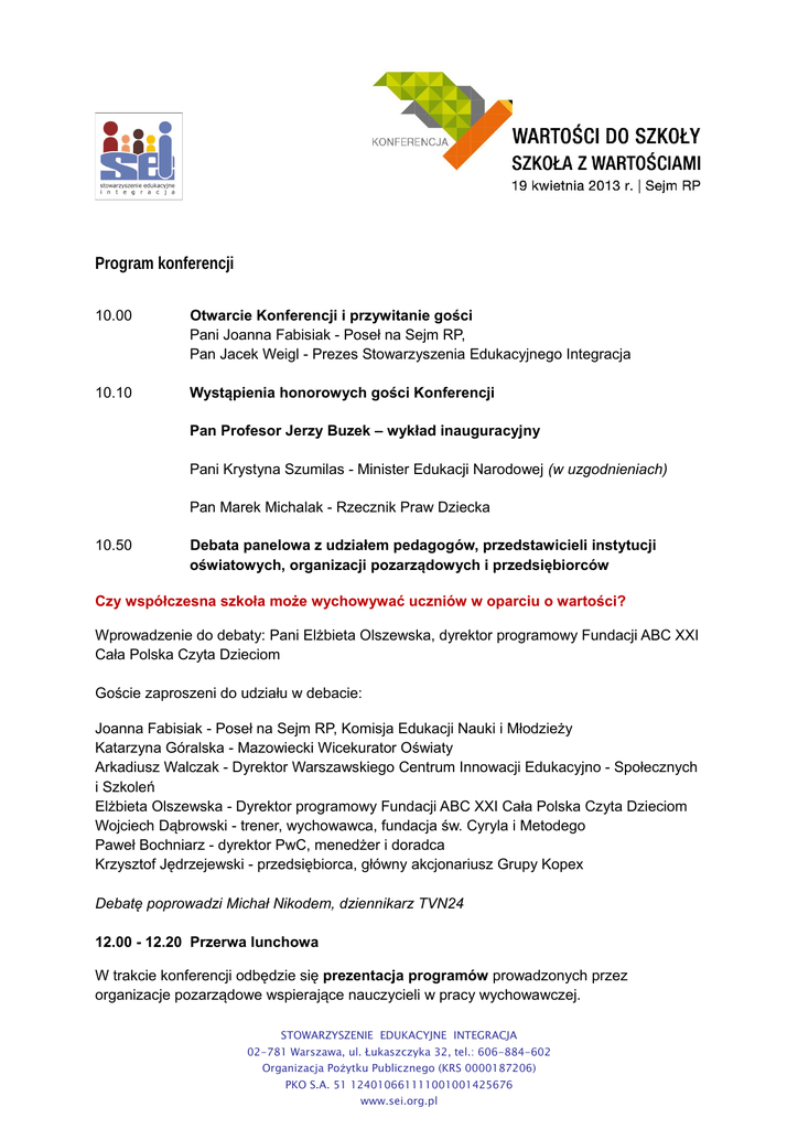 Program konferencji 10.00 Otwarcie Konferencji i przywitanie gości Pani Joanna Fabisiak - Poseł na Sejm RP, Pan Jacek Weigl - Prezes Stowarzyszenia Edukacyjnego Integracja 10.10 Wystąpienia honorowych gości Konferencji Pan Profesor Jerzy Buzek – wykład inauguracyjny Pani Krystyna Szumilas - Minister Edukacji Narodowej (w uzgodnieniach) Pan Marek Michalak - Rzecznik Praw Dziecka 10.50 Debata panelowa z udziałem pedagogów, przedstawicieli instytucji oświatowych, organizacji pozarządowych i przedsiębiorców Czy współczesna szkoła może wychowywać uczniów w oparciu o wartości? Wprowadzenie do debaty: Pani Elżbieta Olszewska, dyrektor programowy Fundacji ABC XXI Cała Polska Czyta Dzieciom Goście zaproszeni do udziału w debacie: Joanna Fabisiak - Poseł na Sejm RP, Komisja Edukacji Nauki i Młodzieży Katarzyna Góralska - Mazowiecki Wicekurator Oświaty Arkadiusz Walczak - Dyrektor Warszawskiego Centrum Innowacji Edukacyjno - Społecznych i Szkoleń Elżbieta Olszewska - Dyrektor programowy Fundacji ABC XXI Cała Polska Czyta Dzieciom Wojciech Dąbrowski - trener, wychowawca, fundacja św. Cyryla i Metodego Paweł Bochniarz - dyrektor PwC, menedżer i doradca Krzysztof Jędrzejewski - przedsiębiorca, główny akcjonariusz Grupy Kopex Debatę poprowadzi Michał Nikodem, dziennikarz TVN24 12.00 - 12.20 Przerwa lunchowa W trakcie konferencji odbędzie się prezentacja programów prowadzonych przez organizacje pozarządowe wspierające nauczycieli w pracy wychowawczej. STOWARZYSZENIE EDUKACYJNE INTEGRACJA 02-781 Warszawa, ul. Łukaszczyka 32, tel.: 606-884-602 Organizacja Pożytku Publicznego (KRS 0000187206) PKO S.A. 51 124010661111001001425676 www.sei.org.pl 12.20 - 14.30 I Sesja problemowa 12.20 – 12.50 Wartości i wychowanie w kulturze wyśmiewającej autorytety i przesyconej seksualizacją. Odpowiedź profilaktyki zintegrowanej. Dr Szymon Grzelak - Instytut Profilaktyki Zintegrowanej 12.50-13.00 Uprzedmiotowienie kobiet w mediach i reklamie – rodzice zmieniają świat! Rafał Porzeziński - Stowarzyszenie Twoja Sprawa 13.00 - 13.20 Twoje, nasze, czyje? Wspólna odpowiedzialność za kształtowanie świata wartości dzieci. Dr Aneta Jegier - Akademia Pedagogiki Specjalnej 13.20 - 13.40 Dwoistość aksjologiczna współczesnej szkoły - spór o wartości. Dr Marta Kotarba - Akademia Pedagogiki Specjalnej 13.40 – 14.20 Otwarte pytania – otwarte drzwi do… Justyna Wawrzyniak, Anna Nieżurawska - Fundacja Proca Krótki warsztat poświęcony znaczeniu pytań otwartych w dydaktyce. Pokazane zostanie, jak proponowana metoda w naturalny sposób umożliwia przekazywanie wartości w procesie nauczania. 14.20 – 14.35 przerwa kawowa 14.35-15.45 Dyskusja panelowa z udziałem praktyków i trenerów Kierunek działań przyjęty przez szkołę i jego wpływ na postawy oraz wartości uczniów Prezentacja doświadczeń szkół, które wprowadziły programy: Archipelag Skarbów, Cross Roads – Młodzież na rozdrożu, Z dzieckiem w świat wartości, EQUIP, edukacja chrześcijańska z wartościami oraz inne metody edukacyjne. Dyskusję poprowadzi Michał Nikodem, dziennikarz TVN24 15.45 – 16.00 Pytania 16.00 Podsumowanie i zakończenie konferencji STOWARZYSZENIE EDUKACYJNE INTEGRACJA 02-781 Warszawa, ul. Łukaszczyka 32, tel.: 606-884-602 Organizacja Pożytku Publicznego (KRS 0000187206) PKO S.A. 51 124010661111001001425676 www.sei.org.pl