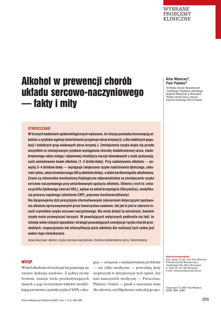 WYBRANE PROBLEMY KLINICZNE Alkohol w prewencji chorób układu sercowo-naczyniowego — fakty i mity Artur Mamcarz1, Piotr Podolec2 1III Klinika Chorób Wewnętrznych i Kardiologii II Wydziału Lekarskiego Akademii Medycznej w Warszawie 2Klinika Chorób Serca i Naczyń Instytutu Kardiologii CM UJ Kraków STRESZCZENIE W licznych badaniach epidemiologicznych wykazano, że relacja pomiędzy konsumpcją alkoholu a ryzykiem ogólnej śmiertelności przyjmuje obraz krzywej U, a dla niektórych populacji i niektórych grup wiekowych obraz krzywej J. Zmniejszenie ryzyka wiąże się przede wszystkim ze zmniejszonym ryzykiem wystąpienia choroby niedokrwiennej serca, niedokrwiennego udaru mózgu i objawowej miażdżycy naczyń obwodowych u osób spożywających umiarkowane dawki alkoholu (1–2 drinki/dobę). Przy nadużywaniu alkoholu — powyżej 3–4 drinków/dobę — występuje zwiększone ryzyko nadciśnienia tętniczego, zaburzeń rytmu, udaru krwotocznego (60 g alkoholu/dobę), a także kardiomiopatia alkoholowa. Znane są różnorodne mechanizmy fizjologiczne odpowiedzialne za zmniejszanie ryzyka sercowo-naczyniowego przy umiarkowanym spożyciu alkoholu. Główne z nich to: zmiana profilu lipidowego (wzrost HDL), wpływ na układ krzepnięcia (fibrynoliza), modyfikacja procesu zapalnego (obniżenie CRP), poprawa insulinowrażliwości. Nie dysponujemy dziś precyzyjnie sformułowanymi zaleceniami dotyczącymi spożywania alkoholu opracowywanymi przez towarzystwa naukowe, tak jak to jest w zakresie innych czynników ryzyka sercowo-naczyniowego. Nie może dziwić ta ostrożność, bowiem ryzyko może przewyższać korzyści. W powstających wytycznych podkreśla się fakt, że istnieje wiele różnych sposobów i strategii pozwalających zmniejszyć ryzyko chorób przewlekłych, rozpoczynanie lub intensyfikacja picia alkoholu dla realizacji tych celów jest wobec tego niewskazana. słowa kluczowe: alkohol, ryzyko sercowo-naczyniowe, choroba niedokrwienna serca, rekomendacje WSTĘP giej — związane z nadużywaniem problemy Wokół alkoholu od wielu już lat pojawiają się — nie tylko medyczne — powodują duży zażarte dyskusje naukowe. Z jednej strony sceptycyzm w interpretacji tych opinii. Już bowiem, istnieje wiele przekonywujących nasi nauczyciele medycyny — Paracelsus, danych o jego korzystnym wpływie modyfi- Pliniusz i Galen — pisali o znaczeniu wina kującym istotne czynniki ryzyka ChNS, z dru- dla zdrowia, zaś Hipokrates zalecał jego spo- Forum Medycyny Rodzinnej 2007, tom 1, nr 3, 255–263 Adres do korespondencji: prof. nadzw. dr hab. med. Artur Mamcarz III Klinika Chorób Wewnętrznych i Kardiologii II WL AM w Warszawie ul. Solec 93, 02–382 Warszawa e-mail: [email protected] Copyright © 2007 Via Medica ISSN 1897–3590 255 WYBRANE PROBLEMY KLINICZNE 256 życie w celach diuretycznych. Podobną opi- DANE OGÓLNE nię wyrażała też żyjąca w XII wieku w Niem- Choć dokładne dane epidemiologiczne w ska- czech Hildegarda z Bingen, która używała li globalnej są trudne do ustalenia, przyjmuje sformułowania „Herzwein”, podkreślając się, że około 80% mężczyzn i 2/3 kobiet spo- tym samym dobroczynne działanie wina na żywa napoje alkoholowe [2]. W licznych bada- choroby serca. Z drugiej strony, już w czasach niach epidemiologicznych wskazuje się też na faraonów zauważono istotne problemy zdro- to, że relacja pomiędzy konsumpcją alkoho- wotne wynikające z nieumiarkowanego spo- lu a ryzykiem ogólnej śmiertelności przyjmu- życia alkoholu (uzależnienie). je obraz krzywej U lub dla niektórych popu- „Kłopot w tym — mawiał Ernest Hemin- lacji i niektórych grup wiekowych obraz krzy- gway, w czasach znacznie nam bliższych, do- wej J [3–5]. W medycznych bazach danych lewając w czasie śniadania dżin do herbaty — można doszukać się ponad 100 precyzyjnie że całe życie, gdy sprawy miały się naprawdę przeprowadzonych badań obserwacyjnych źle, jeden drink pozwalał mi widzieć wszystko (cross-cultural, case-control, prospective-co- w o wiele lepszym świetle”. Wiemy o tym, że hort) i ponad 80 krótkoterminowych studiów choć informacja zawarta w tym cytacie jest wła- metabolicznych dobrze dokumentujących tę ściwa i określa dawkę („jeden drink”), to pro- zależność. Wiąże się ona przede wszystkim ze blem z jej przekraczaniem jest powszechnie zmniejszonym ryzykiem wystąpienia choroby znany. Jean Paul Sartre, który przesiadywał niedokrwiennej serca, udaru mózgu i objawo- w znanej paryskiej kawiarni Café de Flore nad wej miażdżycy naczyń obwodowych u osób kwartą wina, mówił przecież, że dopiero „mo- spożywających umiarkowane dawki alkoholu. rze alkoholu, mocnej kawy i herbaty wspoma- Pojawia się opinia, że zarówno osoby pijące ga Jego wenę twórczą”. I choć bez tego „wspo- nadmiernie, jak i całkowici abstynenci żyją magania” nie powstałyby zapewne liczne po- krócej niż osoby pijące umiarkowanie. Istnieje ematy, symfonie czy obrazy, to kolejny kłopot sporo kontrowersji wokół kwestii dotyczącej jest w tym, że etanol, bogatoenergetyczny zwią- całkowitych abstynentów. Wielu ekspertów zek znany człowiekowi od tysiącleci, jest sub- zajmujących się tym zagadnieniem uważa, że stancją, która może powodować uzależnienie, rozważniej jest mówić o krzywej J, bowiem nie a przy niekontrolowanym spożyciu istotne pa- ma jednoznacznego wytłumaczenia dla gor- tologie układu krążenia (kardiomiopatia, nie- szego rokowania w przebiegu pełnej absty- wydolność serca, zaburzenia rytmu). Kolejny nencji, trudno też w sposób niebudzący wąt- problem pojawił się wtedy, gdy we Francji za- pliwości zakwalifikować badanych do tej wła- stanawiano się nad tzw. paradoksem francu- śnie grupy. Rozważa się kilka mechanizmów. skim, czyli niskim ryzykiem umieralności z po- Po pierwsze — hipoteza „sick quitteer”, która wodu choroby niedokrwiennej serca (ChNS), za