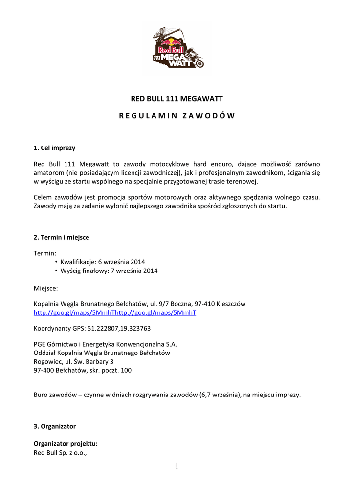 RED BULL 111 MEGAWATT REGULAMIN ZAWODÓW 1. Cel imprezy Red Bull 111 Megawatt to zawody motocyklowe hard enduro, dające możliwość zarówno amatorom (nie posiadającym licencji zawodniczej), jak i profesjonalnym zawodnikom, ścigania się w wyścigu ze startu wspólnego na specjalnie przygotowanej trasie terenowej. Celem zawodów jest promocja sportów motorowych oraz aktywnego spędzania wolnego czasu. Zawody mają za zadanie wyłonić najlepszego zawodnika spośród zgłoszonych do startu. 2. Termin i miejsce Termin: • Kwalifikacje: 6 września 2014 • Wyścig finałowy: 7 września 2014 Miejsce: Kopalnia Węgla Brunatnego Bełchatów, ul. 9/7 Boczna, 97-410 Kleszczów http://goo.gl/maps/5MmhThttp://goo.gl/maps/5MmhT Koordynanty GPS: 51.222807,19.323763 PGE Górnictwo i Energetyka Konwencjonalna S.A. Oddział Kopalnia Węgla Brunatnego Bełchatów Rogowiec, ul. Św. Barbary 3 97-400 Bełchatów, skr. poczt. 100 Buro zawodów – czynne w dniach rozgrywania zawodów (6,7 września), na miejscu imprezy. 3. Organizator Organizator projektu: Red Bull Sp. z o.o., 1 Al. Wyścigowa 8a, 02-681 Warszawa, e-mail: [email protected] Oficjalny serwis internetowy zawodów: www.redbull111megawatt.pl Organizator zawodów, na zlecenie Red Bull: Rochstar Events Sp. z o.oC ul. Wał Miedzeszyński 384C 03-994 Warszawa Biuro:Cul. Racławicka 99C 02-634 Warszawa Dyrektor Sportowy zawodów: Bartosz Obłucki 4. Harmonogram 6 września (sobota) • 9:00-12:00 Rejestracja (kontrola techniczna, odbiór pakietów startowych) • 12:30 Odprawa dla zawodników • 13:00 Otwarcie toru testowego • 13:00 Start kwalifikacji Kwalifikacje odbędą się w dwóch przejazdach na czas, na dwóch specjalnie przygotowanych trasach. Jako wynik kwalifikacji będzie obowiązywał łączny czas przejazdu obu tras. Próba przejazdu po trasie zawodów poza biegiem kwalifikacyjnym będzie oznaczać dyskwalifikację zawodnika. Limit liczby osób, które mogą zakwalifikować się do finału zostanie ustalony po zamknięciu list startowych, na podstawie liczby osób zgłoszonych do startu w zawodach i będą ogłoszone na odprawie dla zawodników. Pełne wyniki kwalifikacji zostaną ogłoszone niezwłocznie po zakończeniu przejazdu. Na podstawie wyników kwalifikacji wyłoniony zostanie zespół osób zakwalifikowanych do udziału w finałowym przejeździe 7 września 2014; numery startowe pozostaną te same, co przy rejestracji do zawodów. Biorąc udział w eliminacjach zawodnicy deklarują, że są w stanie wystartować w przejeździe finałowym, 7 września 2014. 2 Finał – 07 września - Ramowy plan dnia • 09:00 Otwarcie Biura Zawodów • 11:00 Odprawa dla zawodników • 12:00 Otwarcie toru testowego • 13:00 Start wyścigu • 17:00 Przewidywane zakończenie zawodów Wyścig finałowy odbędzie się ze startu wspólnego. Zawodnicy zostaną ustawieni w linii, według czasów uzyskanych w kwalifikacjach. Podane powyżej godziny mogą ulec zmianie. Organizator zastrzega sobie prawo do przesunięcia w czasie lub odwołania przejazdu finałowego z uwagi na warunki pogodowe zagrażające bezpieczeństwu zawodników. 5. Warunki uczestnictwa w zawodach Do zawodów dopuszczeni będą zawodnicy, którzy spełnią kolejne, podane poniżej, warunki: ● Ukończone 18 lat (organizator dopuszcza możliwość startu zawodników, którzy w dniu zawodów ukończyli 16 lat, pod warunkiem pisemnej zgody rodziców lub prawnych opiekunów – formularz dostępny jest na oficjalnym serwisie internetowym zawodów www.redbull111megawatt.pl). ● Zarejestrowanie się w oficjalnym serwisie internetowym zawodów oraz wniesienie opłaty startowej w wysokości 70 zł. Rejestracja do zawodów będzie możliwa także w dniu kwalifikacji, w biurze zawodów. W tym dniu będzie obowiązywała, jednak, wyższa opłata startowa, w wysokości 90 zł. ● Zgłoszenie się osobiście w biurze zawodów 6 września 2014, w wyznaczonych godzinach. ● Zapoznanie się z regulaminem zawodów i potwierdzenie tego faktu pisemnie w biurze zawodów (specjalny dokument: Oświadczenie uczestnika). ● Posiadanie aktualnego ubezpieczenia uczestnika NNW i OC z tytułu startu w zawodach motocyklowych (Nie obowiązują licencje zawodnicze). ● Posiadanie sprawnego technicznie motocykla offroad (enduro, motocross, trial), który przejdzie standardową kontrolę techniczną. Kategoria open, bez podziału na kategorie i pojemności. ● Posiadanie homologowanego kasku motocyklowego oraz odzieży ochronnej (gogle, rękawice, buty) i ochraniaczy. 3 ● Posiadanie, przez cały czas trwania zawodów, odpowiednio umieszczonego numeru startowego na motocyklu (naklejki z przodu oraz po bokach motocykla) przekazanego przez organizatora w pakiecie startowym,. ● Zawodnik nie może być pod wpływem alkoholu, ani środków odurzających. ● Stan zdrowia zawodnika musi pozwalać na start w zawodach sportowych. Organizator zastrzega sobie prawo przyznania tzw. „dzikich kart” dla specjalnych gości zaproszonych do udziału w zawodach. 6. Zgłoszenia Zgłoszenia do zawodów można dokonywać internetowo w serwisie www.redbull111megawatt.pl oraz na miejscu imprezy w dniu eliminacji w wyznaczonych godzinach. By zawodnik znalazł się na liście startowej zobowiązany jest wnieść opłatę startową, w wysokości 70 zł brutto – w przypadku zgłoszeń internetowych lub 90 zł brutto – w przypadku zgłoszeń na miejscu, w biurze zawodów. Opłata startowa nie podlega zwrotowi. W ramach opłaty startowej organizator zapewnia m.in.: pakiet startowy (numery, transpondery do pomiaru czasu, napoje, upominek – oficjalny gadżet imprezy, posiłek) oraz miejsce campingowe (zabezpieczona przestrzeń do ustawienia pojazdu i/lub namiotu). Organizator nie zapewnia: paliwa, ubezpieczenia. Organizator może zdecydować o zamknięciu zgłoszeń, w wypadku przekroczenia limitu miejsc. O dopuszczeniu do startu w kwalifikacjach decyduje kolejność zgłoszeń. Start w finałowym przejeździe