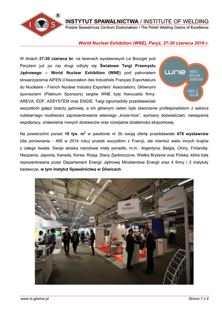 World Nuclear Exhibition (WNE), Paryż, 27-30 czerwca 2016 r. W dniach 27-30 czerwca br. na terenach wystawowych Le Bourget pod Paryżem już po raz drugi odbyły się Światowe Targi Przemysłu Jądrowego – World Nuclear Exhibition (WNE) pod patronatem stowarzyszenia AIFEN (l’Association des Industriels Français Exportateurs du Nucléaire - French Nuclear Industry Exporters’ Association). Głównymi sponsorami (Platinum Sponsors) targów WNE były francuskie firmy: AREVA, EDF, ASSYSTEM oraz ENGIE. Targi zgromadziły przedstawicieli wszystkich gałęzi branży jądrowej, a ich głównym celem było stworzenie profesjonalistom z sektora nuklearnego możliwości zaprezentowania własnego „know-how”, wymiany doświadczeń, nawiązania współpracy, znalezienia nowych dostawców oraz rozwijania działalności eksportowej. Na powierzchni ponad 10 tys. m2 w pawilonie nr 2b swoją ofertę przedstawiało 678 wystawców (dla porównania - 495 w 2014 roku) przede wszystkim z Francji, ale również wielu innych krajów z całego świata. Swoje stoiska narodowe miały ponadto, m.in.: Argentyna, Belgia, Chiny, Finlandia, Hiszpania, Japonia, Kanada, Korea, Rosja, Stany Zjednoczone, Wielka Brytania oraz Polska, która była reprezentowana przez Departament Energii Jądrowej Ministerstwa Energii oraz 4 firmy i 2 instytuty badawcze, w tym Instytut Spawalnictwa w Gliwicach. www.is.gliwice.pl Strona 1 z 4 World Nuclear Exhibition (WNE), Paryż, 27-30 czerwca 2016 r. Według danych organizatorów w ciągu trzech dni wystawę WNE odwiedziło ponad 8 800 osób, z których goście zagraniczni stanowili 28,5 %. W uroczystym otwarciu drugiej edycji WNE wzięło udział wielu prezesów firm i korporacji oraz znanych i ważnych dla branży jądrowej osobistości oraz osoby ze świata polityki, w tym p. Emmanuel Macron, France's Secretary of State for Economy, Industry and Digital Affairs, który w swoim wystąpieniu podkreślił, że energetyka jądrowa jest przyszłością Francji zarówno z punktu widzenia rozwoju nauki, jak i gospodarki. Minister stwierdził, że światowy rynek energetyki jądrowej ciągle powiększa się, w tym również dzięki nowym krajom, które tylko rozpoczynają rozwój programów jądrowych. Minister podkreślił ponadto, że po awarii w elektrowni Fukushima wiele krajów na świecie podjęło decyzję o zawieszeniu lub ograniczeniu programów jądrowych, ale Francja nie zamierza tego robić, gdyż podstawową zaletą tego sektora energetycznego jest zapewnienie stabilnych dostaw energii elektrycznej przy bardzo niskim poziomie powstających gazów cieplarnianych. Równolegle z targami odbywało się wiele seminariów (w tym sesja zorganizowana przez AFCEN), imprez towarzyszących oraz spotkań biznesowych, które przebiegały w dużej sali przeznaczonej dla paneli dyskusyjnych, dwóch mniejszych (Workshop 1 and 2) oraz strefie specjalnej przeznaczonej do prezentacji poszczególnych krajów (Business Opportunities & National Special Sessions). W tej ostatniej sali w drugim dniu targów odbyła się sesja specjalna Ministerstwa Energii RP, podczas której głos zabrał p. Andrzej Piotrowski, Podsekretarz Stanu w Ministerstwie Energii oraz p. dr Józef Sobolewski, Dyrektor Departamentu Energii Jądrowej w Ministerstwie Energii. Aktualny stan przygotowań do budowy elektrowni jądrowej w Polsce przedstawił ponadto p. Andrzej Sidło, Główny Specjalista Departamentu Energii Jądrowej. W swoich wystąpieniach zarówno Minister A. Piotrowski, jak i Dyrektor J. Sobolewski podkreślali, że Polska dysponuje kompetentnymi ośrodkami badawczymi i przedsiębiorstwami, które z powodzeniem realizowały i realizują określone projekty na rzecz energetyki jądrowej w Europie i na świecie. Stwierdzono, że celem działań Rządu jest zapewnienie jak największego udziału krajowych przedsiębiorstw w polskim projekcie jądrowym oraz ich wsparcie na arenie międzynarodowej. Sesja cieszyła się dużym zainteresowaniem uczestników targów WNE, którzy licznie zgromadzili się w sali, a po zakończeniu wystąpień aktywnie zadawali pytania przedstawicielom naszego kraju. www.is.gliwice.pl Strona 2 z 4 World Nuclear Exhibition (WNE), Paryż, 27-30 czerwca 2016 r. Andrzej Piotrowski, Podsekretarz stanu w Ministerstwie Energii dr Józef Sobolewski, Dyrektor Departamentu Energii Jądrowej w Ministerstwie Energii www.is.gliwice.pl Strona 3 z 4 World Nuclear Exhibition (WNE), Paryż, 27-30 czerwca 2016 r. Mimo napiętego harmonogramu spotkań, Minister Andrzej Piotrowski oraz Dyrektor Józef Sobolewski spotkali się na polskim narodowym stoisku z reprezentującymi nasz kraj firmami i instytutami badawczymi. Każdy z uczestników miał możliwość przedstawienia obszaru działalności swojej instytucji w dziedzinie energetyki jądrowej oraz odpowiedzieć na powstające w trakcie dyskusji pytania. W ostatnim dniu WNE przedstawiciele firm polskich obecnych na targach zarówno w charakterze wystawców, jak i odwiedzających zostali zaproszeni przez firmę EDF na spotkanie przy kawie i ciastku, podczas którego mogli poznać się osobiście, określić obszary wspólnych zainteresowań oraz nawiązać kontakty biznesowe. Na zakończenie należy podkreślić doskonałą organizację pracy targów w Le Bourget pod Paryżem (niedaleko stadionu Stade de France w Saint-Denis) mimo odbywających się we Francji Mistrzostw Europy w piłce nożnej EURO 2016 i związanych z tym zaostrzonych wymagań w zakresie bezpieczeństwa oraz obecności na ulicach Paryża zwiększonej ilości patroli. Dr inż. Jerzy Niagaj, prof. nzw. IS www.is.gliwice.pl Strona 4 z 4