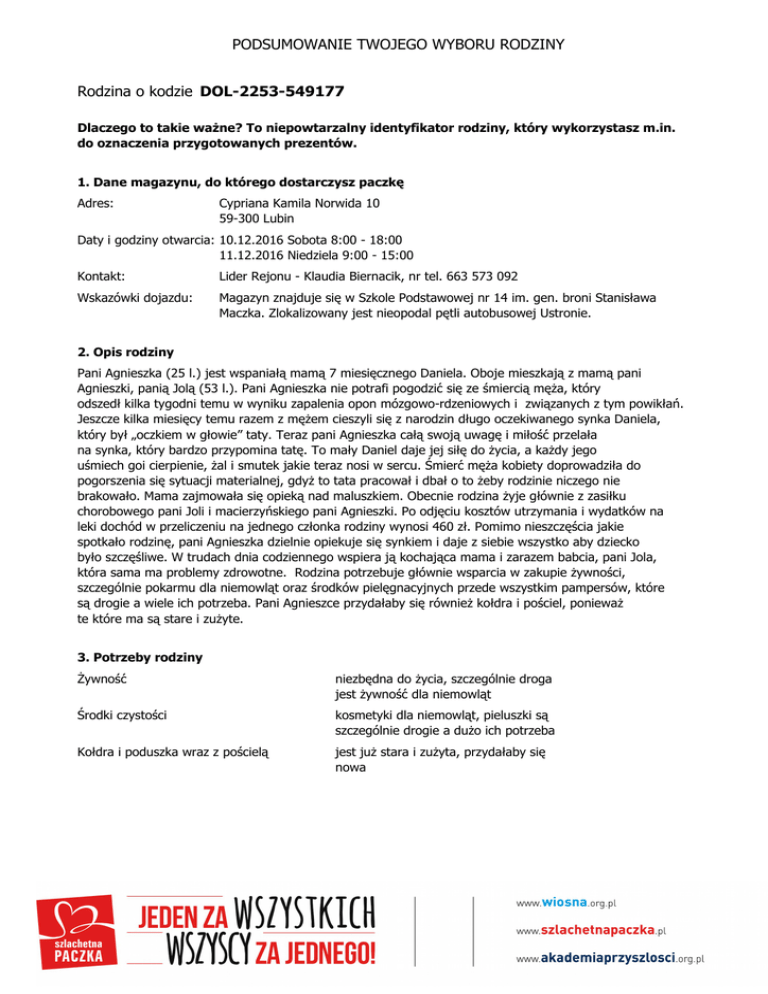 PODSUMOWANIE TWOJEGO WYBORU RODZINY Rodzina o kodzie DOL-2253-549177 Dlaczego to takie ważne? To niepowtarzalny identyfikator rodziny, który wykorzystasz m.in. do oznaczenia przygotowanych prezentów. 1. Dane magazynu, do którego dostarczysz paczkę Adres: Cypriana Kamila Norwida 10 59-300 Lubin Daty i godziny otwarcia: 10.12.2016 Sobota 8:00 - 18:00 11.12.2016 Niedziela 9:00 - 15:00 Kontakt: Lider Rejonu - Klaudia Biernacik, nr tel. 663 573 092 Wskazówki dojazdu: Magazyn znajduje się w Szkole Podstawowej nr 14 im. gen. broni Stanisława Maczka. Zlokalizowany jest nieopodal pętli autobusowej Ustronie. 2. Opis rodziny Pani Agnieszka (25 l.) jest wspaniałą mamą 7 miesięcznego Daniela. Oboje mieszkają z mamą pani Agnieszki, panią Jolą (53 l.). Pani Agnieszka nie potrafi pogodzić się ze śmiercią męża, który odszedł kilka tygodni temu w wyniku zapalenia opon mózgowo-rdzeniowych i związanych z tym powikłań. Jeszcze kilka miesięcy temu razem z mężem cieszyli się z narodzin długo oczekiwanego synka Daniela, który był „oczkiem w głowie” taty. Teraz pani Agnieszka całą swoją uwagę i miłość przelała na synka, który bardzo przypomina tatę. To mały Daniel daje jej siłę do życia, a każdy jego uśmiech goi cierpienie, żal i smutek jakie teraz nosi w sercu. Śmierć męża kobiety doprowadziła do pogorszenia się sytuacji materialnej, gdyż to tata pracował i dbał o to żeby rodzinie niczego nie brakowało. Mama zajmowała się opieką nad maluszkiem. Obecnie rodzina żyje głównie z zasiłku chorobowego pani Joli i macierzyńskiego pani Agnieszki. Po odjęciu kosztów utrzymania i wydatków na leki dochód w przeliczeniu na jednego członka rodziny wynosi 460 zł. Pomimo nieszczęścia jakie spotkało rodzinę, pani Agnieszka dzielnie opiekuje się synkiem i daje z siebie wszystko aby dziecko było szczęśliwe. W trudach dnia codziennego wspiera ją kochająca mama i zarazem babcia, pani Jola, która sama ma problemy zdrowotne. Rodzina potrzebuje głównie wsparcia w zakupie żywności, szczególnie pokarmu dla niemowląt oraz środków pielęgnacyjnych przede wszystkim pampersów, które są drogie a wiele ich potrzeba. Pani Agnieszce przydałaby się również kołdra i pościel, ponieważ te które ma są stare i zużyte. 3. Potrzeby rodziny Żywność niezbędna do życia, szczególnie droga jest żywność dla niemowląt Środki czystości kosmetyki dla niemowląt, pieluszki są szczególnie drogie a dużo ich potrzeba Kołdra i poduszka wraz z pościelą jest już stara i zużyta, przydałaby się nowa PODSUMOWANIE TWOJEGO WYBORU RODZINY Rodzina o kodzie DOL-2253-549177 - Żywność trwała: Jakich produktów żywnościowych potrzebuje rodzina: Herbata, Kasza, Cukier, Konserwy mięsne, Kawa, Makaron, Olej, Konserwy rybne, Ryż, Mąka, Dżem, Warzywa w puszkach Produkty dla niemowląt: mleko bebilon 1, kaszki bobovit bananowe, deserki bobovit w słoiczkach Inne produkty żywnościowe: napoje, płatki śniadaniowe - Środki czystości Jakich środków czystości potrzebuje rodzina: Proszek do prania, Płyn do mycia naczyń, Mydło/żel myjący, Pasta do zębów, Płyny czyszczące, Szampon, Szczoteczka do zębów Artykuły dziecięce: pampersy 4+, chusteczki nawilżające, płyn do kąpieli oilatum, oliwka nivea, przeciw odparzeniom sudocrem - Odzież Daniel Rodzaj odzieży: przejściowe Kategoria: body Rozmiar: 86 cm Sylwetka: Uwagi: Daniel Rodzaj odzieży: przejściowe Kategoria: bluzeczki Rozmiar: 86 cm Sylwetka: Uwagi: Daniel Rodzaj odzieży: przejściowe Kategoria: rajstopki Rozmiar: 86 cm Sylwetka: Uwagi: PODSUMOWANIE TWOJEGO WYBORU RODZINY Rodzina o kodzie DOL-2253-549177 Daniel Rodzaj odzieży: przejściowe Kategoria: spodenki Rozmiar: 86 cm Sylwetka: Uwagi: - Obuwie Daniel Rodzaj obuwia: przejściowe Kategoria: buciki dziecięce Rozmiar: 9-12 m-cy Uwagi: chłopiec ma dużą nóżkę Daniel Rodzaj obuwia: zimowe Kategoria: buciki Rozmiar: 9-12 m-cy Uwagi: tzw. niechodki Agnieszka Rodzaj obuwia: zimowe Kategoria: kozaki Rozmiar: 40 Uwagi: - Wyposażenie mieszkania Jakiego wyposażenia mieszkania potrzebuje rodzina: Kołdra, Koc, Ręczniki, Pościel, Poduszka Inne: kołdra 160/200 pościel 160/200 Brakujące sprzęty: blender do przygotowywania pokarmów dla Daniela - Specjalne upominki Daniel - zabawka edukacyjna z dźwiękami PODSUMOWANIE TWOJEGO WYBORU RODZINY Rodzina o kodzie DOL-2253-549177 Agnieszka - książka Jola - perfumy 4. Osoby opiekujące sie rodziną - Wolontariusz opiekun rodziny Imię i nazwisko: Edyta Talaga E-mail: [email protected] - Lider Rejonu Imię i nazwisko: Klaudia Biernacik 5. Mamy dla Ciebie kilka wskazówek, ważnych w przygotowaniu Paczki. * Paczki możesz dostarczyć wyłącznie do tego magazynu, z którego wybrana została rodzina. Wyjątkiem jest sytuacja, kiedy wybierzesz rodzinę z innego województwa, wtedy możesz dostarczyć paczkę do Magazynu Zastępczego znajdującego się w Twoim województwie (dane adresowe zamieszczone są na stronie wyboru rodziny). * Pamiętaj, że po wybraniu przez Ciebie rodziny nikt inny nie będzie już dla niej przygotowywał paczki. * Nie musisz zakupić wszystkich rzeczy z listy. Pamiętaj jednak, że wybierając rodzinę decydujesz się w pierwszej kolejności zaspokoić 3 najważniejsze potrzeby, które rodzina wymieniła w opisie. Zwróć jednak uwagę, że wszystkie wymienione rzeczy są dla rodziny bardzo ważne. * Rzeczy, które podarujesz rodzinie powinny być dla niej prezentem. Nie muszą być one nowe, a jeśli są używane – niech będą zadbane. Paczka przygotowywana jest z myślą o drugim człowieku – jest jak prezent. Przygotuj paczkę tak, by podniosła poczucie własnej wartości u obdarowanych przez Ciebie osób. * Paczki powinny być podzielone na kilka, poręcznych, niezbyt ciężkich pudeł, prosimy nie dostarczać do magazynu produktów zapakowanych w reklamówki czy worki foliowe. * Każde pudło powinno być opisane kodem rodziny oraz op