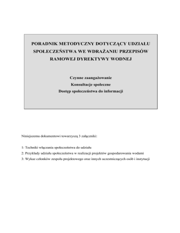 PORADNIK METODYCZNY DOTYCZĄCY UDZIAŁU SPOŁECZEŃSTWA WE WDRAŻANIU PRZEPISÓW RAMOWEJ DYREKTYWY WODNEJ Czynne zaangażowanie Konsultacje społeczne Dostęp społeczeństwa do informacji Niniejszemu dokumentowi towarzyszą 3 załączniki: 1: Techniki włączania społeczeństwa do udziału 2: Przykłady udziału społeczeństwa w realizacji projektów gospodarowania wodami 3: Wykaz członków zespołu projektowego oraz innych uczestniczących osób i instytucji 2 Wprowadzenie Państwa Członkowskie Unii Europejskiej, Norwegia oraz Komisja Europejska razem opracowały wspólną strategię wspierania wdrażania dyrektywy 2000/60/WE w sprawie ustanowienia ram działalności Wspólnoty w dziedzinie polityki wodnej (Ramowa Dyrektywa Wodna). Głównym celem tej strategii jest umożliwienie spójnego i harmonijnego wdrażania Dyrektywy. Nacisk kładziony jest na kwestie metodologiczne związane ze wspólnym rozumieniem implikacji naukowo-technicznych Ramowej Dyrektywy Wodnej. Jednym z krótkoterminowych celów strategii jest opracowanie prawnie niewiążących a praktycznych wytycznych dotyczących różnych kwestii technicznych Dyrektywy. Te wytyczne przeznaczone są dla tych ekspertów, którzy bezpośrednio lub pośrednio wdrażają Ramową Dyrektywę Wodną w dorzeczach. Wobec tego struktura, prezentacja oraz terminologia zostały dostosowane do potrzeb tych ekspertów, a ponadto, tam gdzie to możliwe, unika się formalnego, prawniczego języka. W kontekście tej strategii w październiku 2001 r., w ramach grupy roboczej 2.9 (w sprawie najlepszych praktyk w planowaniu dorzeczy), powołana została nieformalna grupa robocza zajmująca się kwestiami uczestnictwa społecznego Ramowej Dyrektywy Wodnej. Holandia, Hiszpania oraz Komisja są odpowiedzialne za prowadzenie sekretariatu i stymulowanie grupy roboczej, która składa się z ekspertów z organizacji rządowych i pozarządowych. Niniejszy dokument jest wersją ostateczną wytycznych dotyczących uczestnictwa społecznego. Zawiera on syntezę rezultatów działań i dyskusji grupy, które miały miejsce od października 2001 r. Bazuje on na danych wejściowych i informacjach zwrotnych pochodzących od szerokiego spektrum ekspertów i zainteresowanych stron, którzy byli zaangażowani w całym procesie opracowywania wytycznych poprzez spotkania, warsztaty czy komunikowanie się za pomocą mediów elektronicznych, bez zobowiązywania ich w jakikolwiek sposób do jego treści. My, dyrektorzy ds. gospodarki wodnej Unii Europejskiej, Norwegii, Szwajcarii oraz państw ubiegających się o przystąpienie do Unii Europejskiej zbadaliśmy i zatwierdziliśmy niniejsze wytyczne podczas naszego nieformalnego spotkania w trakcie duńskiego przewodnictwa w Kopenhadze (21-22 listopada 2002 r.). Chcielibyśmy podziękować uczestnikom grupy roboczej oraz, w szczególności liderom, Holandii i Hiszpanii, za przygotowanie niniejszego dokumentu o tak wysokiej jakości. Mocno wierzymy, że niniejsze oraz inne wytyczne opracowane w ramach wspólnej strategii wdrażania będą odgrywały kluczową rolę w procesie wdrażania Ramowej Dyrektywy Wodnej. Niniejsze wytyczne są żywym dokumentem, który będzie wymagał ciągłego uzupełniania i poprawiania w miarę gromadzenia zastosowań i doświadczeń we wszystkich państwach Unii Europejskiej i poza nią. Zgadzamy się jednakże, aby niniejszy dokument stał się publicznie dostępny w swojej aktualnej formie, aby zaprezentować go szerszemu gronu jako podstawę do dalszego ciągłego prowadzenia prac wdrożeniowych. Ponadto z zadowoleniem przyjmujemy, że kilku ochotników zobowiązało się do zbadania i uzyskania ważności niniejszego i innych dokumentów w tak zwanych dorzeczach pilotowych w Europie w ciągu r. i 2004 r. w celu upewnienia się, że wytyczne mają zastosowanie w praktyce. Zobowiązujemy się również do oceny i podjęcia decyzji, co do konieczności dokonania rewizji niniejszego dokumentu po badaniach pilotowych i pierwszych doświadczeniach zebranych we wstępnych fazach wdrażania. Ostateczna wersja uzgodniona na zebraniu dyrektorów wodnych Grudzień 2002 3 Streszczenie Cel niniejszego poradnika metodycznego Niniejszy poradnik ma służyć jako pomoc właściwym władzom Państw Członkowskich oraz państwom przystępującym do struktur europejskich we wprowadzaniu w życie przepisów art. 14 ramowej dyrektywy wodnej, dotyczących udziału społeczeństwa. Może on również stanowić dla zainteresowanych stron i ogółu społeczeństwa źródło użytecznych informacji na temat procesu udziału społecznego, stanowić zachętę do uczestnictwa w opracowywaniu planów gospodarowania wodami w dorzeczach, wyjaśnić, jakich rezultatów w związku z takim udziałem można oczekiwać, a także wskazać różne możliwości rozwiązań. Poradnik metodyczny ma charakter horyzontalny, ponieważ autorzy nawiązują w nim do większości działań, o których mowa we „Wspólnej strategii wdrażania ramowej dyrektywy wodnej”. Dokument niniejszy nie ma charakteru wiążącego uregulowania, nosi natomiast wszelkie cechy poradnika. Opracowany został przez nieformalny europejski zespół projektowy złożony z ekspertów i przedstawicieli grup interesów, działający w ramach grupy roboczej projektu 2.9 – Najlepsze praktyki planowania w dorzeczu, w kontekście „Wspólnej strategii wdrażania ramowej dyrektywy wodnej”. Wykaz członków zespołu projektowego oraz współautorów podano w załączniku III do niniejszego poradnika. Co zawiera niniejszy poradnik metodyczny W niniejszym poradniku poruszone zostały następujące zagadnienia: Rozdział 2 1. Na czym polega udział społeczeństwa 2. Dlaczego potrzebny jest udział społeczeństwa 3. Kogo należy angażować do udziału 4. Kiedy należy angażować społeczeństwo Rozdział 3, 4, 5 5. W jaki sposób należy angażować społeczeństwo Rozdział 6 6. Ocena i przygotowanie sprawozdań Rozdział 7 7. Czynniki mające wpływ na 