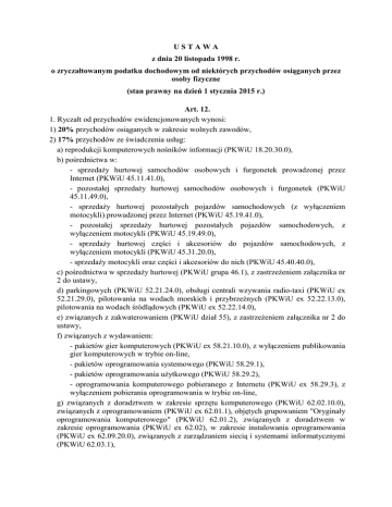 USTAWA z dnia 20 listopada 1998 r. o zryczałtowanym podatku dochodowym od niektórych przychodów osiąganych przez osoby fizyczne (stan prawny na dzień 1 stycznia 2015 r.) Art. 12. 1. Ryczałt od przychodów ewidencjonowanych wynosi: 1) 20% przychodów osiąganych w zakresie wolnych zawodów, 2) 17% przychodów ze świadczenia usług: a) reprodukcji komputerowych nośników informacji (PKWiU 18.20.30.0), b) pośrednictwa w: - sprzedaŜy hurtowej samochodów osobowych i furgonetek prowadzonej przez Internet (PKWiU 45.11.41.0), - pozostałej sprzedaŜy hurtowej samochodów osobowych i furgonetek (PKWiU 45.11.49.0), - sprzedaŜy hurtowej pozostałych pojazdów samochodowych (z wyłączeniem motocykli) prowadzonej przez Internet (PKWiU 45.19.41.0), - pozostałej sprzedaŜy hurtowej pozostałych pojazdów samochodowych, z wyłączeniem motocykli (PKWiU 45.19.49.0), - sprzedaŜy hurtowej części i akcesoriów do pojazdów samochodowych, z wyłączeniem motocykli (PKWiU 45.31.20.0), - sprzedaŜy motocykli oraz części i akcesoriów do nich (PKWiU 45.40.40.0), c) pośrednictwa w sprzedaŜy hurtowej (PKWiU grupa 46.1), z zastrzeŜeniem załącznika nr 2 do ustawy, d) parkingowych (PKWiU 52.21.24.0), obsługi centrali wzywania radio-taxi (PKWiU ex 52.21.29.0), pilotowania na wodach morskich i przybrzeŜnych (PKWiU ex 52.22.13.0), pilotowania na wodach śródlądowych (PKWiU ex 52.22.14.0), e) związanych z zakwaterowaniem (PKWiU dział 55), z zastrzeŜeniem załącznika nr 2 do ustawy, f) związanych z wydawaniem: - pakietów gier komputerowych (PKWiU ex 58.21.10.0), z wyłączeniem publikowania gier komputerowych w trybie on-line, - pakietów oprogramowania systemowego (PKWiU 58.29.1), - pakietów oprogramowania uŜytkowego (PKWiU 58.29.2), - oprogramowania komputerowego pobieranego z Internetu (PKWiU ex 58.29.3), z wyłączeniem pobierania oprogramowania w trybie on-line, g) związanych z doradztwem w zakresie sprzętu komputerowego (PKWiU 62.02.10.0), związanych z oprogramowaniem (PKWiU ex 62.01.1), objętych grupowaniem "Oryginały oprogramowania komputerowego" (PKWiU 62.01.2), związanych z doradztwem w zakresie oprogramowania (PKWiU ex 62.02), w zakresie instalowania oprogramowania (PKWiU ex 62.09.20.0), związanych z zarządzaniem siecią i systemami informatycznymi (PKWiU 62.03.1), h) przetwarzania danych (PKWiU ex 63.11.1), przesyłania strumieni audiowizualnych przez Internet (PKWiU 63.11.2), i) zarządzania nieruchomościami na zlecenie (PKWiU 68.32.1), z zastrzeŜeniem załącznika nr 2 do ustawy, j) wynajmu i dzierŜawy: - samochodów osobowych i furgonetek, bez kierowcy (PKWiU 77.11.10.0), - pozostałych pojazdów samochodowych (z wyłączeniem motocykli), bez kierowcy (PKWiU 77.12.1), - środków transportu wodnego bez załogi (PKWiU 77.34.10.0), - środków transportu lotniczego bez załogi (PKWiU 77.35.10.0), - pojazdów szynowych (bez obsługi) (PKWiU 77.39.11.0), - kontenerów (PKWiU 77.39.12.0), - motocykli, przyczep kempingowych i samochodów z częścią mieszkalną, bez kierowcy (PKWiU 77.39.13.0), k) przez agencje pracy tymczasowej (PKWiU 78.20.1), pozostałych związanych z udostępnianiem pracowników (PKWiU 78.30.1), l) przez agentów i pośredników turystycznych w zakresie rezerwacji biletów (PKWiU 79.11.1), przez agentów i pośredników turystycznych w zakresie rezerwacji zakwaterowania, rejsów wycieczkowych i wycieczek zorganizowanych (PKWiU 79.11.2), przez organizatorów turystyki (PKWiU 79.12.1), związanych z promowaniem turystyki (PKWiU 79.90.11.0), w zakresie informacji turystycznej (PKWiU 79.90.12.0), przez pilotów wycieczek i przewodników turystycznych (PKWiU 79.90.20.0), w zakresie rezerwacji nieruchomości będących we współwłasności (PKWiU 79.90.31.0), m) obsługi nieruchomości wykonywanej na zlecenie, polegającej m.in. na utrzymaniu porządku w budynkach, kontroli systemów ogrzewania, wentylacji, klimatyzacji, wykonywaniu drobnych napraw (PKWiU ex 81.10.10.0), z zastrzeŜeniem załącznika nr 2 do ustawy, dezynfekcji i tępienia szkodników (PKWiU 81.29.11.0), n) fotograficznych (PKWiU 74.20), z zastrzeŜeniem załącznika nr 2 do ustawy, o) przyjmowania telefonów (PKWiU 82.99.12.0), centrów telefonicznych (call center) (PKWiU 82.20.10.0), powielania (PKWiU 82.19.11.0), związanych z organizowaniem kongresów, targów i wystaw (PKWiU 82.30), p) poradnictwa dla dzieci dotyczącego problemów edukacyjnych (PKWiU ex 85.60.10.0), r) pomocy społecznej: - bez zakwaterowania w zakresie odwiedzania i pomocy domowej świadczonych osobom w podeszłym wieku przez instytucje o charakterze doraźnym (PKWiU ex 88.10.11.0), - bez zakwaterowania w zakresie opieki dziennej świadczonych osobom w podeszłym wieku przez instytucje o charakterze doraźnym (PKWiU ex 88.10.12.0), - bez zakwaterowania związane z przystosowaniem zawodowym dla osób niepełnosprawnych (PKWiU 88.10.13.0), - bez zakwaterowania w zakresie poradnictwa dla dzieci, gdzie indziej niesklasyfikowanych (PKWiU 88.99.11.0), - doraźnej bez zakwaterowania (PKWiU 88.99.12.0), - bez zakwaterowania związane z przystosowaniem zawodowym dla osób bezrobotnych (PKWiU 88.99.13.0) - z zastrzeŜeniem pkt 1 i 3-5, 3) 8,5%: a) przychodów, o których mowa w art. 6 ust. 1a, b) przychodów z działalności usługowej, w tym przychodów z działalności gastronomicznej w zakresie sprzedaŜy napojów o zawartości alkoholu powyŜej 1,5%, z zastrzeŜeniem pkt 1, 2, 4 i 5 oraz załącznika nr 2 do ustawy, c) przychodów związanych ze zwalczaniem poŜarów i zapobieganiem poŜarom (PKWiU 84.25.11.0), d) przychodów ze świadczenia usług wychowania przedszkolnego (PKWiU 85.10.10.0), e) przychodów ze świadczenia usług związanych z działalnością ogrodów botanicznych i zoologicznych oraz obszarów i obiektów ochrony przyrody (PKWiU 91.04.1), f) przychodów z działalności polegającej na wytwarzaniu przedmiotów (wyrobów) z materiału powierzonego przez zamawiającego, g) prowizji uzyskanej prze