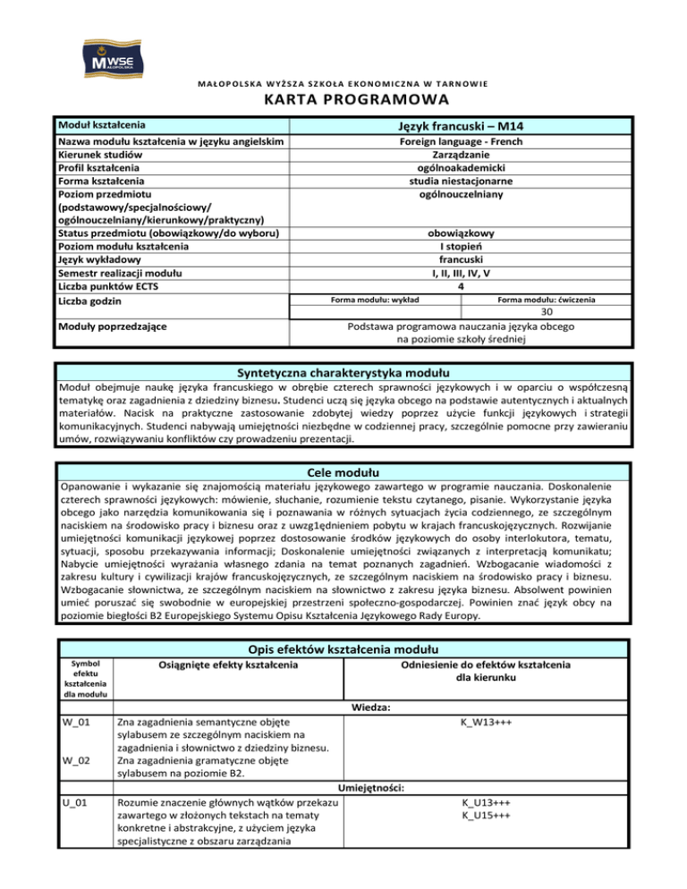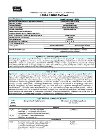 MAŁOP OLSKA WYŻSZ A SZ KOŁA E KONOMICZNA W TARN OW IE KARTA PROGRAMOWA Moduł kształcenia Język francuski – M14 Nazwa modułu kształcenia w języku angielskim Kierunek studiów Profil kształcenia Forma kształcenia Poziom przedmiotu (podstawowy/specjalnościowy/ ogólnouczelniany/kierunkowy/praktyczny) Status przedmiotu (obowiązkowy/do wyboru) Poziom modułu kształcenia Język wykładowy Semestr realizacji modułu Liczba punktów ECTS Liczba godzin Foreign language - French Zarządzanie ogólnoakademicki studia niestacjonarne ogólnouczelniany obowiązkowy I stopień francuski I, II, III, IV, V 4 Forma modułu: wykład Forma modułu: ćwiczenia 30 Podstawa programowa nauczania języka obcego na poziomie szkoły średniej Moduły poprzedzające Syntetyczna charakterystyka modułu Moduł obejmuje naukę języka francuskiego w obrębie czterech sprawności językowych i w oparciu o współczesną tematykę oraz zagadnienia z dziedziny biznesu. Studenci uczą się języka obcego na podstawie autentycznych i aktualnych materiałów. Nacisk na praktyczne zastosowanie zdobytej wiedzy poprzez użycie funkcji językowych i strategii komunikacyjnych. Studenci nabywają umiejętności niezbędne w codziennej pracy, szczególnie pomocne przy zawieraniu umów, rozwiązywaniu konfliktów czy prowadzeniu prezentacji. Cele modułu Opanowanie i wykazanie się znajomością materiału językowego zawartego w programie nauczania. Doskonalenie czterech sprawności językowych: mówienie, słuchanie, rozumienie tekstu czytanego, pisanie. Wykorzystanie języka obcego jako narzędzia komunikowania się i poznawania w różnych sytuacjach życia codziennego, ze szczególnym naciskiem na środowisko pracy i biznesu oraz z uwzg1ędnieniem pobytu w krajach francuskojęzycznych. Rozwijanie umiejętności komunikacji językowej poprzez dostosowanie środków językowych do osoby interlokutora, tematu, sytuacji, sposobu przekazywania informacji; Doskonalenie umiejętności związanych z interpretacją komunikatu; Nabycie umiejętności wyrażania własnego zdania na temat poznanych zagadnień. Wzbogacanie wiadomości z zakresu kultury i cywilizacji krajów francuskojęzycznych, ze szczególnym naciskiem na środowisko pracy i biznesu. Wzbogacanie słownictwa, ze szczególnym naciskiem na słownictwo z zakresu języka biznesu. Absolwent powinien umieć poruszać się swobodnie w europejskiej przestrzeni społeczno-gospodarczej. Powinien znać język obcy na poziomie biegłości B2 Europejskiego Systemu Opisu Kształcenia Językowego Rady Europy. Opis efektów kształcenia modułu Symbol efektu kształcenia dla modułu Osiągnięte efekty kształcenia Odniesienie do efektów kształcenia dla kierunku Wiedza: W_01 W_02 U_01 Zna zagadnienia semantyczne objęte sylabusem ze szczególnym naciskiem na zagadnienia i słownictwo z dziedziny biznesu. Zna zagadnienia gramatyczne objęte sylabusem na poziomie B2. Umiejętności: Rozumie znaczenie głównych wątków przekazu zawartego w złożonych tekstach na tematy konkretne i abstrakcyjne, z użyciem języka specjalistyczne z obszaru zarządzania K_W13+++ K_U13+++ K_U15+++ U_02 U_03 K_01 Potrafi komunikować się w języku na określonym poziomie Potrafi formułować jasne i szczegółowe wypowiedzi ustne lub pisemne wyrazić swoje stanowisko w sprawach będących przedmiotem dyskusji, przedstawiając wady i zalety różnych rozwiązań. Kompetencje społeczne: Rozumie potrzebę ciągłego dokształcania się oraz ma świadomość działań zgodnych z zasadami etyki zawodowej K_K01+++ K_K04++ Treści kształcenia modułu Forma modułu: wykład 1. 2. 3. 4. 5. 6. 7. 8. 9. 10. 11. 12. 13. 14. 1. 2. 3. 4. 5. 6. 7. 8. 9. 10. 11. 12. Forma modułu: ćwiczenia Zagadnienia semantyczne: Praca, zakres odpowiedzialności, praca w zespole, rynki pracy, rekrutacja, ubieganie się o pracę (CV, list motywacyjny, rozmowa kwalifikacyjna), umowa o pracę. Jak zamówić posiłek w restauracji , poprosić o rachunek, zachować się w czasie spotkania businessowego. Dialogi w banku z wykorzystaniem słownictwa specjalistycznego. Technologia Informacyjna, Internet, komputery. Kultura korporacyjna, zachowanie w środowisku pracy Public Relations, wizerunek. Własna firma- zakładanie firmy, biznes plan, finanse, konkurencja, sukces, ryzyko finansowe Rynek – rodzaje rynków, rynki zagraniczne. Handel, techniki i metody sprzedaży. Produkty i usługi. Ubezpieczenia. Kreatywność i motywacja. Unia Europejska, globalizacja, zagadnienia różnic kulturowych. Korespondencja: pisanie, e-mail, listów, raportów, materiałów reklamowych. Negocjacje, aktywny udział w dyskusji, wyrażanie opinii, prezentacje, prowadzenie spotkania. Zagadnienia gramatyczne Czas teraźniejszy + konstrukcja « être en train » de faire qqc (Présent progressif). Czasy przeszłe (Passé composé, Imparfait, PQP, Passé récent), określenia czasu. Czasowniki bezosobowe. Subjonctif présent. Rzeczownik (policzalne i niepoliczalne) określenia ilości+rodz.cząstkowy. Tryb gérondif. Przymiotniki, przysłówki. Stopniowanie i porównywanie. Zaimki względne. Wyrażanie przyszłości (Futur proche, Futur simple, Futur antérieur). Impératif. Okresy warunkowe. Strona bierna. Literatura podstawowa 1. Kaneman-Pougatch, M., Trevisi, S., Café Crème Literatura uzupełniająca 1. 2. Mercier M., Gragnic S., Jak pisać po francusku?, Langenscheidt, 2006. Gajewska E., Sowa M., Piotrowski S., Korespondencja handlowa po francusku, Wiedza Powszechna, 2000. Metody dydaktyczne Zajęcia prowadzone są zgodnie z najnowszymi standardami metodycznymi z wykorzystaniem nowoczesnych materiałów dydaktycznych o zróżnicowanej formie i treści dostosowanej do dynamicznej rzeczywistości społeczno-gospodarczej. Metody służące osiągnięciu skuteczności komunikacji w języku obcym: dyskusja, metoda projektu, prezentacje, praca w grupach, analiza, pytania — odpowiedzi, dialog, burza mózgów. Sytuacje dydaktyczne: słuchanie, ro