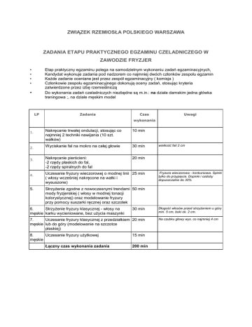 ZWIĄZEK RZEMIOSŁA POLSKIEGO WARSZAWA ZADANIA ETAPU PRAKTYCZNEGO EGZAMINU CZELADNICZEGO W ZAWODZIE FRYZJER Etap praktyczny egzaminu polega na samodzielnym wykonaniu zadań egzaminacyjnych, Kandydat wykonuje zadania pod nadzorem co najmniej dwóch członków zespołu egzamin Każde zadanie oceniane jest przez zespół egzaminacyjny ( komisja ) Członkowie zespołu egzaminacyjnego dokonują oceny zadań, stosując kryteria zatwierdzone przez izbę rzemieślniczą Do wykonania zadań czeladniczych niezbędne są m.in.: na dziale damskim jedna główka treningowa ;, na dziale męskim model • • • • • LP Zadania Czas Uwagi wykonania 1. 2. 3. Nakręcanie trwałej ondulacji, stosując co najmniej 2 techniki nawijania (10 szt. wałków) 10 min Wyciskanie fal na mokro na całej głowie 30 min Nakręcanie pierścieni: -2 rzędy płaskich do fal, -2 rzędy spiralnych do fal 20 min 4. Uczesanie fryzury wieczorowej o modnej linii 25 min ( włosy wcześniej nakręcone na wałki i wysuszone) 5. Strzyżenie zgodne z nowoczesnymi trendami 50 min mody fryzjerskiej ( włosy w modnej tonacji kolorystycznej) oraz modelowanie fryzury przy pomocy suszarki ręcznej oraz szczotek 6. Strzyżenie fryzury klasycznej - włosy na męskie karku wycieniowane, bez użycia maszynki 30 min 7. Uczesanie fryzury klasycznej z przedziałkiem 20 min męskie lub do góry (modelowanie na szczotce płaskiej) 8. Uczesanie fryzury użytkowej męskie Łączny czas wykonania zadania 15 min 200 min wielkość fali 2 cm Fryzura wieczorowa - konkursowa. Spinki tylko do przypięcia. Dopinki i ozdoby dopuszczalne do 30% Długość włosów przed strzyżeniem u góry min. 5 cm, boki ok. 2 cm. Na czubku głowy wys. co najmniej 4 cm
