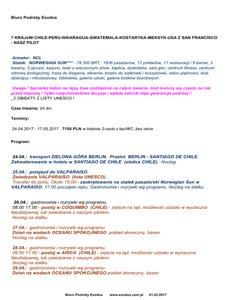 Biuro Podróży Exodus 7 KRAJóW:CHILE-PERU-NIKARAGUA-GWATEMALA-KOSTARYKA-MEKSYK-USA Z SAN FRANCISCO - NASZ PILOT Armator: NCL Statek: NORWEGIAN SUN**** - 78 300 BRT, 1936 pasażerów, 12 pokładów, 11 restauracji i 9 barów, 3 baseny, 5 jacuzzi, kasyno, teatr z wieczornym show, kaplica, dyskoteka, sala gier, centrum fitness, centrum odnowy biologicznej, trasa do biegania, siłownia, boisko do siatkówki i koszykówki, salon piękności, klub dziecięcy i młodzieżowy, biblioteka, galeria sztuki, galeria butików bezcłowych. 2 POLSKICH PILOTÓW Z ZIELONEJ GÓRY ! Uwaga ! Sprzedaż kabin na rejsy trwa codziennie na całym świecie, limit kończy się często na rok przed imprezą ! Tylko natychmiastowa decyzja i wpłata zaliczki daje gwarancje podróży ! 2 OBIEKTY Z LISTY UNESCO ! Czas trwania: 24 dni Terminy: 24.04.2017 - 17.05.2017 7150 PLN w kabinie 2-osob.z łaz/WC, bez okna Program: 24.04.: transport ZIELONA GÓRA BERLIN. Przelot BERLIN - SANTIAGO DE CHILE. Zakwaterowanie w hotelu w SANTIAGO DE CHILE (stolica CHILE). Nocleg. 25.04.: przejazd do VALPARAISO. Zwiedzanie VALPARAISO (lista UNESCO) Transfer do portu. Około 15.00 - zaokrętowanie na statek pasażerski Norwegian Sun w VALPARAISO. 17.00 początek rejsu. Gastronomia i rozrywki wg programu. Nocleg na statku. 26.04.: gastronomia i rozrywki wg programu. 08.00 17.00 - postój w COQUIMBO (CHILE) - zejście na ląd, możliwość udziału w wycieczce fakultatywnej, lub zwiedzania z naszym pilotem. Nocleg na statku. 27.04.: gastronomia i rozrywki wg programu. Dzień na wodach OCEANU SPOKOJNEGO pokład słoneczny, basen Nocleg na statku. 28.04.: gastronomia i rozrywki wg programu. 08.00 17.00 - postój w ARICA (CHILE) - zejście na ląd, możliwość udziału w wycieczce fakultatywnej, lub zwiedzania z naszym pilotem. Nocleg na statku. 29.04.: gastronomia i rozrywki wg programu. Dzień na wodach OCEANU SPOKOJNEGO pokład słoneczny, basen Biuro Podróży Exodus www.exodus.com.pl 01.03.2017 Nocleg na statku. 30.04.: gastronomia i rozrywki wg programu. 07.00 18.00 - postój w LIMIE (port CALLAO) (stolica PERU - lista UNESCO) - zejście na ląd, możliwość udziału w wycieczce fakultatywnej, lub zwiedzania z naszym pilotem. Nocleg na statku. 01.05.: gastronomia i rozrywki wg programu. 10.00 - 17.00 - postój w TRUJILLO (port SALAVERRY ) (PERU) - zejście na ląd, możliwość udziału w wycieczce fakultatywnej, lub zwiedzania z naszym pilotem. Nocleg na statku. 02.05.: gastronomia i rozrywki wg programu. Dzień na wodach OCEANU SPOKOJNEGO pokład słoneczny, basen Nocleg na statku. 03.05.: gastronomia i rozrywki wg programu. Dzień na wodach OCEANU SPOKOJNEGO pokład słoneczny, basen Nocleg na statku. 04.05.: gastronomia i rozrywki wg programu. 08.00 17.00 postój w PUNTARENAS (KOSTARYKA) - możliwość udziału w wycieczce fakultatywnej, lub zwiedzania z naszym pilotem. Nocleg na statku. 05.05.: gastronomia i rozrywki wg programu. 09.00 - 18.00 - postój w CORINTO (NIKARAGUA) - zejście na ląd, możliwość udziału w wycieczce fakultatywnej, lub zwiedzania z naszym pilotem. Nocleg na statku. 06.05.: gastronomia i rozrywki wg programu.08.00 - 17.00 - postój w PUERTO QUETZAL (GWATEMALA) - zejście na ląd, możliwość udziału w wycieczce fakultatywnej, lub zwiedzania z naszym pilote.Nocleg na statku. 07.05.: gastronomia i rozrywki wg programu. 08.00 - 17.00 - postój w PUERTO CHIAPAS (MEKSYK) - zejście na ląd, możliwość udziału w wycieczce fakultatywnej, lub zwiedzania z naszym pilotem. Nocleg na statku. 08.05.: gastronomia i rozrywki wg programu. 08.00 - 17.00 - postój w HUATULCO (MEKSYK) - zejście na ląd, możliwość udziału w wycieczce fakultatywnej, lub zwiedzania z naszym pilotem. Nocleg na statku. 09.05.: gastronomia i rozrywki wg programu. Dzień na wodach OCEANU SPOKOJNEGO pokład słoneczny, basen Nocleg na statku. 10.05.: gastronomia i rozrywki wg programu. Dzień na wodach OCEANU SPOKOJNEGO pokład słoneczny, basen Nocleg na statku. 11.05.: gastronomia i rozrywki wg programu. 07.00 - 16.00 - postój w CABO SAN LUCAS (MEKSYK) - zejście na ląd, możliwość udziału w wycieczce fakultatywnej, lub zwiedzania z naszym pilotem. Biuro Podróży Exodus www.exodus.com.pl 01.03.2017 Nocleg na statku. 12.05.: gastronomia i rozrywki wg programu. Dzień na wodach OCEANU SPOKOJNEGO pokład słoneczny, basen Nocleg na statku. 13.05.: gastronomia i rozrywki wg programu. 08.00 - 18.00 - postój w SAN DIEGO (Kalifornia - USA)- zejście na ląd, możliwość udziału w wycieczce fakultatywnej, lub zwiedzania z naszym pilotem. Nocleg na statku. 14.05.: gastronomia i rozrywki wg programu. Dzień na wodach OCEANU SPOKOJNEGO pokład słoneczny, basen Nocleg na statku. 15.05.: gastronomia i rozrywki wg programu. Około 08.30 wyokrętowanie w SAN FRANCISCO (Kalifornia - USA) Zwiedzanie SAN FRANCISCO Zakwaterowanie w hotelu w SAN FRANCISCO. Nocleg. 16.05.: śniadanie. Zwiedzanie SAN FRANCISCO Transfer na lotnisko. Przeloty SAN FRANCISKO BERLIN 17.05.: transport BERLIN ZIELONA GÓRA. W cenie: kabiny: 20 nocy w kabinie 2-osob.z laz/WC, bez okna. wyżywienie: 20 śniadań + 19 obiadów + 20 kolacji (plus wiele dodatkowych posiłków na statku) coctail kapitański (obowiązuje strój wieczorowy) pilot BP Exodus z Zielonej Góry ubezpieczenie NW, KL, bagaż podatek VAT Dodatkowe opłaty: przeloty: Berlin - Santago de Chile i San Francisco - Berlin - dziś ok.3900 zł transfery lotnisko - hotele - port transport: Zielona Góra - Berlin i z powrotem wycieczki fakultatywne armatora statku (na życzenie) pakiet wycieczek organizowanych przez Exodus przy każdym postoju, z hotelami w Santiago de Chile i w San Francisco (na życzenie) obligatoryjne napiwki na statku Uwaga: Podana cena dotyczy osoby w kabinie 2-osobowej z oknem i jest najniższą dostępną na dany rejs. Ceny różnicują się w zależności od kategorii kabiny, jak również pokładu, na którym znajduje się dana kabina. Ceny ulegają zmianie w zależności od dostępno