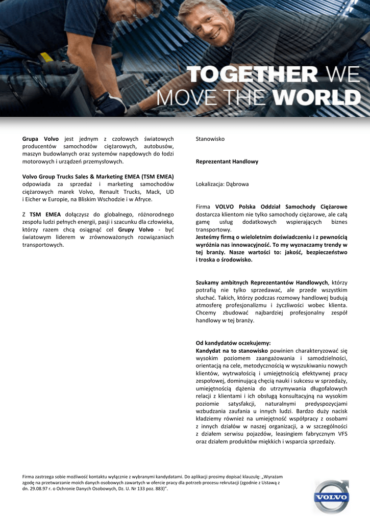 Grupa Volvo jest jednym z czołowych światowych producentów samochodów ciężarowych, autobusów, maszyn budowlanych oraz systemów napędowych do łodzi motorowych i urządzeń przemysłowych. Volvo Group Trucks Sales & Marketing EMEA (TSM EMEA) odpowiada za sprzedaż i marketing samochodów ciężarowych marek Volvo, Renault Trucks, Mack, UD i Eicher w Europie, na Bliskim Wschodzie i w Afryce. Z TSM EMEA dołączysz do globalnego, różnorodnego zespołu ludzi pełnych energii, pasji i szacunku dla człowieka, którzy razem chcą osiągnąć cel Grupy Volvo - być światowym liderem w zrównoważonych rozwiązaniach transportowych. Stanowisko Reprezentant Handlowy Lokalizacja: Dąbrowa Firma VOLVO Polska Oddział Samochody Ciężarowe dostarcza klientom nie tylko samochody ciężarowe, ale całą gamę usług dodatkowych wspierających biznes transportowy. Jesteśmy firmą o wieloletnim doświadczeniu i z pewnością wyróżnia nas innowacyjność. To my wyznaczamy trendy w tej branży. Nasze wartości to: jakość, bezpieczeństwo i troska o środowisko. Szukamy ambitnych Reprezentantów Handlowych, którzy potrafią nie tylko sprzedawać, ale przede wszystkim słuchać. Takich, którzy podczas rozmowy handlowej budują atmosferę profesjonalizmu i życzliwości wobec klienta. Chcemy zbudować najbardziej profesjonalny zespół handlowy w tej branży. Od kandydatów oczekujemy: Kandydat na to stanowisko powinien charakteryzować się wysokim poziomem zaangażowania i samodzielności, orientacją na cele, metodycznością w wyszukiwaniu nowych klientów, wytrwałością i umiejętnością efektywnej pracy zespołowej, dominującą chęcią nauki i sukcesu w sprzedaży, umiejętnością dążenia do utrzymywania długofalowych relacji z klientami i ich obsługą konsultacyjną na wysokim poziomie satysfakcji, naturalnymi predyspozycjami wzbudzania zaufania u innych ludzi. Bardzo duży nacisk kładziemy również na umiejętność współpracy z osobami z innych działów w naszej organizacji, a w szczególności z działem serwisu pojazdów, leasingiem fabrycznym VFS oraz działem produktów miękkich i wsparcia sprzedaży. Firma zastrzega sobie możliwość kontaktu wyłącznie z wybranymi kandydatami. Do aplikacji prosimy dopisać klauzulę: „Wyrażam zgodę na przetwarzanie moich danych osobowych zawartych w ofercie pracy dla potrzeb procesu rekrutacji (zgodnie z Ustawą z dn. 29.08.97 r. o Ochronie Danych Osobowych, Dz. U. Nr 133 poz. 883)”. Co nas wyróżnia? Praca na tym stanowisku zapewni Ci perspektywy rozwoju w organizacji sprzedaży. Jeśli jesteś spoza branży, wprowadzimy Cię w zagadnienia związane z samochodami ciężarowymi i transportem samochodowym. Twój bezpośredni przełożony będzie Cię wspierał w rozwoju. Damy Ci narzędzia wspomagające sprzedaż pojazdów oraz usług dodatkowych. Zagwarantujemy Ci podstawę i wysoce motywujący system prowizyjny uzależniony od wyników sprzedaży samochodów ciężarowych oraz wszystkich produktów miękkich (finansowania, telematyki, kontraktów serwisowych), jak również narzędzia pracy w postaci samochodu służbowego, telefonu komórkowego i laptopa oraz opiekę medyczną w Medicover. Przyślij do nas swoje CV i krótki list motywacyjny. List ten powinien bezpośrednio dotyczyć tego stanowiska i tłumaczyć dlaczego – Twoim zdaniem – jesteś idealnym kandydatem. Jeśli zaprosimy Cię na rozmowę, przygotuj się. Dowiedz się więcej o VOLVO Trucks, oferowanych przez nas modelach i usługach dodatkowych. Przygotuj sobie kilka pytań, na które nie znalazłeś odpowiedzi w tym ogłoszeniu, a będą dla Ciebie pomocne w procesie podejmowania decyzji. Zaaplikuj, klikając TUTAJ Zakres odpowiedzialności: Do Twoich obowiązków będzie należała sprzedaż nowych i używanych pojazdów ciężarowych VOLVO, finansowania fabrycznego, systemu telematycznego, kontraktów serwisowych, szkoleń doskonalenia ekonomicznej jazdy, ciągłe dążenie do pozyskiwania nowych klientów, systematyczne uzupełnianie informacji w CRM, pozwalające na utrzymywanie efektywnych kontaktów z dotychczasowymi klientami oraz raportowanie postępów w pozyskiwaniu nowych. Kliknij poniżej, aby dowiedzieć się więcej na temat firmy oraz stanowiska: https://www.youtube.com/watch?v=t8riQ5OdIRA&feature =youtu.be Firma zastrzega sobie możliwość kontaktu wyłącznie z wybranymi kandydatami. Do aplikacji prosimy dopisać klauzulę: „Wyrażam zgodę na przetwarzanie moich danych osobowych zawartych w ofercie pracy dla potrzeb procesu rekrutacji (zgodnie z Ustawą z dn. 29.08.97 r. o Ochronie Danych Osobowych, Dz. U. Nr 133 poz. 883)”.