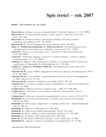 229 Spis treści – rok 2007 Autor: Tytuł artykułu [nr, str, dział] Baczewski A.: Kolejny rok pracy Komisji Kultury Fizycznej i Sportu [1-3, 127, WPS] Baczewski A.: O mistrzostwach Europy w piłce nożnej w roku 2012 i nie tylko [4-6, 183, NK] Baczewski A.: Ostatnie półrocze prac Komisji Kultury Fizycznej i Sportu – niedokończona kadencja [7-9, 193, WPS] Baranowski T.: System treningu biegowego Danielsa [7-9, 176, NK] Bober T., Rutkowska-Kucharska A., Pietraszewski B.: Ćwiczenia plyometryczne – charakterystyka biomechaniczna, wskaźniki, zastosowania [7-9, 5, BS] Cajsel W.: Zaszczyt czy obowiązek, czyli o stosunku do reprezentowania kraju [7-9, 198, PRS] Cajsel W.: Zwalczanie dopingu w sporcie w świetle przepisów „Ustawy o sporcie kwalifikowanym” [1-3, 82, PRS] Chmura J.: Najpierw opis, potem zapis i analiza, a na końcu wnioski i teoretyczne uogólnienia (w odpowiedzi W. Petryńskiemu) [4-6, 176, KR] Chmura J., Nazar K., Kaciuba-Uściłko H.: Psychomotoryczny próg zmęczenia [4-6, 27, FS] Chrostowski K.: Lista środków dopingowych Światowej Agencji Anty-Dopingowej 2007 r. [1-3, 143, KR] Chrostowski K.: Lista środków i metod dopingu Światowej Agencji Antydopingowej w 2008 roku [10-12, 191, R] Chrostowski K.: Paszport biologiczny zawodnika [10-12, 185, R] Czajkowski Z.: Co znaczy optimum wiedzy i umiejętności w szkoleniu początkowym? [10-12, 51, PM] Czajkowski Z.: Wakacje kierowcy autobusowego – 2007 [7-9, 200, KR] Czajkowski Z.: Zmienność i różnorodność w doborze i prowadzeniu ćwiczeń [1-3, 38, PM] Czajkowski Z.: Znaczenie stosunków międzyludzkich w pracy trenera [7-9, 48, TT] Dembiński J.: Ćwiczenia plyometryczne w treningu skocznościowym koszykarzy [10-12, 58, PM] Dominiak A.: Kilka uwag o diagnostyce w treningu sportowym – artykuł dyskusyjny [10-12, 194, R] Dominiak A.: Kłopoty ze statystyką [7-9, 205, SO] Dominiak A.: Piłka nożna uratuje lekkoatletykę? [10-12, 214, SO] Dominiak A.: Sport, edukacja i przeciwdziałanie podłoża [1-3, 145, SO] Dominiak A.: Strategia i myśl szkoleniowa [4-6, 190, SO] Duda H.: Krótka historia Mistrzostw Europy w piłce nożnej [4-6, 5, TM] Dziubiński Z.: Agresja w sporcie z perspektywy socjologicznej [1-3, 75, SS] „Sport Wyczynowy” 2007, nr 10-12/514-516 230 treści – rok 2007 Spis Grabowska A.: Dawny sport na dawnych plakatach [10-12, 151, SKS] Hądzelek K.: Sport Polski Walczącej 1939-1945 [1-3, 120, NK] Iskra J., Gasilewski J.: Gibkość w treningu płotkarskim – fakty szkoleniowe i empiryczne [4-6, 36, TT] Kędzior M.: Autonomia organizacji sportowych w świetle prawa polskiego i Unii Europejskiej [1-3, 6, TM] Klusiewicz A.: Trening mięśni oddechowych a zdolność wysiłkowa zawodników [7-9, 71, FS] Klusiewicz A. i in.: Wioślarskie bezpośrednie przygotowanie startowe – fizjologiczne wskaźniki kontroli obciążeń treningowych [10-12, 17, TT] Kłodecka-Różalska J.: Psychologiczne bezpośrednie przygotowanie startowe (BPS) [4-6, 75, PPS] Kłodecka-Różalska J.: Zabrakło im „złości sportowej” [1-3, 45, PPS] Kosmol M., Kosmol A., Kuder A., Kosmol M.: Skuteczność i efektywność ataku grze w piłkę siatkową [7-9, 36, TT] Kosowski J.: Stypendium trenerskie – założenia, wątpliwości, perspektywy funkcjonowania [10-12, 86, PRS] Królak A.: Dwuręczny bekhend [4-6, 66, PM] Królak A.: Struktura meczu tenisa zawodników klasy światowej (Roger Federer – Novak Djokovic, Flushing Meadows 2007) – analiza przypadku [10-12, 29, TT] Laskowski R.: Próba testowa do oceny specjalnych możliwości wysiłkowych zawodniczek judo [1-3, 17, TT] Lees A.: Zastosowanie biomechaniki w sportach z użyciem rakiet i rakietek [4-6, 83, BS] Lipiec J.: Pożegnanie z Olimpią [1-3, 51, FS] Martyn A., Gawlikowski K., Jaworska M.: Wpływ wysiłku fizycznego/zmęczenia na utrzymanie równowagi strzeleckiej przez pięcioboistów [10-12, 75, FS] Mroczkowska H.: Dyspozycje psychiczne zawodników warunkujące wysokie osiągnięcia sportowe – studium przypadku [4-6, 91, PPS] Nietubyć P.: Urazy sportowe (1). Biodro, kończyna dolna – diagnostyka, postępowanie leczniczo-rehabilitacyjne [4-6, 98, MSR] Nietubyć P.: Urazy sportowe (2). Kończyna górna [7-9, 58, MSR] Nowicki D.: Gorące serce i zimna głowa [10-12, 206, KR] Pac-Pomarnacki A.: Jak zwalczać korupcję w sporcie – rozmowa z prof. Andrzejem J. Szwarcem z Uniwersytetu im. Adama Mickiewicza w Poznaniu [10-12, 127, WD] Pac-Pomarnacki A.: Korupcja w sporcie [10-12, 4, TM] Pac-Pomarnacki A.: Między nauką a praktyką sportu – rozmowa z prof. Januszem Iskrą z Akademii Wychowania Fizycznego w Katowicach [4-6, 125, WD] Pac-Pomarnacki A.: Piłka siatkowa – ta sama, ale nie taka sama – rozmowa z Alojzym Świderkiem, II trenerem męskiej reprezentacji Polski w piłce siatkowej [1-3, 111, WD] Pac-Pomarnacki A.: Sport, nauka, technika, etyka, czyli przypadek Oscara Pistoriusa – rozmowa z prof. Andrzejem Witem z Akademii Wychowania Fizycznego w Warszawie [7-9, 151, WD] Pac-Pomarnacki A.: Strategia rozwoju sportu w Polsce do 2015 roku – Priorytet 2. Wzrost poziomu wyników sportowych (komentarz) [4-6, 10, TM] Petryński W.: Czy uczy się tylko głowa? [10-12, 206, BPN] Petryński W.: Jak się robi naukę w Ameryce [1-3, 149, BPN] Spis treści – rok 2007 231 Petryński W.: O programie BANAL, taśmie wideo i szerokokątnym obiektywie [1-3, 133, KR] Petryński W.: Oblicza energii [4-6, 193, BPN] Petryński W.: O ruchach człowieka po australijsku – “The Biophysical Foundations of Human Movement” [4-6, 134, NK] Petryński W.: Przenoszenie, skojarzenia, inteligencja [7-9, 205, BPN] Petryński W.: Złość i agresja (nawet optymalna) nie sprzyjają skutecznym działaniom w walce sportowej [10-12, 209, KR] Piechota R.: Reklama i sponsoring w transmisji sportowej [4-6, 111, PRS] Piechota R.: Trzecia Światowa Konferencja Doping w Sporcie, Madryt, 15-17 listopada 2007 r. [10-12, 172, KK] Przedpełska A. Królak A.: Jak Amerykanie uczą 