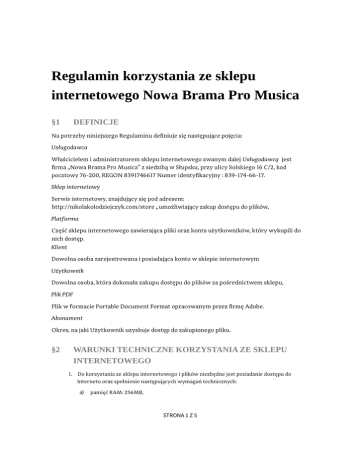 Regulamin korzystania ze sklepu internetowego Nowa Brama Pro Musica §1 DEFINICJE Na potrzeby niniejszego Regulaminu definiuje się następujące pojęcia: Usługodawca Właścicielem i administratorem sklepu internetowego zwanym dalej Usługodawcą jest firma „Nowa Brama Pro Musica” z siedzibą w Słupsku, przy ulicy Solskiego 16 C/2, kod pocztowy 76-200, REGON 8391746617 Numer identyfikacyjny : 839-174-66-17. Sklep internetowy Serwis internetowy, znajdujący się pod adresem: http://nikolakolodziejczyk.com/store , umożliwiający zakup dostępu do plików, Platforma Część sklepu internetowego zawierająca pliki oraz konta użytkowników, który wykupili do nich dostęp. Klient Dowolna osoba zarejestrowana i posiadająca konto w sklepie internetowym Użytkownik Dowolna osoba, która dokonała zakupu dostępu do plików za pośrednictwem sklepu, Plik PDF Plik w formacie Portable Document Format opracowanym przez firmę Adobe. Abonament Okres, na jaki Użytkownik uzyskuje dostęp do zakupionego pliku. §2 WARUNKI TECHNICZNE KORZYSTANIA ZE SKLEPU INTERNETOWEGO 1. Do korzystania ze sklepu internetowego i plików niezbędne jest posiadanie dostępu do Internetu oraz spełnienie następujących wymagań technicznych: a) pamięć RAM: 256MB, STRONA 1 Z 5 REGULAMIN KORZYSTANIA ZE SKLEPU INTERNETOWEGO NOWA BRAMA PRO MUSICA b) karta grafiki: pracująca w rozdzielczości minimum 1024x768, c) system operacyjny: Microsoft Windows 98 lub wyższy, OS X 10.6.8 lub wyższy, Linux Debian Wheezy lub wyższy, d) przeglądarka Google Chrome 38 lub wyższe, MSIE 7.0 lub wyższe, Firefox 2.0 lub wyższe, e) zainstalowany program do odczytu plików PDF — Adobe Acrobat Reader 2. Jeżeli Klient lub Użytkownik nie spełnił wymogów technicznych Usługodawca nie ponosi odpowiedzialności za brak możliwości korzystania z usługi lub jej części, wynikający z niewłaściwej przeglądarki, niepoprawnej konfiguracji oprogramowania lub sprzętu oraz nie gwarantuje, że korzystanie z usługi będzie możliwe w pełnym zakresie przy użyciu każdej konfiguracji sprzętu i oprogramowania. §3 CENY I PŁATNOŚCI 1. Wszystkie ceny podane na stronach sklepu są cenami brutto (zawierają 23% podatek VAT). Ostateczna, wiążąca cena jest widniejąca przy produkcie w momencie złożenia zamówienia przez Klienta. 2. Usługodawca może przyznać rabat na dowolny produkt oferowany w sklepie internetowym. Warunki przyznawania rabatów są określone na podstronie „Program rabatowy”. Warunki przyznawania rabatów mogą ulegać zmianie. Wiążąca jest wysokość rabatu przyznana w momencie złożenia zamówienia przez Klienta. 3. Na dostęp do plików sprzedawany w sklepie internetowym Usługodawca wystawia faktury. W celu otrzymania faktury należy odpowiednio zaznaczyć pole Chcę otrzymać fakturę podczas realizacji transakcji w kreatorze zakupów. Faktura zostanie przesłana pocztą na adres podany w formularzu. 4. Możliwe są następujące bezpieczne formy płatności: a) Przelewem online za pośrednictwem firmy Przelewy24.pl b) Przelewem tradycyjnym. Usługodawca przesyła e-mail zawierający numer rachunku bankowego. 5. Po zaksięgowaniu wpłaty Usługodawca wysyła e-mail z loginem i hasłem umożliwiającym dostęp do plików. §4 SPRAWNE FUNKCJONOWANIE SKLEPU INTERNETOWEGO 1. Usługodawca dokłada wszelkich starań, aby sklep internetowy działał bez usterek. Jednak ze względu na niezbędne prace konserwacyjne i modernizacyjne mogą wystąpić przerwy w działaniu. Usługodawca nie ponosi odpowiedzialności za przerwy w działaniu sklepu. 2. Jeśli przerwa w działaniu sklepu uniemożliwiła dostęp do wcześniej odblokowanego pliku w STRONA 2 Z 5 REGULAMIN KORZYSTANIA ZE SKLEPU INTERNETOWEGO NOWA BRAMA PRO MUSICA czasie trwania abonamentu Usługodawca może przedłużyć abonament na podstawie zgłoszenia w formie wiadomości e-mail, która powinna zawierać login, numer transakcji i datę próby dostępu do pliku udostępnianego Klientowi. §5 ZASADY KORZYSTANIA Z DOSTĘPU DO PLIKÓW 1. Użytkownik loguje się do sklepu internetowego, gdzie zamieszczony jest plik korzystając z przesłanego w osobnym e-mailu loginu i hasła. 2. Użytkownik ma dostęp do zakupionego pliku 24 godziny na dobę przez 7 dni w tygodniu w ramach czasu trwania abonamentu i dostępności sklepu internetowego. 3. Niedozwolone jest udostępnianie posiadanego konta innym osobom. Użytkownik zobowiązuje się do niepodejmowania prób uzyskania dostępu do zasobów, do których nie ma uprawnień. 4. Usługodawca zastrzega sobie prawo cofnięcia przydzielonego loginu i hasła (konta) do sklepu internetowego Użytkownikowi, który: a) manipuluje bądź usiłuje manipulować treścią platformy przez działania zagrażające zastosowanemu oprogramowaniu lub mające na celu jego destabilizację, b) w sprzeczny z dobrymi obyczajami sposób zakłóca funkcjonowanie społeczności serwisu np. poprzez grożenie bądź nękanie innych użytkowników serwisu, c) W przypadku, gdy zablokowanie lub usunięcie konta jest wynikiem naruszeń niniejszego regulaminu lub przepisów obowiązującego prawa ze strony Użytkownika, opłata abonamentowa za wykupione zamówienie nie jest zwracana. d) W związku z tym, że Usługodawca dba w wysokim stopniu o dobro Użytkowników serwisu, zastrzega sobie prawo do czasowego zablokowania dostępu do platformy w przypadku zaistnienia jakichkolwiek wątpliwości, że Użytkownik wykorzystuje je niezgodnie z celami istnienia platformy. 5. Użytkownik może w każdej chwili zaprzestać korzystania z usługi i skasować założone konto, wysyłając odpowiednią informację na adres Usługodawcy podany na stronie Kontakt. Opłata za niewykorzystaną część abonamentu nie jest zwracana. 6. Zgadzając się na rozpoczęcie wykonywania usługi przed upływem terminu do odstąpienia od umowy Użytkownik zgadza się na brak możliwości odstąpienia od umowy po jej wykonaniu. a) §6 w przypadku braku zgody na roz