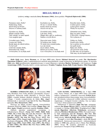 Wojciech Dąbrowski – Przeboje światowe HELLO, DOLLY tytułowy swing z musicalu Jerry Hermana (1964), słowa polskie: Wojciech Dąbrowski (2006) 1. 2. 3. Pamiętasz mnie, Dolly? Padał śnieg, Dolly, Stroił śnieg na Święta Drzewa w srebrną szadź. Kochałem cię, Dolly, W noc i w dzień! Dolly, Każdy dzień tej wiosny Jeszcze mi się śni. Rzuciłaś mnie, Dolly, Czułem gniew, Dolly, Latem gniew narasta, Wtedy los się mści. Ujrzałem cię, Dolly, Miałaś wdzięk! Dolly, Taki wdzięk, że mnie opętał, I nie mogłem spać. Zwodziłaś mnie, Dolly, Całe dnie, Dolly, Długie dnie, gdy ja, zazdrosny, Stałem u twych drzwi. Zdradziłaś mnie, Dolly, Bóg wie gdzie, Dolly, Z byle kim, z innego miasta... Nie wybaczę ci! Uwiodłaś mnie, Dolly, Czemu nie? Dolly, Każdy lgnie do takich kobiet, To był szał! Człowiek zmiękł, Dolly, Pokonałem lęk, Dolly, Uwierzyłem, że cię będę miał! Dręczyłaś mnie, Dolly, W każdym śnie, Dolly, W moim śnie zostałaś jedna, Los tak chciał. Życie mknie, Dolly, Byłem już na dnie, Dolly Lecz wierzyłem, że cię będę miał. Zabiję cię, Dolly, Został cierń, Dolly, Już za późno na twą miłość! Już padł strzał. Będę sam, Dolly, Ale pewność mam, Dolly Że nikt inny cię nie będzie... Nikt inny cię nie będzie miał! Hello Dolly (muz. Jerry Herman, ur. 10 lipca 1933 roku, libretto Michael Steward wg sztuki The Matchmaker Thorntona Wildera), jeden z najsłynniejszych musicali amerykańskich, został wystawiony na Broadwayu (prem. 16 stycznia 1964 roku, 2844 przedstawień), spopularyzowany w wersji filmowej z udziałem Barbry Streisand w roli tytułowej i Luisa Armstronga (1969). Piosenkę mieli w swoim repertuarze: Frankie Vaughan, Kenny Ball, Frank Sinatra i Ella Fitzgerald. BARBRA STREISAND (Babs, ur. 24 kwietnia 1942 roku, Brooklyn, New York), aktorka i piosenkarka, reżyser i producent, ukończyła studia aktorskie w Nowym Jorku (1961), wygrała konkurs młodych talentów w Greenwich Village, i została zaangażowana do klubu Blue Angel. Debiutowała w musicalu I can Get It For You Wholesale (piosenka Miss Marmelstein, 1962). Pierwszy jej album uzyskał nagrodę Amerykańskiej Akademii Płytowej (1963), dwie kolejne (Happy Days Are Here Again i People) przyniosły nagrody Grammy (1964). Zdobyła ogromna popularność występując w kilkudziesięciu filmach: Funny Girl (1968), Hallo Dolly (1969), On a Clear Day You Can See Forever i The Owl and the Pussycat (1970), What’s Up, Doc i Up the Sandbox (1972), The Way We Were (Oscar, 1973), For Pete’s Sake (1974), Funny Lady (1975), A Star is Born (z przebojem Evergreen, 1976), The Main Event (1979), All Night Long (1981), Yenti (1983), Nuts (1987), The Prince of Tides (1991), The Mirror Has Two Faces (1996), Meet the Focker (2004). LUIS DANIEL ARMSTRONG (ur. 4 lipca 1900 roku, Nowy Orlean, zm. 6 lipca 1971 roku), murzyński trębacz, kompozytor i wokalista, nazywany królem jazzu, jest przedstawicielem klasycznego jazzu nowoorleańskiego. Od dziecka wykazywał wielkie zdolności muzyczne, organizując z kolegami kwartet wokalny. Gry na trąbce uczył się w domu poprawczym (1914). Debiutował w orkiestrze Kida Ory’ego, zastępując trębacza Joe Kinga Olivera (1917), z którym grał później w zespole w Chicago (1922-1924). Współpracował z Barneyem Bigardem, Albertem Nicholasem, nowojorską orkiestrą Fletchera Hendersona (1924). Prowadził zespoły Luis Armstrong and his Stompers, Hot Five, Hot Seven (1925-1928) i All Stars (1944-1948). Najbardziej znane utwory: Mack the Knife, Kiss of Fire, Ramona. Wystąpił w rewii Hot Chocolates i około 90 filmach fabularnych, historyczno-muzycznych i dokumentalnych (debiut w 1930 roku, główna rola w filmie New Orleans, 1947). Swoje 70. urodziny obchodził na Festiwalu jazzowym w Newport (4 lipca 1970 roku).
