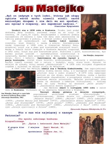 „Był on jedynym z tych ludzi, którzy jak słupy ogniste wśród mroku niewoli wiedli naród wzniosłymi drogami i nie dali mu ani spodleć, ani zginąć w rozpaczy, ani zapomnieć nadziei.” Stanisław Wyspiański Urodził się w 1838 roku w Krakowie. Trudno jest podać dokładną datę urodzin, poniewaŜ znane są aŜ trzy: 24 czerwca, 28 lipca,30 lipca. Encyklopedie i słowniki podają najczęściej 24 czerwca i taka teŜ data jest umieszczona na tablicy pamiątkowej w pokoju, w którym urodził się Matejko. Jan od najmłodszych lat bardzo lubił rysować, niestety, miał kłopoty z nauką w szkole. Systematyczną naukę rozpoczął w 1848 roku w Gimnazjum Świętej Anny, Autoportret, wcześniej uczył się w domu pod kierunkiem starszych braci. 1892 Naukę w Szkole Sztuk Pięknych w Krakowie Matejko rozpoczął w 1852 roku. Uczył się pod kierunkiem prof. Stattlena i prof. Łuszczkiewicza. Był bardzo pilnym uczniem - systematycznie uczestniczył w Jan Matejko, Autoportret zajęciach, bardzo duŜo pracował teŜ w domu, nie wyłączając świąt, ferii i wakacji. Zamiłowanie do rysunku łączył z pasją historyka, czytał stare kroniki, przerysowywał ilustracje z encyklopedii, bardzo często rysował teŜ z natury - budynki, mury, starą broń. Rysunki te wklejał do albumu, który nazwał „Skarbczykiem’’. W 1858 roku otrzymał stypendium rządowe i wyjechał na dalsze studia do Monachium. W 1864 roku Jan Matejko oŜenił się z Teodorą Giebułtowską. Sam zaprojektował suknię ślubną swojej Ŝony, a w następnym roku namalował „Portret Ŝony w sukni ślubnej”. W 1879 roku namalował portret po raz drugi, poniewaŜ Teodora, osoba o bardzo gwałtownym charakterze, w przypływie złości i zazdrości pierwszą wersję zniszczyła. Matejko portretował Ŝonę takŜe na obrazach o tematyce historycznej - królowa Bona ma rysy Teodory na obrazach „Hołd pruski’’ i „Zawieszenie dzwonu Zygmunta’’. Jan Matejko zmarł 1 listopada 1893 roku w swoim domu w Krakowie. Pochowano go na cmentarzu Rakowickim w Krakowie. Tworzył obrazy głównie z dziejów ojczystych, Jan Matejko, Stańczyk w czasie balu poprzedzone wnikliwymi studiami historycznymi i na dworze królowej Bony wobec zabytkoznawczymi. Główne dzieła to: „Stańczyk” (1862), straconego Smoleńska, 1862 „Kazanie Skargi” (1864), „Rejtan” (1866), „Unia Lubelska” (1869), „Stefan Batory pod Pskowem” (1872), „Zawieszenie dzwonu Zygmunta” (1874), „Bitwa pod Grunwaldem” (1878), „Hołd pruski” (1882), „Sobieski pod Wiedniem” (1883), „Kościuszko pod Racławicami” (1888), „Konstytucja 3 Maja” (1891) oraz cykl „Dzieje cywilizacji w Polsce” (1889). Opracowała: Dagmara Mikołajewska, kl. IVa Kto z nas wie najwięcej o naszym Patronie? Oto wyniki szkolnego konkursu biograficznego pt: „śycie i twórczość Jana Matejki” W grupie klas III: I miejsce Kamil Wasiak, kl. IIIa wyróŜnienie Dagmara Jas, kl. IIIb Weronika Dąbrowicz, kl. IIIb Aleksandra Chmielińska, kl. IIIb Jagoda Pruska, kl. IIIa Igor Waliszewski, kl. IIIa W grupie klas I miejsce śaneta Zając, kl. IV: IVb Piotr Wenda, kl. IVa II miejsce Łucja Najdecka, kl. IVb III miejsce Angelika Pruska, kl. IVc W grupie klas I miejsce Iwona Majewska, kl. V: Vc II miejsce śaneta Jabłońska, kl. Vb III miejsce Natalia Pietrzak, kl. Vb W grupie klas I miejsce Klaudia Sowik, kl. VI: VIa II miejsce Martika Paduch, kl. VIc III miejsce Anna Michalak, kl. VIa Wszystkim uczestnikom konkursu dziękuję za udział, a laureatom serdecznie gratuluję osiągniętych wyników! 4 M. Holak - Kumycz Jan Matejko, Zygmunt August prezentuje na dworze Barbarę Radziwiłłównę