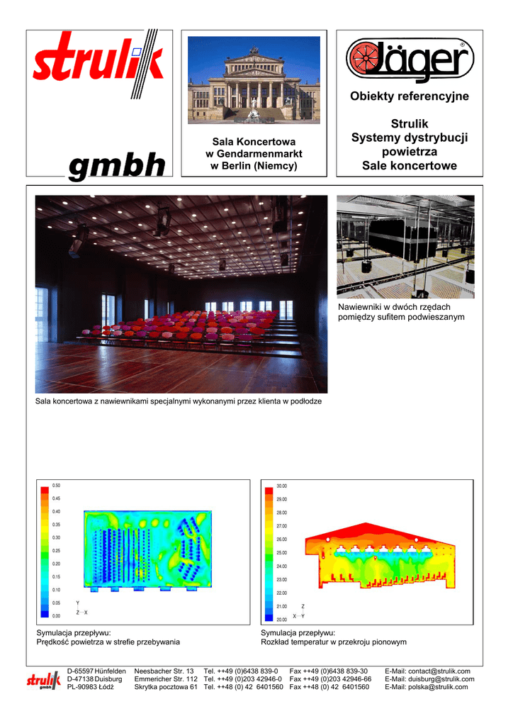 Obiekty referencyjne Sala Koncertowa w Gendarmenmarkt w Berlin (Niemcy) Strulik Systemy dystrybucji powietrza Sale koncertowe Nawiewniki w dwóch rzędach pomiędzy sufitem podwieszanym Sala koncertowa z nawiewnikami specjalnymi wykonanymi przez klienta w podłodze Symulacja przepływu: Prędkość powietrza w strefie przebywania D-65597 Hünfelden D-47138 Duisburg PL-90983 Łódź Symulacja przepływu: Rozkład temperatur w przekroju pionowym Neesbacher Str. 13 Tel. ++49 (0)6438 839-0 Fax ++49 (0)6438 839-30 Emmericher Str. 112 Tel. ++49 (0)203 42946-0 Fax ++49 (0)203 42946-66 Skrytka pocztowa 61 Tel. ++48 (0) 42 6401560 Fax ++48 (0) 42 6401560 E-Mail: [email protected] E-Mail: [email protected] E-Mail: [email protected] Zamontowane produkty: 14 specjalnych nawiewników kombinowanych, każdy z 2 modyfikowanych nawiewników wirowych typu VDS z dodatkową sekcją wyporową Sala koncertowa w Gendarmenmarkt w Berlin (Germany) Strulik Systemy dystrybucji powietrza Sale koncertowe Właściciel budynku: Konzerthaus Berlin Gendarmenmarkt 2 D-10106 Berlin Nawiewnik Wymagania: Rozwiązanie: Sala Koncertowa w Gendarmenmarkt w Berlinie ma powierzchnie podłogi 28.5 x 15 m I sufit podwieszany na wysokości 5.3 m. System klimatyzacji I wentylacji 3 potrzebuje powietrza nawiewanego w ilości 25.800 m /h. Nawiew realizowany w dwóch rzędach po 7 nawiewników w rzędzie, na długości sali. Zamontowano 14 nawiewników na wysokości 6.2 m powyżej podwieszanego metalowego ażurowego sufitu. Odległość pomiędzy każdym z nawiewników wynosił 2.64 m. Warunki komfortu muszą być zapewnione przy różnicy temperatur 10 K poniżej temperatury w pomieszczeniu. Poziom dźwięku nie może być wyższy niż 25 dB(A). Aby spełnić wymagania aerodynamiczne zostały zaprojektowane dwa typy nawiewników, natomiast tylko jeden z nich spełnił kryterium akustyczne. Do odpowiedniego nawiewnika użyto specjalnej skrzynki rozprężnej z dwoma nawiewnikami wirowymi o zmiennym charakterze wypływającej strugi powietrza typu VDS. Część powietrza zostało puszczone sekcją wyporową. GTD z Drezna, Niemcy kooperowało ze Strulikiem przy numerycznej symulacji i testów nawiewników. ECE Projectmanagement z Hamburga, Niemcy byli konsultantami projektu (Consulting Engineers). D-65597 Hünfelden D-47138 Duisburg PL-90983 Łódź Neesbacher Str. 13 Tel. ++49 (0)6438 839-0 Fax ++49 (0)6438 839-30 Emmericher Str. 112 Tel. ++49 (0)203 42946-0 Fax ++49 (0)203 42946-66 Skrytka pocztowa 61 Tel. ++48 (0) 42 6401560 Fax ++48 (0) 42 6401560 E-Mail: [email protected] E-Mail: [email protected] E-Mail: [email protected]