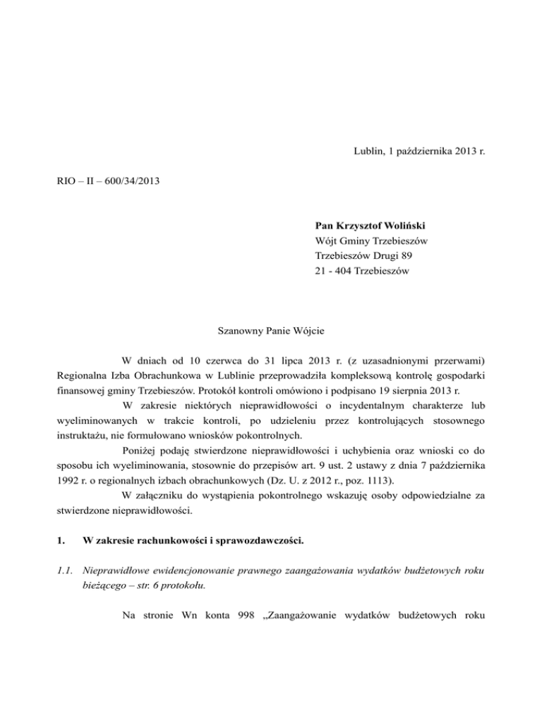 Lublin, 1 października 2013 r. RIO – II – 600/34/2013 Pan Krzysztof Woliński Wójt Gminy Trzebieszów Trzebieszów Drugi 89 21 - 404 Trzebieszów Szanowny Panie Wójcie W dniach od 10 czerwca do 31 lipca 2013 r. (z uzasadnionymi przerwami) Regionalna Izba Obrachunkowa w Lublinie przeprowadziła kompleksową kontrolę gospodarki finansowej gminy Trzebieszów. Protokół kontroli omówiono i podpisano 19 sierpnia 2013 r. W zakresie niektórych nieprawidłowości o incydentalnym charakterze lub wyeliminowanych w trakcie kontroli, po udzieleniu przez kontrolujących stosownego instruktażu, nie formułowano wniosków pokontrolnych. Poniżej podaję stwierdzone nieprawidłowości i uchybienia oraz wnioski co do sposobu ich wyeliminowania, stosownie do przepisów art. 9 ust. 2 ustawy z dnia 7 października 1992 r. o regionalnych izbach obrachunkowych (Dz. U. z 2012 r., poz. 1113). W załączniku do wystąpienia pokontrolnego wskazuję osoby odpowiedzialne za stwierdzone nieprawidłowości. 1. W zakresie rachunkowości i sprawozdawczości. 1.1. Nieprawidłowe ewidencjonowanie prawnego zaangażowania wydatków budżetowych roku bieżącego – str. 6 protokołu. Na stronie Wn konta 998 „Zaangażowanie wydatków budżetowych roku 2 bieżącego” ujmować równowartość sfinansowanych wydatków budżetowych w danym roku budżetowym i równowartość zaangażowanych wydatków, które będą obciążały wydatki roku następnego, zaś na stronie Ma tego konta – zaangażowanie wydatków, czyli wartość umów, decyzji i innych postanowień, których wykonanie spowoduje konieczność dokonania wydatków budżetowych w roku bieżącym, zgodnie z zasadami funkcjonowania tego konta, określonymi w załączniku Nr 3 do rozporządzenia Ministra Finansów z dnia 5 lipca 2010 r. w sprawie szczególnych zasad rachunkowości oraz planów kont dla budżetu państwa, budżetów jednostek samorządu terytorialnego, jednostek budżetowych, samorządowych zakładów budżetowych, państwowych funduszy celowych oraz państwowych jednostek budżetowych mających siedzibę poza granicami Rzeczypospolitej Polskiej (Dz. U. z 2013 r., poz.289), powoływanego w dalszej części tego wystąpienia jako „rozporządzenie Ministra Finansów z dnia 5 lipca 2010 r.”. 1.2. Nieprowadzenie ewidencji analitycznej do konta 902 „Wydatki budżetu” według podziałek klasyfikacji budżetowej, w zakresie wydatków realizowanych przez urząd gminy – str. 8 protokołu. Prowadzić ewidencję analityczną do konta 902 „Wydatki budżetu” w sposób umożliwiający ustalenie stanu poszczególnych wydatków budżetu wg podziałek klasyfikacji, stosownie do zasad funkcjonowania tego konta, określonych w załączniku Nr 2 do rozporządzenia Ministra Finansów z dnia 5 lipca 2010 r. 1.3. Niewyksięgowanie z konta 011 „Środki trwałe” środków trwałych ( w tym gruntów) przekazanych jednostkom organizacyjnym miasta w trwały zarząd oraz nieujęcie na tym koncie wartości gruntów oznaczonych w ewidencji geodezyjnej symbolem „dr” – str. 8-9 protokołu. Ewidencję środków trwałych prowadzić tak, aby stanowiła ona aktualny wykaz posiadanych składników majątkowych, zapewniając rzetelność ksiąg rachunkowych w rozumieniu art. 24 ust. 2 ustawy z dnia 29 września 1994 r. o rachunkowości (Dz. U. z 2013 r., poz. 330 z późn. zm.). Ująć w ewidencji księgowej wartość wszystkich gruntów komunalnych oraz wyksięgować wartość gruntów przekazanych jednostkom organizacyjnym w trwały zarząd, zgodnie z zasadami funkcjonowania konta 011 „Środki trwałe”, określonymi w załączniku Nr 3 do rozporządzenia Ministra Finansów z dnia 5 lipca 2010 r. w związku z przepisami § 2 pkt 5 tego rozporządzenia. 1.4. Wykazanie w sprawozdaniu Rb-28S niezgodnych z ewidencją księgową danych w zakresie zaangażowania wydatków budżetowych roku 2012. (w dz. 600 rozdz. 60016 § 6050) – 3 str. 12, 13 protokołu. W sprawozdaniu Rb-28S „Miesięczne/roczne sprawozdanie z wykonania planu wydatków budżetowych jednostki samorządu terytorialnego” wykazywać kwoty zgodne z danymi wynikającymi z ewidencji księgowej, stosownie do przepisów § 6 ust. 1 pkt 1 i § 9 ust. 2 rozporządzenia Ministra Finansów z dnia 3 lutego 2010 r. w sprawie sprawozdawczości budżetowej (Dz. U. Nr 20, poz.103). 1.5. Nieprawidłowe sporządzenie sprawozdania Rb-PDP za 2012 r., przez: - zawyżenie skutków obniżenia górnych stawek w podatku rolnym (o 243 zł),w wyniku ich wyliczenia za nieprawidłowy okres oraz w podatku od nieruchomości (o 1.241,06 zł), w wyniku ich wyliczenia dla budynków zajętych na cele oświatowe, zwolnionych ustawowo z podatku, niewyliczenia ich dla gminnego budynku oraz w wyniku błędów rachunkowych, - zaniżenie skutków udzielonych ulg i zwolnień w podatku od nieruchomości (o 57,85 zł), w wyniku ich wyliczenia za nieprawidłowy okres, - zaniżenie danych w kolumnie „skutki decyzji wydanych przez organ podatkowy ...” w zakresie umorzeń zaległości podatkowych w podatku rolnym (o 685,55 zł), w podatku od nieruchomości (o 404 zł) i leśnym (o 87,20 zł) – str. 14, 15 protokołu. W sprawozdaniu Rb-PDP „Roczne sprawozdanie z wykonania dochodów podatkowych gminy” wykazywać kwoty stanowiące rzeczywiste skutki obniżenia górnych stawek podatków, udzielonych przez gminę ulg i zwolnień oraz skutki decyzji wydanych przez organ podatkowy na podstawie ustawy Ordynacja podatkowa, obliczone za okres sprawozdawczy, stosownie do przepisów § 3 ust. 1 pkt 9, 10 i 11 w związku z przepisami § 7 ust. 3 „Instrukcji sporządzania sprawozdań budżetowych w zakresie budżetów jednostek samorządu terytorialnego”, stanowiącej załącznik Nr 39 do rozporządzenia Ministra Finansów z dnia 3 lutego 2010 r. w sprawie sprawozdawczości budżetowej (Dz. U. Nr 20, poz. 103). Przy obliczaniu skutków obniżenia górnych stawek podatkowych (jako różnicy pomiędzy dochodami, jakie gmina mogła