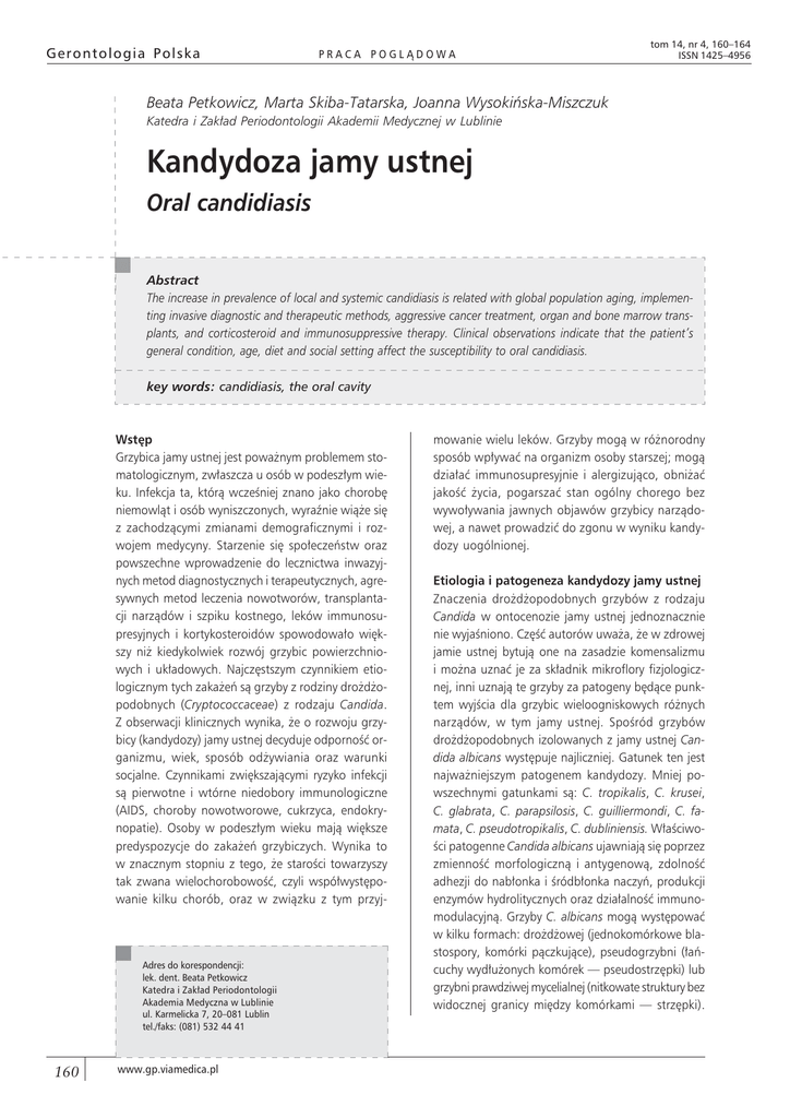 Gerontologia Polska PRACA POGLĄDOWA tom 14, nr 4, 160–164 ISSN 1425–4956 Beata Petkowicz, Marta Skiba-Tatarska, Joanna Wysokińska-Miszczuk Katedra i Zakład Periodontologii Akademii Medycznej w Lublinie Kandydoza jamy ustnej Oral candidiasis Abstract The increase in prevalence of local and systemic candidiasis is related with global population aging, implementing invasive diagnostic and therapeutic methods, aggressive cancer treatment, organ and bone marrow transplants, and corticosteroid and immunosuppressive therapy. Clinical observations indicate that the patient’s general condition, age, diet and social setting affect the susceptibility to oral candidiasis. key words: candidiasis, the oral cavity Wstęp Grzybica jamy ustnej jest poważnym problemem stomatologicznym, zwłaszcza u osób w podeszłym wieku. Infekcja ta, którą wcześniej znano jako chorobę niemowląt i osób wyniszczonych, wyraźnie wiąże się z zachodzącymi zmianami demograficznymi i rozwojem medycyny. Starzenie się społeczeństw oraz powszechne wprowadzenie do lecznictwa inwazyjnych metod diagnostycznych i terapeutycznych, agresywnych metod leczenia nowotworów, transplantacji narządów i szpiku kostnego, leków immunosupresyjnych i kortykosteroidów spowodowało większy niż kiedykolwiek rozwój grzybic powierzchniowych i układowych. Najczęstszym czynnikiem etiologicznym tych zakażeń są grzyby z rodziny drożdżopodobnych (Cryptococcaceae) z rodzaju Candida. Z obserwacji klinicznych wynika, że o rozwoju grzybicy (kandydozy) jamy ustnej decyduje odporność organizmu, wiek, sposób odżywiania oraz warunki socjalne. Czynnikami zwiększającymi ryzyko infekcji są pierwotne i wtórne niedobory immunologiczne (AIDS, choroby nowotworowe, cukrzyca, endokrynopatie). Osoby w podeszłym wieku mają większe predyspozycje do zakażeń grzybiczych. Wynika to w znacznym stopniu z tego, że starości towarzyszy tak zwana wielochorobowość, czyli współwystępowanie kilku chorób, oraz w związku z tym przyj- Adres do korespondencji: lek. dent. Beata Petkowicz Katedra i Zakład Periodontologii Akademia Medyczna w Lublinie ul. Karmelicka 7, 20–081 Lublin tel./faks: (081) 532 44 41 160 www.gp.viamedica.pl mowanie wielu leków. Grzyby mogą w różnorodny sposób wpływać na organizm osoby starszej; mogą działać immunosupresyjnie i alergizująco, obniżać jakość życia, pogarszać stan ogólny chorego bez wywoływania jawnych objawów grzybicy narządowej, a nawet prowadzić do zgonu w wyniku kandydozy uogólnionej. Etiologia i patogeneza kandydozy jamy ustnej Znaczenia drożdżopodobnych grzybów z rodzaju Candida w ontocenozie jamy ustnej jednoznacznie nie wyjaśniono. Część autorów uważa, że w zdrowej jamie ustnej bytują one na zasadzie komensalizmu i można uznać je za składnik mikroflory fizjologicznej, inni uznają te grzyby za patogeny będące punktem wyjścia dla grzybic wieloogniskowych różnych narządów, w tym jamy ustnej. Spośród grzybów drożdżopodobnych izolowanych z jamy ustnej Candida albicans występuje najliczniej. Gatunek ten jest najważniejszym patogenem kandydozy. Mniej powszechnymi gatunkami są: C. tropikalis, C. krusei, C. glabrata, C. parapsilosis, C. guilliermondi, C. famata, C. pseudotropikalis, C. dubliniensis. Właściwości patogenne Candida albicans ujawniają się poprzez zmienność morfologiczną i antygenową, zdolność adhezji do nabłonka i śródbłonka naczyń, produkcji enzymów hydrolitycznych oraz działalność immunomodulacyjną. Grzyby C. albicans mogą występować w kilku formach: drożdżowej (jednokomórkowe blastospory, komórki pączkujące), pseudogrzybni (łańcuchy wydłużonych komórek — pseudostrzępki) lub grzybni prawdziwej mycelialnej (nitkowate struktury bez widocznej granicy między komórkami — strzępki). Beata Petkowicz, Marta Skiba-Tatarska i wsp., Kandydoza jamy ustnej Mimo że od wielu lat prowadzone są badania nad inwazyjnością C. albicans, to nadal trudno rozstrzygnąć, w którym momencie jest to nosicielstwo, a w którym już inwazja, oraz od kiedy należy stosować profilaktykę przeciwgrzybiczą. Wiadomo, że czynniki warunkujące rozwój kandydozy wiążą się z właściwościami szczepu oraz obroną organizmu gospodarza. W rozwoju kandydozy ważna jest liczba komórek grzyba atakującego błonę śluzową i jego wirulencja, która zależy od zdolności namnażania, zjawiska przylegania (adherencji), produkcji enzymów oraz toksycznych metabolitów. Organizm człowieka jest wyposażony w liczne mechanizmy chroniące przed infekcjami grzybiczymi, takie jak: ciągłość nabłonka i jego złuszczanie, pH skóry i błon śluzowych, wydzielanie śliny, obecność saprofitycznych bakterii mogących współzawodniczyć o miejsce przyczepu na powierzchni komórki, a oprócz tego w immunologiczny system obrony: odporność komórkową, w mniejszym stopniu humoralną, sprawny system fagocytarny, układ siateczkowo-śródbłonkowy, czy też kompletny system dopełniacza. Wzajemne oddziaływanie między grzybem a organizmem gospodarza jest układem dynamicznym. Kolonizacja niszy jamy ustnej przez grzyb rozpoczyna się od pokonania lokalnych warunków środowiskowych (ciągłość śluzówki), mechanizmów oczyszczających jamę ustną (ślina, odruch kaszlowy), aż do uzyskania kolonizacji powierzchownej. Przejście kolonizacji w infekcję następuje wówczas, gdy dochodzi do penetracji tkankowej przez grzyb. Procesowi temu służy wydzielanie przez grzyb enzymów oraz tworzenie strzępek. Czynnikami predysponującymi do zakażeń grzybami są między innymi utrata integralności błon śluzowych, cienki lub owrzodziały nabłonek jako rezultat źle dopasowanych protez, redukcja przepływu śliny, cukrzyca, niedobór żelaza i kwasu foliowego, immunosupresja lub leki (tab. 1). Zaburzenie równowagi między oczyszczaniem, kolonizacją i inwazją jest przyczyną występowania nawracającej i trudnej do wyleczenia