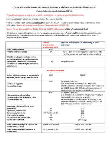 Porównanie standardowego ubezpieczenia szkolnego w szkole mojego syna z ofertą bezpieczny.pl Plus dodatkowe wsparcie Asekuracji24h.pl. Wszystkie propozycje są ważne rok w szkole i poza szkołą i są na równi ważne z NNW szkolnym. Sam zdecyduj gdzie otrzymasz większą ochronę dla swojego dziecka. Strona do ubezpieczeń www.bezpieczny.pl kod opiekuna: 01221 – wpisz na stronie bezpieczny.pl gdy chcesz mieć 10% zniżki. Numer telefonu opiekuna Tomasz Kołowrotkiewicz 533 670 281 Numer Tel. do Asekuracji24h.pl 22 122 80 72 lub 511 007 618 adres email [email protected] Oświadczam, że portal Bezpieczny.pl nie ma podpisanej żadnej umowy z Asekuracją24h.pl Jest to nasza dobrowolna akacja informacyjna i przedstawienie propozycji ubezpieczeniowej dla dzieci, która naszym zdaniem jest jedną z lepszych na rynku polskim. Suma Ubezpieczenia Składka roczna na osobę Składka na ubezpieczenie za osobę uprawiającą sporty wysokiego ryzyka: sporty wali, piłka nożna, siatkówka, koszykówka, lekkoatletyka, pływanie, jazda konna Szkolne proponowane w większości szkół 9000 37 47 Przykład ubezpieczenia w Bezpieczny.pl NNW szkolnego 24 000 42 zł – 10% za rejestrację przez Internet = 37,80 zniżka pokaże się po wpisaniu kodu opiekuna W cenie składki Wysokość świadczeń Śmierć Ubezpieczonego w następstwie wypadku, udaru mózgu, zawału serca 9000 20 000 2000 9000 24 000 z Bezpieczny, plus dodatkowe świadczenia dla większości członków rodziny zmarłego ze strony Asekuracja24h od 10 000 do ok. 400 000 . (kwoty uzależnione od okoliczności) plus wsparcie psychologa. 20 000 z Bezpieczny, plus dodatkowe świadczenia z Asekuracji24h.pl jeśli uszczerbek miał miejsce w wypadku samochodowym, autokarowym, poślizgnięciu na chodniku lub boisku szkolnym ( kwoty od 2000 do 150 000 uzależnione od okoliczności) 90 90 100 PLN/max3 dni 90 Brak 90 200 200 200 200 200 200 za ząb 20 PLN max 120 dni 30 PLN max 180 dni 20 PLN max 10 dni 30 PLN max 180 dni Śmierć w wypadku komunikacyjnym Uszczerbek na zdrowiu lub uszkodzenie ciała w NNW za 100% uszkodzenia ciała Stawka za 1% uszczerbku w tym: Rany skóry Oparzenia, odmrożenia Złamania, zwichnięcia Wstrząśnięcia mózgu Uszkodzenia słuchu i wzroku Utrata zębów stałych. Pobyt ubezpieczonego w szpitalu na skutek NNW za dzień Pobyt ubezpieczonego na OIOM w skutek NNW Pobyt w szpitalu skutek zatrucia pokarmowego 20 PLN max 10 dni 30 PLN max 180 dni Zwrot kosztów nabycia, napraw protez i środków pomocniczych w skutek NNW 1250 Zwrot kosztów leczenie i rehabilitacji, których nie pokrywa NFZ 1250 2000 Wystąpienie poważnego zachorowania : nowotwór złośliwy z białaczkami i chłoniakami, niewydolność nerek, wątroby, cukrzyca, dystrofia mięśniowa, guzy śródczaszkowe, śpiączka, sepsa, choroba pneumokokowi, zapalenieopon mózgowych( zwłaszcza po ugryzieniu kleszcza) Brak 1000 Śmierć rodzica lub opiekuna, jednorazowe świadczenie dla dziecka 2700 2500 PLN od bezpieczni.pl plus sprzęt rehabilitacyjny bez angażowania własnych środków, w przypadku wypadku komunikacyjnego uzależnione od okoliczności. Do 100 000 zł 2000 PLN z bezpieczni.pl plus w Asekuracji24.pl w przypadku śmierci nie ze swojej winy w wypadku komunikacyjnym w pojazdach, na rowerze, jako pieszy do kwoty ok. 200 000 zł + plus renta. Kwoty uzależnione są od okoliczności. Poniższe wsparcie Asekuracji24h.pl otrzymujesz po przesłaniu na adres email [email protected] polisy nnw dla dziecka lub dzieci. Dla zainteresowanych rodzin możliwość wzięcia udziału w programie partnerskim związanym z gratyfikacjami finansowymi na: rehabilitację, leczenia związanymi z chorobami w rodzinie, dopłat do czynszów, spłatach kredytów. Zgłoszenia do programu partnerskiego przyjmujemy na [email protected] Od zgłoszenia w ciągu 24 h skontaktuje się z państwem wyznaczony opiekun i doradca. Bezpłatne Auto zastępcze w razie poszkodowanego rodzica lub opiekuna w wypadku lub kolizji. Na dojazdy do pracy, lekarza, rehabilitację dzieci lub poszkodowanych członków rodziny. Brak Tu pomoc w tym zakresie udzielana jest ze strony Asekruacja24h.pl dodatkowo za każde zamówione auto dla siebie lub znajomego otrzymujesz 50 zł bon na każde paliwo na terenie Polski Bezpłatny sprzęt rehabilitacyjny po następstwach NNW Komunikacyjnych dla ubezpieczonego dziecka i całej jego rodziny. Asekuracja24h. – całodobowe wsparcie prawne na wypadek NNW Dziecka i Całej jego rodziny wraz z opiekunami prawnymi. Wsparcie ze strony fundacji w zakresie profilaktyki przeciwnowotworowej dzieci i dorosłych oraz po wypadkach komunikacyjnych, na rowerze, na chodniku, na nieodśnieżonych placach szkolnych. Brak Tu pomoc w tym zakresie udzielana jest ze strony Asekuracja24h.pl i uzależniona jest od okoliczności. Brak Pomoc ze strony Asekuracja24h.pl Brak Pomoc ze strony Asekuracja24h.pl
