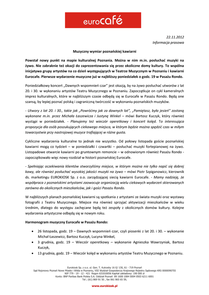 22.11.2012 Informacja prasowa Muzyczny wymiar poznańskiej kawiarni Powstał nowy punkt na mapie kulturalnej Poznania. Można w nim m.in. posłuchać muzyki na żywo. Nie zabraknie też okazji do zaprezentowania się przez okoliczne domy kultury. To wspólna inicjatywa grupy artystów na co dzień występujących w Teatrze Muzycznym w Poznaniu i kawiarni Eurocafe. Pierwsze wydarzenie muzyczne już w najbliższy poniedziałek o godz. 19 w Pasażu Rondo. Poniedziałkowy koncert „Dawnych wspomnień czar” jest okazją, by na żywo posłuchać utworów z lat 20. i 30. w wykonaniu artystów Teatru Muzycznego w Poznaniu. Zapoczątkuje on cykl kameralnych imprez kulturalnych, które w najbliższym czasie odbędą się w Eurocafe w Pasażu Rondo. Będą one szansą, by lepiej poznać polską i zagraniczną twórczość w wykonaniu poznańskich muzyków. - Utwory z lat 20. i 30., takie jak „Powróćmy jak za dawnych lat”, „Pamiętasz, była jesień” zostaną wykonane m.in. przez Michała Łaszewicza i Justynę Winkel – mówi Bartosz Kuczyk, który również wystąpi w poniedziałek. - Planujemy też wieczór operetkowy i koncert kolęd. To interesująca propozycja dla osób poszukujących ciekawego miejsca, w którym będzie można spędzić czas w miłym towarzystwie przy nastrojowej muzyce trafiającej w różne gusta. Cykliczne wydarzenia kulturalne to jednak nie wszystko. Od połowy listopada goście poznańskiej kawiarni mogą co tydzień – w poniedziałki i czwartki – posłuchać muzyki fortepianowej na żywo. Listopadowe otwarcie kawiarni po gruntownym remoncie – w odnowionym również Pasażu Rondo zapoczątkowało więc nowy rozdział w historii poznańskiej Eurocafe. - Spełniając oczekiwania klientów stworzyliśmy miejsce, w którym można nie tylko napić się dobrej kawy, ale również posłuchać wysokiej jakości muzyki na żywo – mówi Piotr Szpiganowicz, kierownik ds. marketingu EUROKIOSK Sp. z o.o. zarządzającej siecią kawiarni Eurocafe. - Mamy nadzieję, że współpraca z poznańskimi artystami zaowocuje organizacją wielu ciekawych wydarzeń skierowanych zarówno do okolicznych mieszkańców, jak i gości Pasażu Rondo. W najbliższych planach poznańskiej kawiarni są spotkania z artystami ze świata muzyki oraz wystawy fotografii z Teatru Muzycznego. Miejsce ma również sprzyjać aktywizacji mieszkańców w wieku średnim, dlatego do występu zachęcane będą też zespoły z okolicznych domów kultury. Kolejne wydarzenia artystyczne odbędą się w nowym roku. Harmonogram muzyczny Eurocafe w Pasażu Rondo: 26 listopada, godz. 19 – Dawnych wspomnień czar, czyli piosenki z lat 20. i 30. – wykonanie Michał Łaszewicz, Bartosz Kuczyk, Lucyna Winkel, 3 grudnia, godz. 19 – Wieczór operetkowy – wykonanie Agnieszka Wawrzyniak, Bartosz Kuczyk, 13 grudnia, godz. 19 – Wieczór kolęd w wykonaniu artystów Teatru Muzycznego w Poznaniu. Eurokiosk Sp. z o.o. ul. Gen. T. Kutrzeby 16 G/ 130, 61 - 719 Poznań Sąd Rejonowy Poznań Nowe Miasto i Wilda w Poznaniu, VIII Wydział Gospodarczy Krajowego Rejestru Sądowego KRS 0000090755 NIP 779 - 19 - 12 - 421 Regon 631010056 Kapitał zakładowy: 190 000 zł Konto: BNP Paribas Bank Polska S.A. Oddział Poznań 89 1600 1084 0004 0503 6211 6001 Tel ; (61) 869 91 50 , fax 061 865 65 59, www.eurokiosk.pl Informacje dodatkowe: Eurocafe to sieć nowoczesnych i komfortowych kawiarni opartych na systemie franczyzy, które wraz z markami EURO – SALON Prasowy i Eurosnack są zarządzane przez EUROKIOSK Sp. z o.o. z siedzibą w Poznaniu. Charakteryzuje je kawa wysokiej jakości w wielu odmianach, a także różnorodna oferta odpowiadająca gustom klientów i uwzględniająca lokalnych dostawców. Eurocafe to również jakość i szybkość obsługi, atrakcyjne ceny i programy lojalnościowe oraz nowoczesny i komfortowy wystrój wnętrz. Oprócz Poznania, kawiarnie działają także w Otwocku i Szczecinie. Wkrótce planowane są otwarcia w kolejnych lokalizacjach. Więcej informacji o systemie franczyzy na stronie http://www.euro-cafe.pl. Poznańską Eurocafe znaleźć można też na Facebooku http://www.facebook.com/EurocafePoznan. Dodatkowych informacji udzielają: Beata Grześkowiak Prelite Public Relations tel. kom.: 601 065 576 tel.: 61 855 14 55 email: [email protected] Piotr Szpiganowicz Kierownik ds. Marketingu EUROKIOSK Sp. z o.o. tel. kom.: 608 667 961 tel.: 61 662 60 32 w. 26 email: [email protected] Eurokiosk Sp. z o.o. ul. Gen. T. Kutrzeby 16 G/ 130, 61 - 719 Poznań Sąd Rejonowy Poznań Nowe Miasto i Wilda w Poznaniu, VIII Wydział Gospodarczy Krajowego Rejestru Sądowego KRS 0000090755 NIP 779 - 19 - 12 - 421 Regon 631010056 Kapitał zakładowy: 190 000 zł Konto: BNP Paribas Bank Polska S.A. Oddział Poznań 89 1600 1084 0004 0503 6211 6001 Tel ; (61) 869 91 50 , fax 061 865 65 59, www.eurokiosk.pl