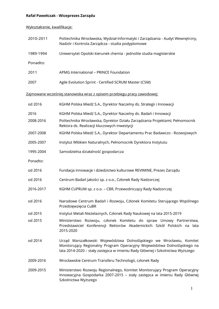 Rafał Pawełczak - Wiceprezes Zarządu Wykształcenie, kwalifikacje: 2010-2011 Politechnika Wrocławska, Wydział Informatyki i Zarządzania - Audyt Wewnętrzny, Nadzór i Kontrola Zarządcza - studia podyplomowe 1989-1994 Uniwersytet Opolski kierunek chemia - jednolite studia magisterskie Ponadto: 2011 APMG International – PRINCE Foundation 2007 Agile Evolution Sprint - Certified SCRUM Master (CSM) Zajmowane wcześniej stanowiska wraz z opisem przebiegu pracy zawodowej: od 2016 KGHM Polska Miedź S.A., Dyrektor Naczelny ds. Strategii i Innowacji 2016 KGHM Polska Miedź S.A., Dyrektor Naczelny ds. Badań i Innowacji 2008-2016 Politechnika Wrocławska, Dyrektor Działu Zarządzania Projektami; Pełnomocnik Rektora ds. Realizacji kluczowych inwestycji 2007-2008 KGHM Polska Miedź S.A., Dyrektor Departamentu Prac Badawczo - Rozwojowych 2005-2007 Instytut Włókien Naturalnych, Pełnomocnik Dyrektora Instytutu 1995-2004 Samodzielna działalność gospodarcza Ponadto: od 2016 Fundacja innowacje i dziedzictwo kulturowe REVIMINE, Prezes Zarządu od 2016 Centrum Badań Jakości sp. z o.o., Członek Rady Nadzorczej 2016-2017 KGHM CUPRUM sp. z o.o. – CBR, Przewodniczący Rady Nadzorczej od 2016 Narodowe Centrum Badań i Rozwoju, Członek Komitetu Sterującego Wspólnego Przedsięwzięcia CuBR od 2015 Instytut Metali Nieżelaznych, Członek Rady Naukowej na lata 2015-2019 od 2015 Ministerstwo Rozwoju, członek Komitetu do spraw Umowy Partnerstwa, Przedstawiciel Konferencji Rektorów Akademickich Szkół Polskich na lata 2015-2020 od 2014 Urząd Marszałkowski Województwa Dolnośląskiego we Wrocławiu, Komitet Monitorujący Regionalny Program Operacyjny Województwa Dolnośląskiego na lata 2014-2020 – stały zastępca w imieniu Rady Głównej i Szkolnictwa Wyższego 2009-2016 Wrocławskie Centrum Transferu Technologii, członek Rady 2009-2015 Ministerstwo Rozwoju Regionalnego, Komitet Monitorujący Program Operacyjny Innowacyjna Gospodarka 2007-2015 – stały zastępca w imieniu Rady Głównej Szkolnictwa Wyższego 1 W latach 2008-2015 członek zespołów roboczych Ministerstwa Gospodarki, Ministerstwa Rozwoju Regionalnego, Ministerstwa Nauki i Szkolnictwa Wyższego, Narodowego Centrum Badań i Rozwoju, Ośrodka Przetwarzania Informacji, Konferencji Rektorów Akademickich Szkół Polskich, Krajowego Punktu Kontaktowego. Obecnie przedstawiciel KGHM Polska Miedź S.A. w organizacjach krajowych i zagranicznych (The European Innovation Partnership on Raw Materials; ElT RawMaterials; Polska Izba Gospodarcza Zaawansowanych Technologii). Powołany Członek Zarządu nie wykonuje działalności konkurencyjnej wobec działalności przedsiębiorstwa KGHM Polska Miedź S.A., nie uczestniczy w spółce konkurencyjnej wobec KGHM Polska Miedź S.A. jako wspólnik spółki cywilnej, spółki osobowej lub jako członek organu spółki kapitałowej oraz nie uczestniczy w innej konkurencyjnej osobie prawnej jako członek jej organów, jak również nie figuruje w Rejestrze Dłużników Niewypłacalnych prowadzonym na podstawie ustawy o Krajowym Rejestrze Sądowym. Podstawa prawna: § 5 ust. 1 pkt 22 Rozporządzenia Ministra Finansów z dnia 19 lutego 2009 roku w sprawie informacji bieżących i okresowych przekazywanych przez emitentów papierów wartościowych oraz warunków uznawania za równoważne informacji wymaganych przepisami prawa państwa niebędącego państwem członkowskim (Dz. U. 2009 nr 33 poz. 259 z późn. zm.). 2