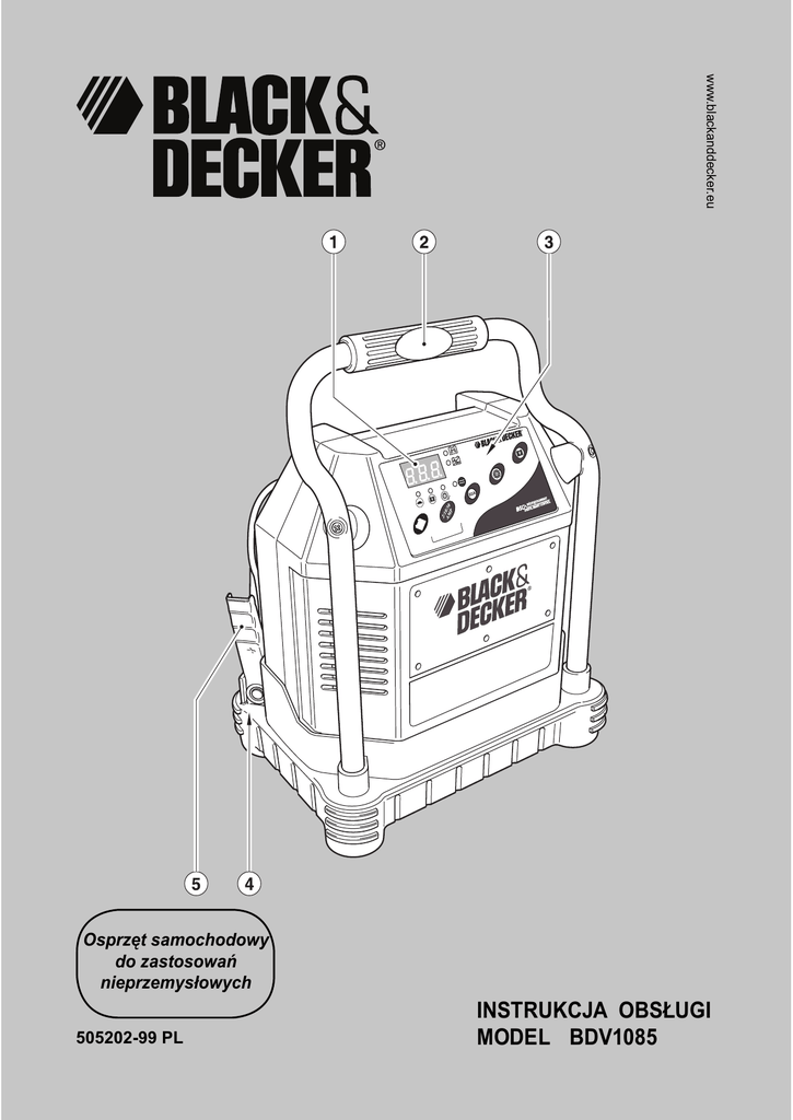 www.blackanddecker.eu Osprzęt samochodowy do zastosowań nieprzemysłowych 505202-99 PL INSTRUKCJA OBSŁUGI MODEL BDV1085 2 POLSKI Bezpieczne korzystanie z kabla sieciowego Uwaga! Nie dokonuj żadnych przeróbek w kablu ani we wtyczce. Gdyby wtyczka nie pasowała do gniazda, zwróć się w tej sprawie do wykwalifikowanego specjalisty elektryka. Nieprawidłowe podłączenie grozi porażeniem prądem elektrycznym. Zastosowanie zgodne z przeznaczeniem Ładowarka Black & Decker jest przeznaczona do ładowania akumulatorów kwasowo-ołowiowych. Urządzenie to nie nadaje się do celów przemysłowych. Wskazówki dotyczące bezpieczeństwa Specjalne wskazówki bezpieczeństwa pracy ładowarek Ładowarka ta musi być uziemiona. Zawsze sprawdzaj, czy napięcie sieciowe jest zgodne z wartością podaną na tabliczce znamionowej ładowarki. Uwaga! Przy korzystaniu z urządzeń sieciowych dokładnie przestrzegaj wskazówek zawartych w tej instrukcji i podstawowych przepisów bhp, by zminimalizować ryzyko pożaru, porażenia prądem elektrycznym, czy też doznania urazu ciała i szkód rzeczowych. • Przed pierwszym użyciem przyrządu dokładnie przeczytaj niniejszą instrukcję. • W instrukcji tej opisano zastosowanie przyrządu zgodne z przeznaczeniem. Używanie akcesoriów lub przystawek innych, niż zalecane w tej instrukcji, lub obsługiwanie przyrządu w sposób niezgodny z opisem grozi doznaniem urazu. • Przechowuj niniejszą instrukcję na wypadek, gdyby znów była kiedyś potrzebna. Wtyczka sieciowa ładowarki musi pasować do gniazda wtykowego. Nie wolno jej przerabiać. Do uziemionych urządzeń (klasy 1) nie należy używać żadnych przejściówek. Oryginalne wtyczki i pasujące gniazda wtykowe minimalizują ryzyko prażenia prądem elektrycznym. Przedłużacze i produkty klasy 1 • Gdy urządzenie jest uziemione i odpowiada klasie 1, niezbędny jest 3-żyłowy kabel. • Kabel długości do 30 m nie powoduje zauważalnego spadku mocy. Przed użyciem ładowarki przeczytaj instrukcję obsługi. • W razie uszkodzenia kabla sieciowego zleć jego wymianę producentowi lub autoryzowanemu warsztatowi serwisowemu Black & Decker, by nie narażać się na niebezpieczeństwo porażenia prądem elektrycznym. • W żadnym przypadku nie próbuj ładować baterii. • Uszkodzony kabel natychmiast wymień na nowy. • Uważaj, by do ładowarki nie dostała się woda. • Nie próbuj otwierać obudowy ładowarki. Nie dokonuj w ładowarce żadnych przeróbek. • • Uważaj, by nie zewrzeć czerwonego i czarnego zacisku szczękowego (5) i by nie przytknąć ich jednocześnie do tego samego metalowego przewodnika. Może to spowodować uszkodzenie przyrządu lub wybuch na skutek zaiskrzenia. • Zaciski szczękowe (5) zawsze pozostawiaj w zintegrowanych uchwytach. Zastosowanie ładowarki Z przyrządem tym zawsze obchodź się ostrożnie. • Zabrania się używania przyrządu przez dzieci lub osoby niepełnosprawne bez należytego nadzoru. • Przyrząd nie jest zabawką. • Używaj przyrządu tylko w suchym otoczeniu. Uważaj, by go nie zamoczyć. • Nie zanurzaj przyrządu w wodzie. • Nie próbuj otwierać obudowy. W jej wnętrzu nie ma żadnych elementów podlegających konserwacji. • Nie używaj przyrządu w otoczeniu zagrożonym wybuchem, w którym znajdują się palne ciecze, gazy lub pyły. • Nigdy nie ciągnij za kabel, by wyjąć wtyczkę z gniazda sieciowego. Grozi to uszkodzeniem kabla i wtyczki. Po użyciu • Nieużywany przyrząd przechowuj w suchym, dobrze wentylowanym miejscu poza zasięgiem dzieci. • Uniemożliw dzieciom dostęp do przechowywanych urządzeń. • Przy transportowaniu przyrządu w samochodzie umieść go w bagażniku lub odpowiednim schowku, by nie mógł się przemieścić w razie nagłej zmiany prędkości lub kierunku ruchu. Akumulatory Uwaga! W żadnym przypadku nie próbuj ładować zamarzniętego akumulatora. • W ekstremalnych warunkach pracy akumulatory mogą stać się nieszczelne. W razie zauważenia wycieku elektrolitu ostrożnie zbierz go szmatą. Unikaj kontaktu ze skórą. • Gdyby jednak elektrolit prysnął na skórę lub w oczy, zastosuj się do następującej porady: Uwaga! Elektrolit stanowi roztwór kwasu siarkowego, który jest szkodliwy dla zdrowia i innych przedmiotów. Gdyby środek ten zetknął się ze skórą, natychmiast obficie spłucz ją wodą. W razie zaczerwienienia, podrażnienia lub innych niepokojących objawów zgłoś się do lekarza. Gdyby roztwór prysnął w oczy, natychmiast przepłucz je dużą ilością wody i niezwłocznie udaj się do lekarza. Kontrola i naprawy • Przed użyciem przyrządu sprawdź, czy nie zawiera on jakichś uszkodzonych elementów lub czy nie wystąpiły jakieś inne okoliczności, które mogą negatywnie wpłynąć na działanie urządzenia. • Nie używaj przyrządu, gdy jakaś jego część jest niesprawna. • W razie uszkodzenia jakiejś części zleć jej naprawę lub wymianę jednemu z naszych autoryzowanych warsztatów serwisowych. • Nie wymieniaj ani nie usuwaj żadnych części nieopisanych w tej instrukcji. 3 Uwaga! W czasie ładowania z akumulatorów kwasowoołowiowych może wydzielać się wybuchowy gaz. Zapewnij wystarczającą wentylację i wyeliminuj możliwe źródła zapłonu. • Ładowarkę umieść możliwie jak najdalej od akumulatora. Ładowarka zawiera wyłącznik, który może zaiskrzyć. • Nie stawiaj ładowarki na ani nad akumulatorem. • Wybuchowe gazy mogą się gromadzić w pobliżu podłogi. Ustaw ładowarkę możliwie jak najwyżej nad podłogą. • W obszarze ładowania nie używaj żadnych elektrycznych urządzeń. • W obszarze ładowania nie posługuj się otwartym ogniem ani nie pal. • Przy przyłączaniu i odłączaniu kabli od ładowarki i biegunów akumulatora przestrzegaj odnośnej instrukcji. • Przy utylizacji akumulatorów przestrzegaj wskazówek podanych w punkcie „Ochrona środowiska”. • Do każdego ogniwa wlej wodę de